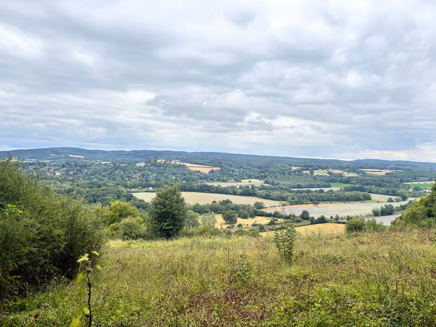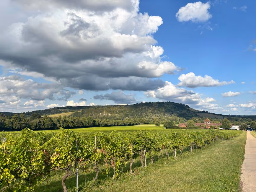 Samstag dann, Abenteuerzeit! Ich habe mich auf eine kleine Wanderung nach Box Hill begeben. Ja, das Wetter war typisch britisch, nennen wir es „dynamisch“. Aber mit Regenjacke bewaffnet und guter Laune im Gepäck ging’s durch Weinfelder und hinauf zu einem traumhaften Ausblick ins Tal. Und siehe da: Zum Abschluss hat sogar die Sonne nochmal „Hallo“ gesagt. ☀️