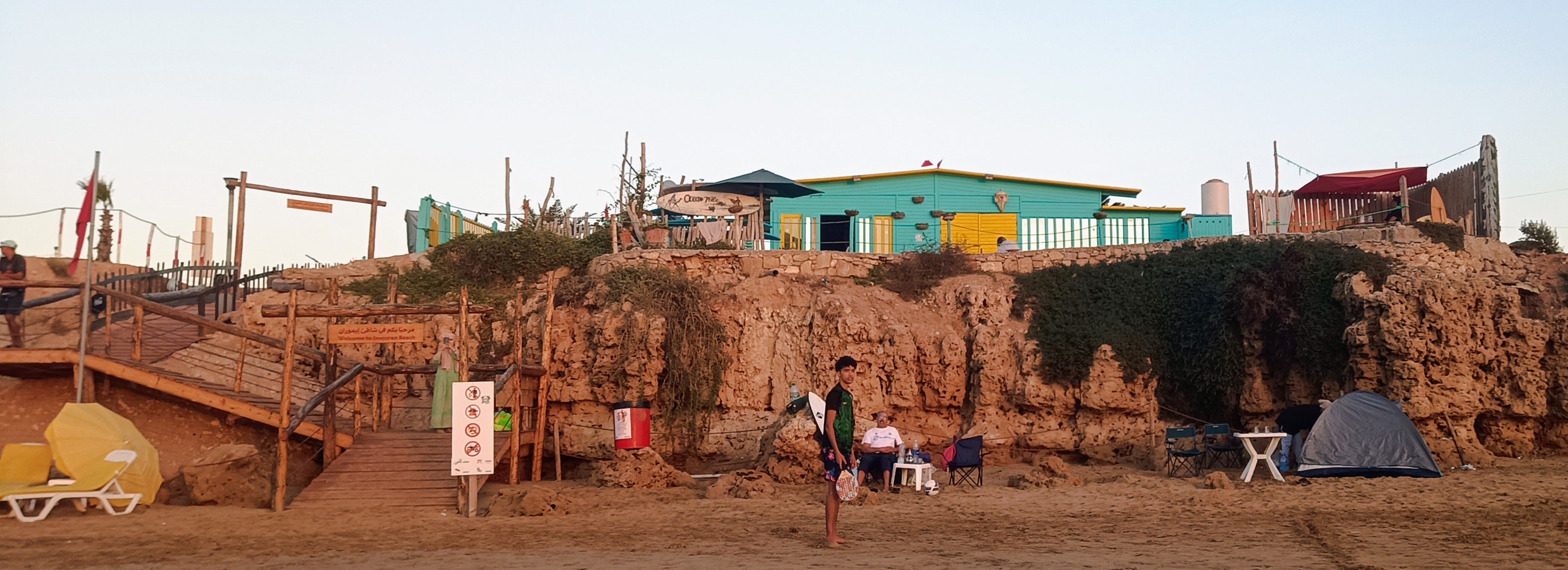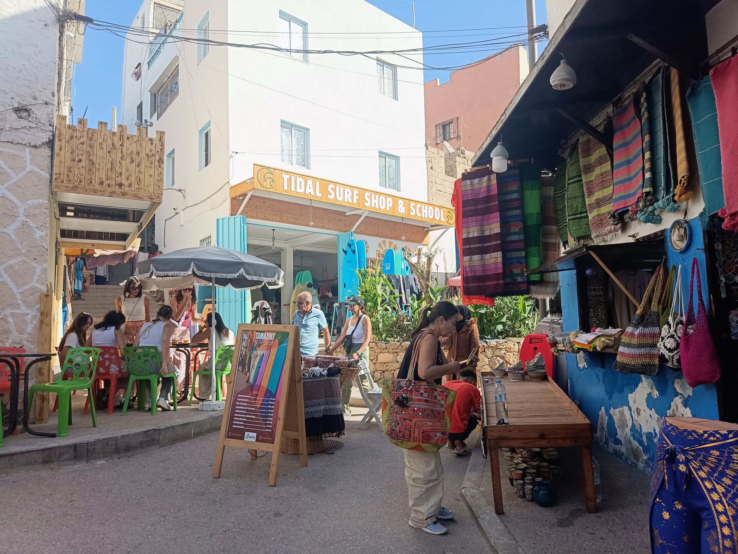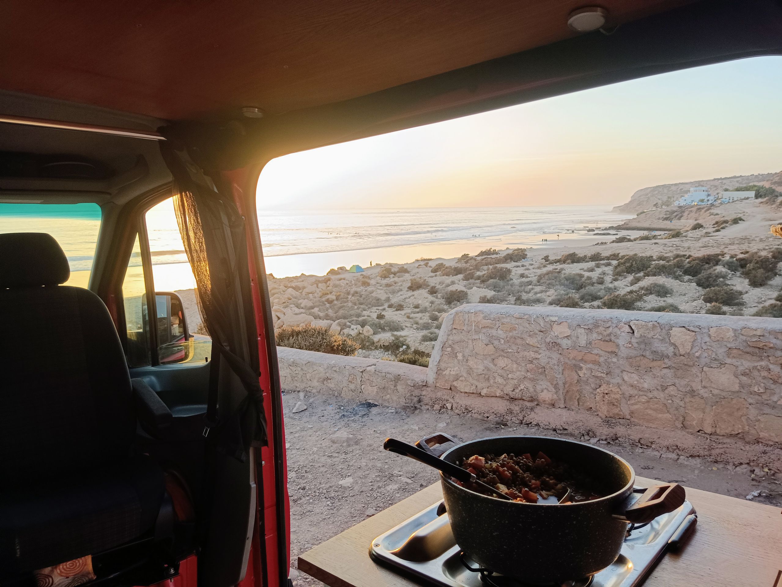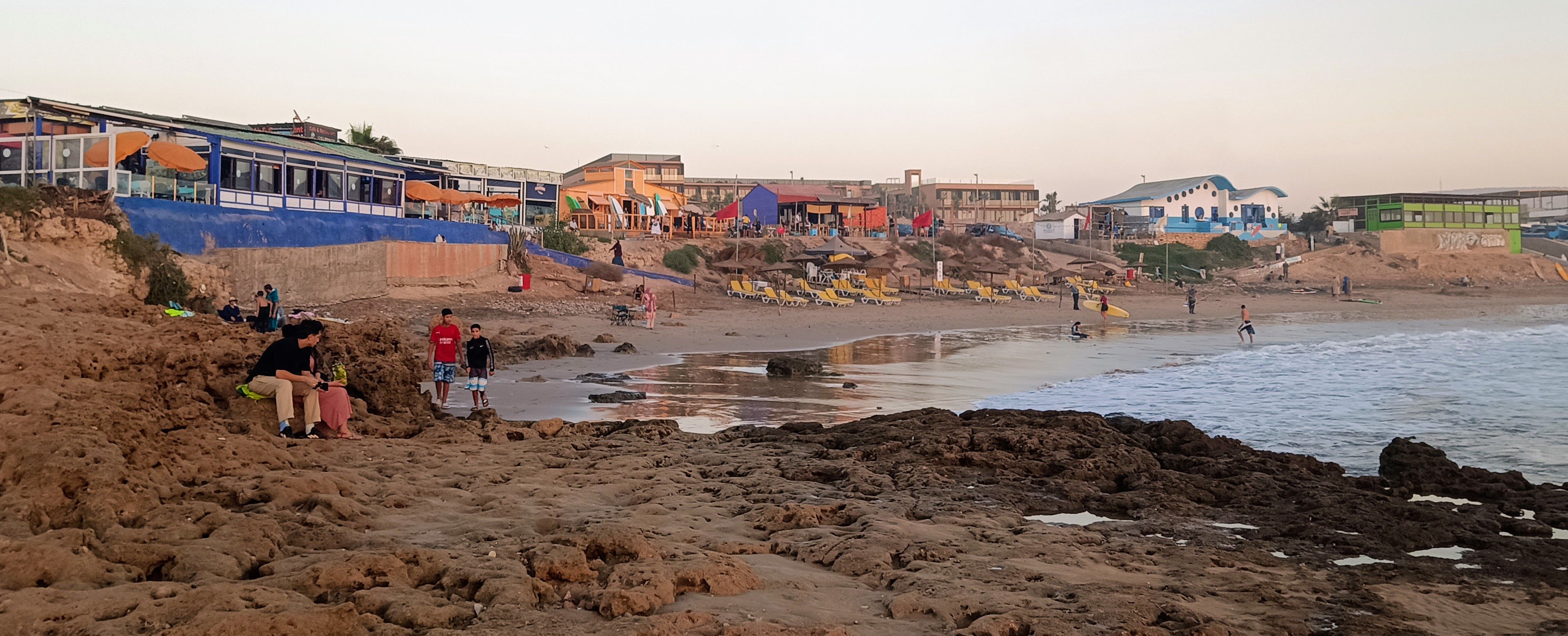 Einen Ort weiter ist es ruhiger. Tamraght. Hier fahren wir uns nicht mehr gegen die Bretter. Ich kann entspannter üben und meinen eigenen Takt finden. Ohne Schule. Frauen kochen Muscheln am Strand. Beim Sonnenuntergang eine wunderbare Stimmung. Surferbars und Restaurants leuchten in bunten Farben.