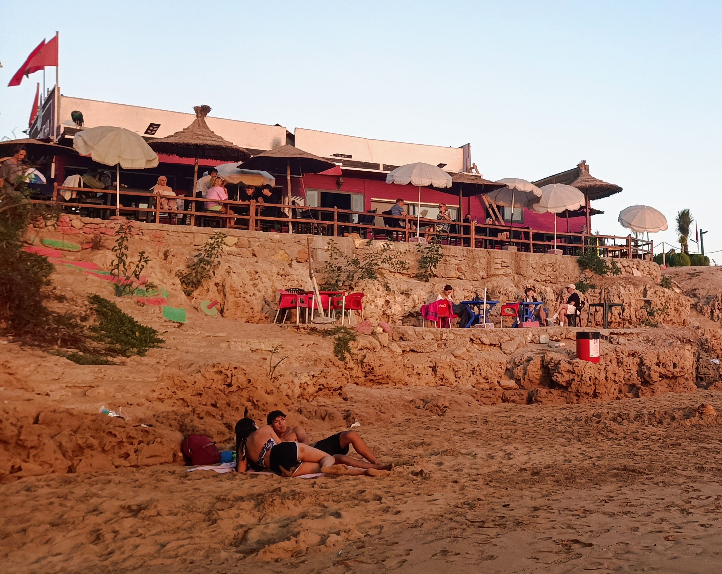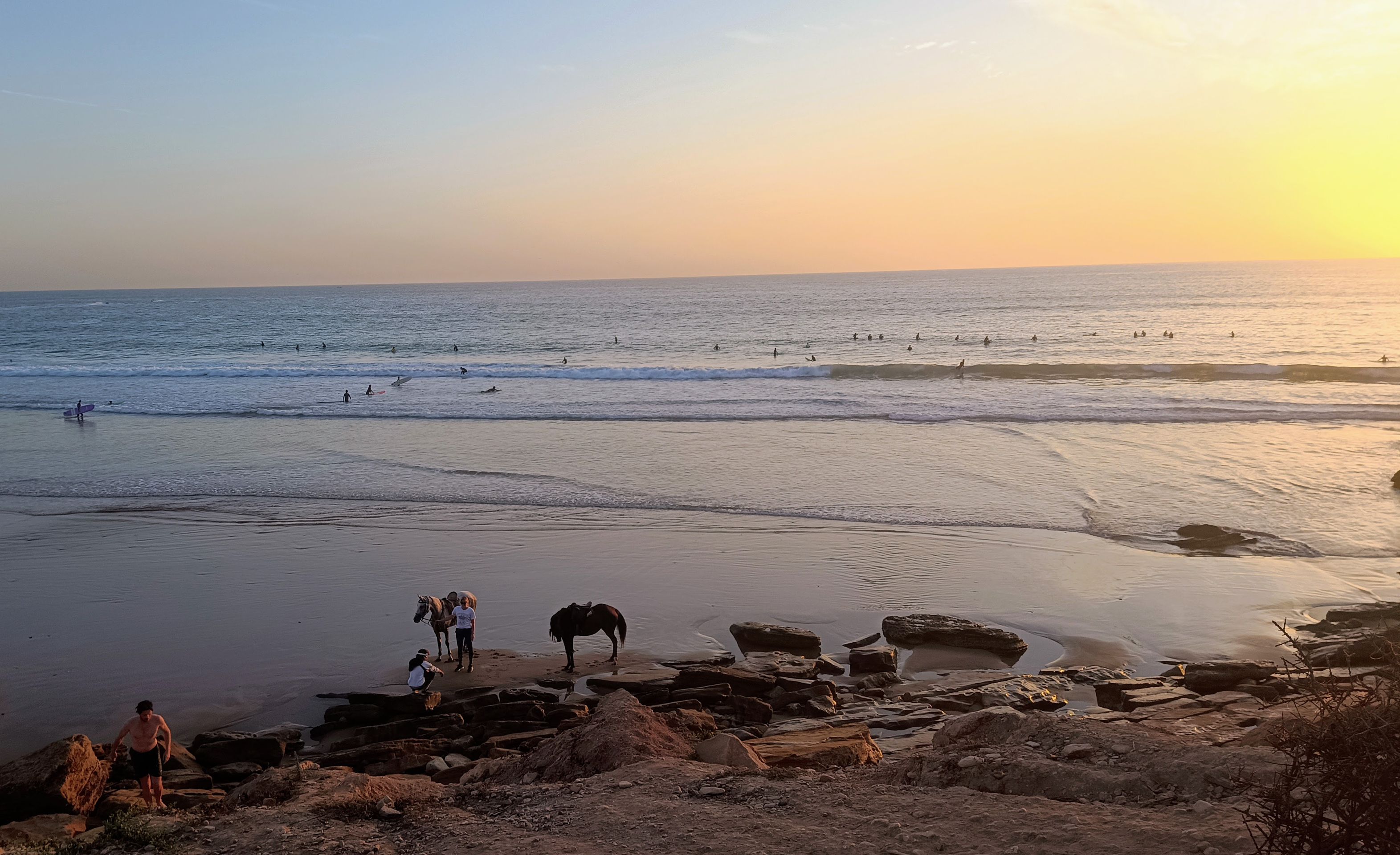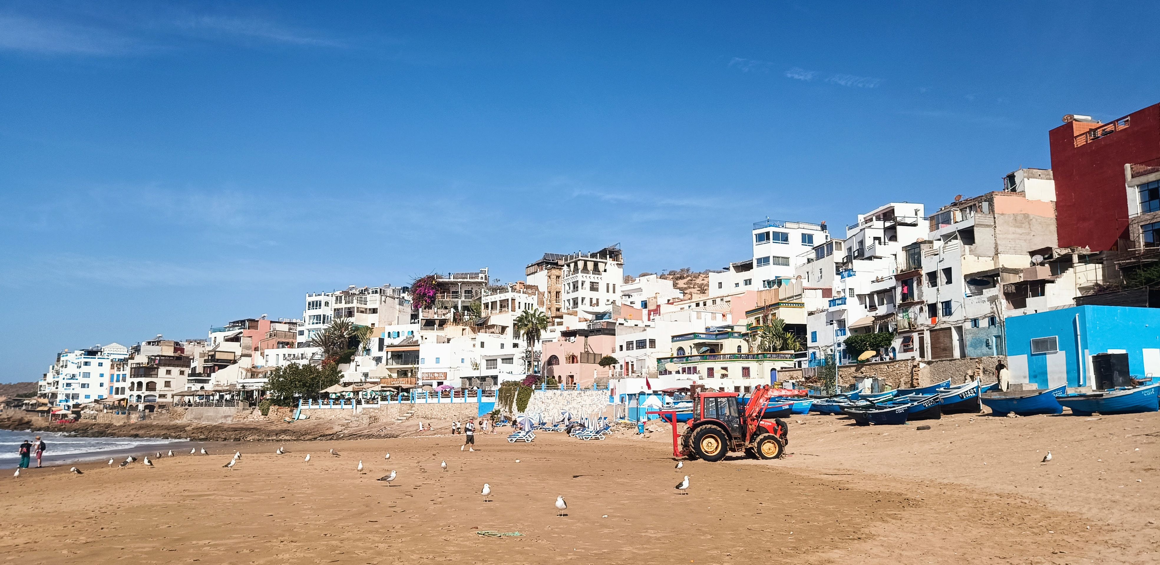 Es ist Nationalfeiertag. Schulkinder laufen mit Flagge durch die Stadt. Familien picknicken und kochen Tajine am Strand. Surferinnen im Bikini. Muslimische Frauen in langen Badekleidern. Beten am Strand. Diese Bilder wirken harmonisch. Frage mich, wie die nackte Haut auf Einheimische wirkt. Vielleicht alltäglich, weil hier schon seit den siebzigern gesurft wird.