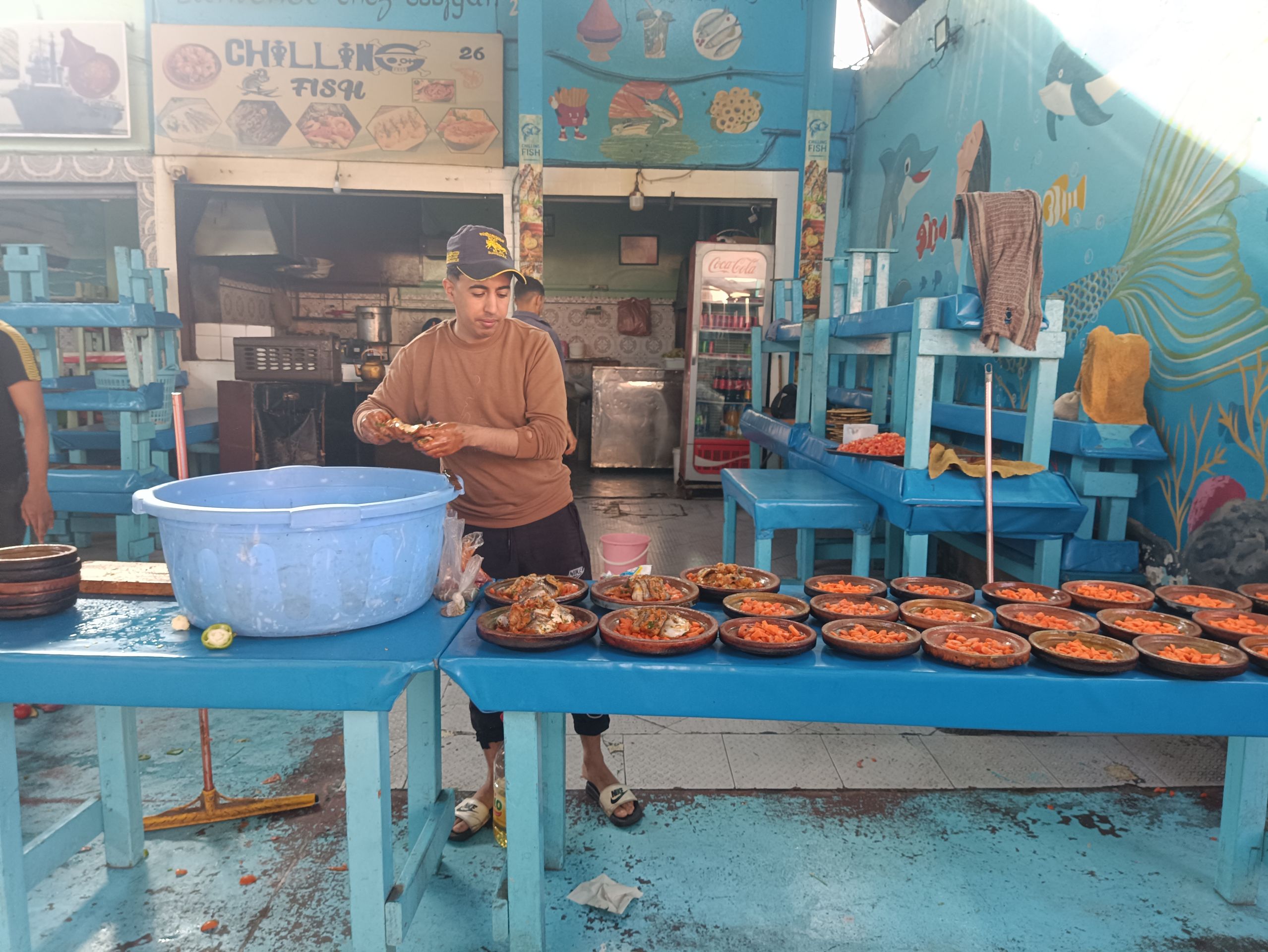 Abends sitze ich mit Luisa vom Toubkal und ihrer Freundin beim Essen. Dort, wo auch die Einheimischen hingehen. Unauffällig, einfach und richtig gut. Fleisch und frischer Fangfisch werden offen gegrillt, hohe Rauchschwaden umgeben uns. Katzen und Hunde betteln um die Reste. Es sieht schmutzig aus. Mein Bauch hat’s vertragen.