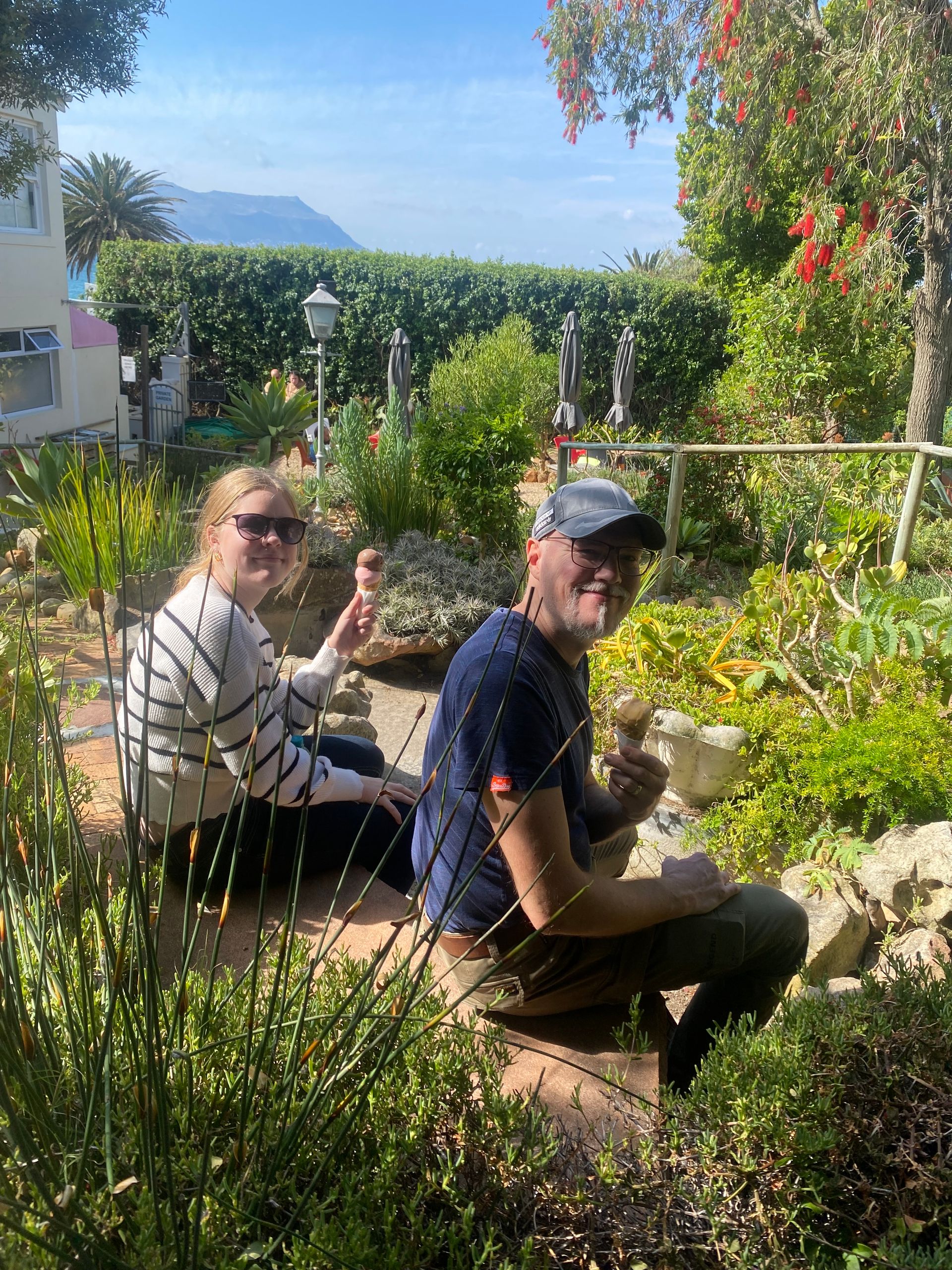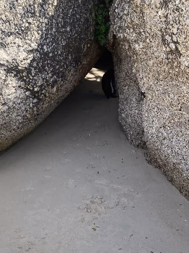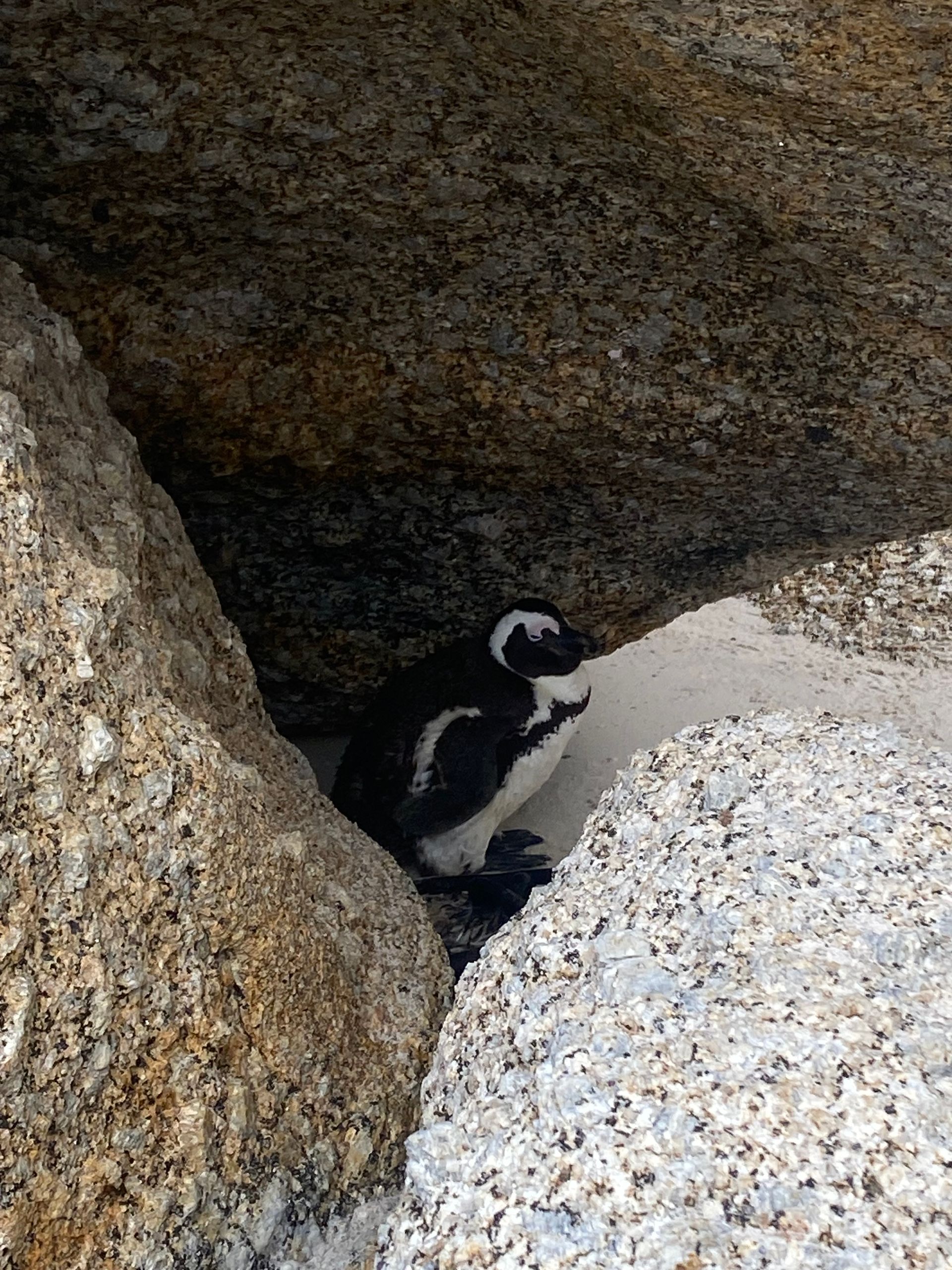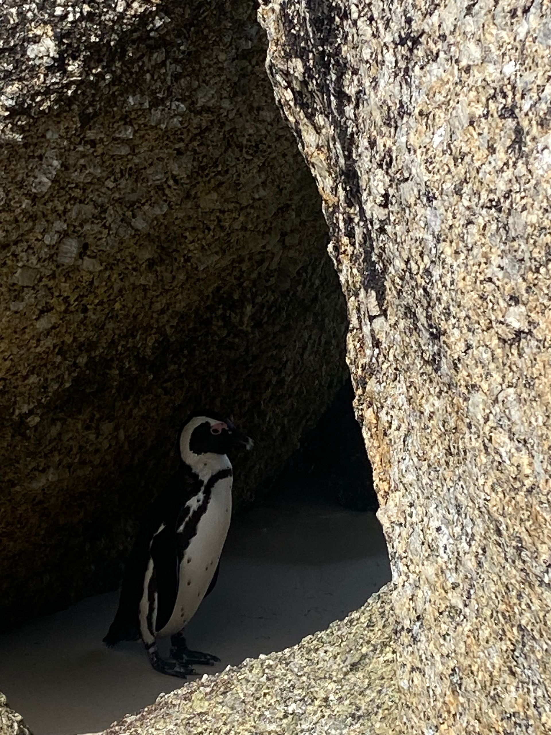 Nach dem wundervollen Frühstück ging es nach Boulders Beach. Der Tafelberg war wolkenverhangen und dichter Nebel umschloss den Berg, daher entschieden wir uns die Pinguine zu besuchen. Hier angekommen, erwartete uns die Sonne. Christian und die Mädels haben erstmal das Wasser getestet. Bbrrr, für mich eindeutig zu kalt 🥶.