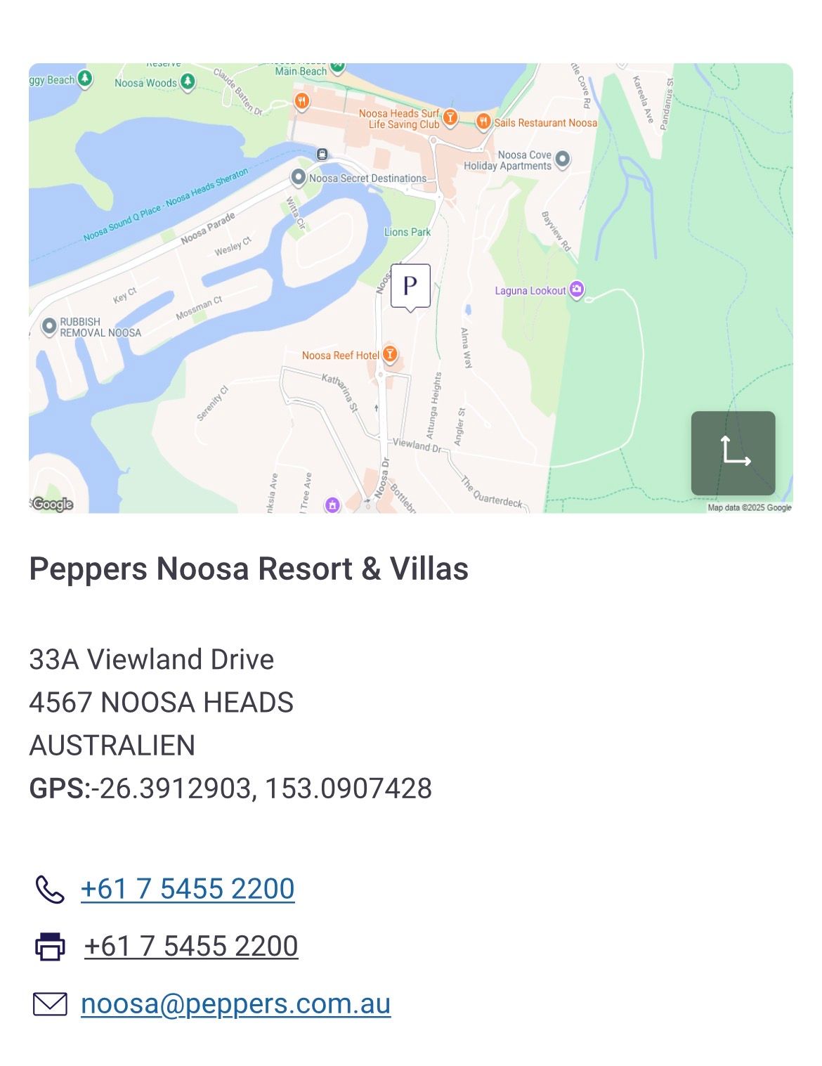 Vom Peppers Noosa zum Parkeingang → kurzer Küstenweg → Meerblick → kleine Naturpause → zurück.