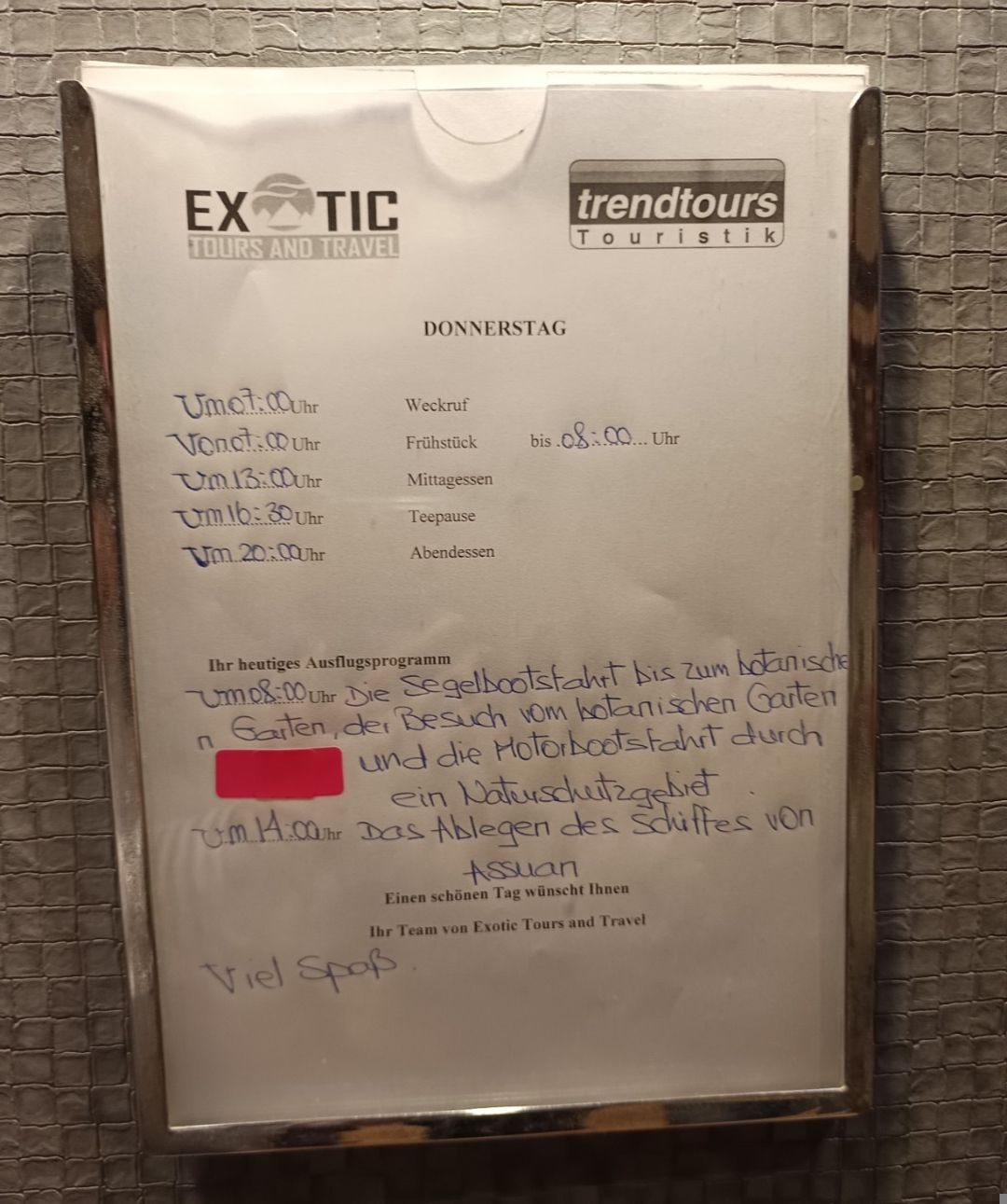 Der Rest des Tages war zur freien Verfügung. 20 Uhr Abendessen und Blick auf das Programm von morgen. Liest sich nach einem entspannten Tag.