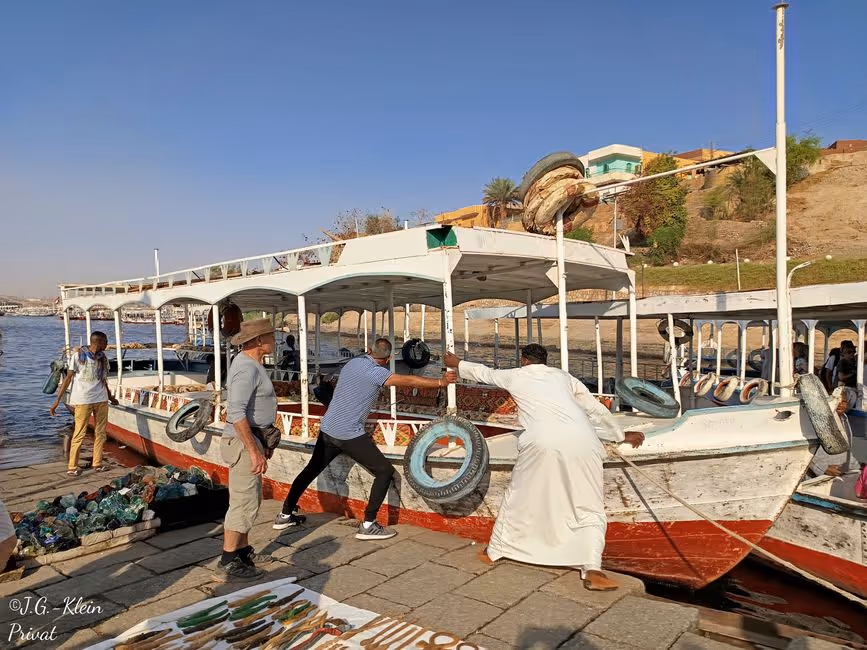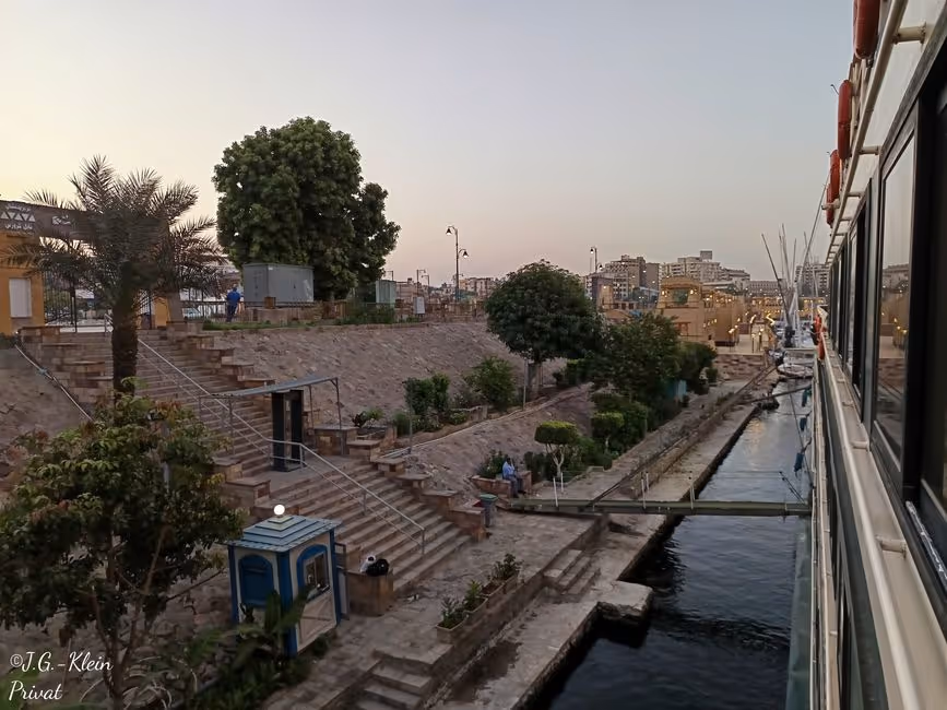 Da wir bereits gegen Mitternacht an Assuan anlegten und unsere Kabinenseite zur Straße hin war konnten wir wie wir beim Frühstück von anderen Reisenden erfuhren sehr ruhig schlafen. Es gab zwar Stimmen und Autohupen aber dies war wohl nichts zum Vergleich auf der anderen Schiffsseite. Hier hielt ein Frischluftgebläse die Gäste vom Schlaf ab.