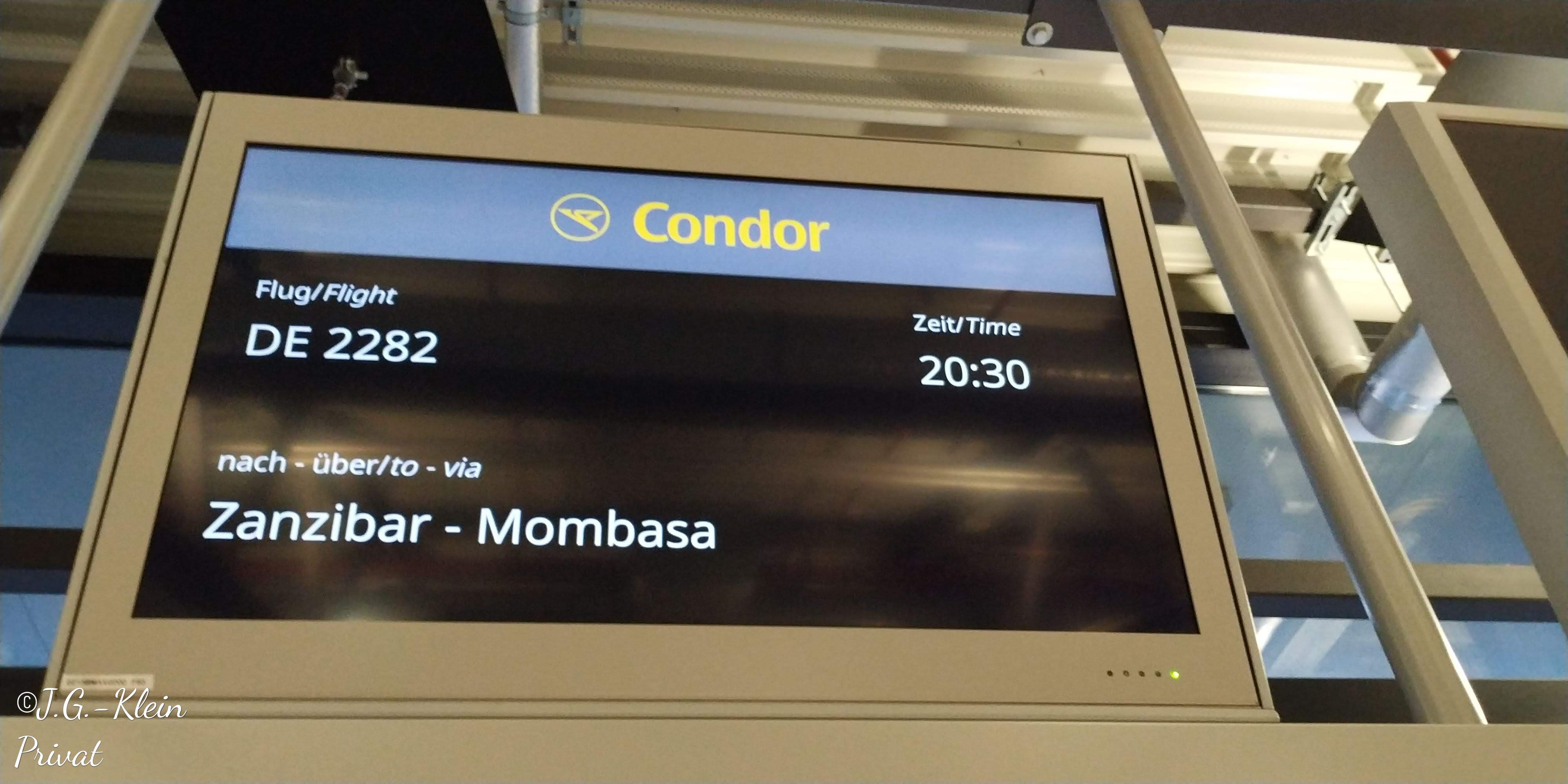 Lange geplant und heute starten wir mit Freunden unsere Kenia [/de/destination/594f89ed5f68c16c72ae3145/kenia] Reise. Von Frankfurt am Main geht es mit Condor nach Mombasa. [https://img1.vakantio.de/uploads/a35bef9837aee3193e1a394e70163327_small.jpg] [https://img1.vakantio.de/uploads/a53992885108d6beddde5c76d4485db9_small.jpg] [https://img1.vakantio.de/uploads/f5ffe2d62e593c7c82eb3dc92849d369_small.jpg] Die Verpflegung an Bord war dem entsprechend was man von Condor gewohnt ist. [https://img1.vakantio.de/uploads/dac80254bfd3f2f30ddd1b6d5b9326f8_small.jpg] Vor der Landung noch ein kleiner Snack. [https://img1.vakantio.de/uploads/e6ccc34dc0b3e4419dcb77f7666f2d9f_small.jpg]