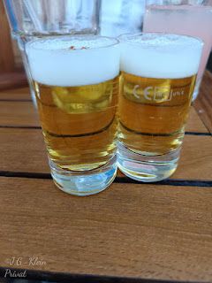 Erster Seetag in der Früh um 09:00 Uhr. Auf beiden Decks noch ausreichend freie Liegen. Mein Abendessen im Gosch