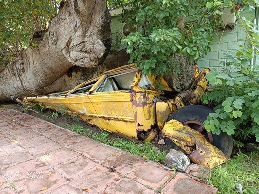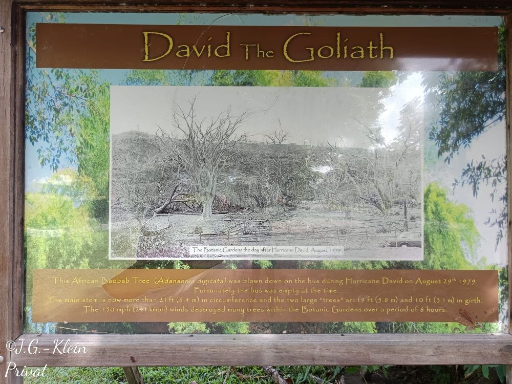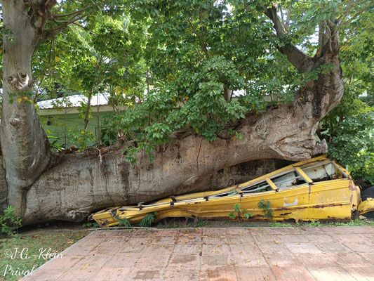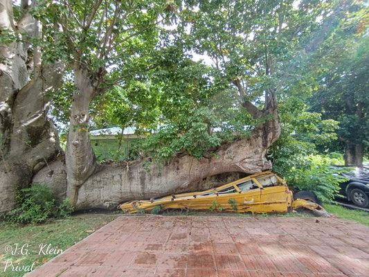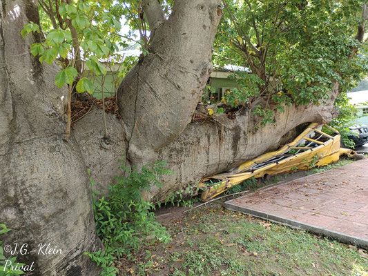 Dieser afrikanische Baobab-Baum (Adansonia digitata) wurde während des Hurrikans David am 29. August 1979 auf den Bus geweht. Glücklicherweise war der Bus zu diesem Zeitpunkt leer.