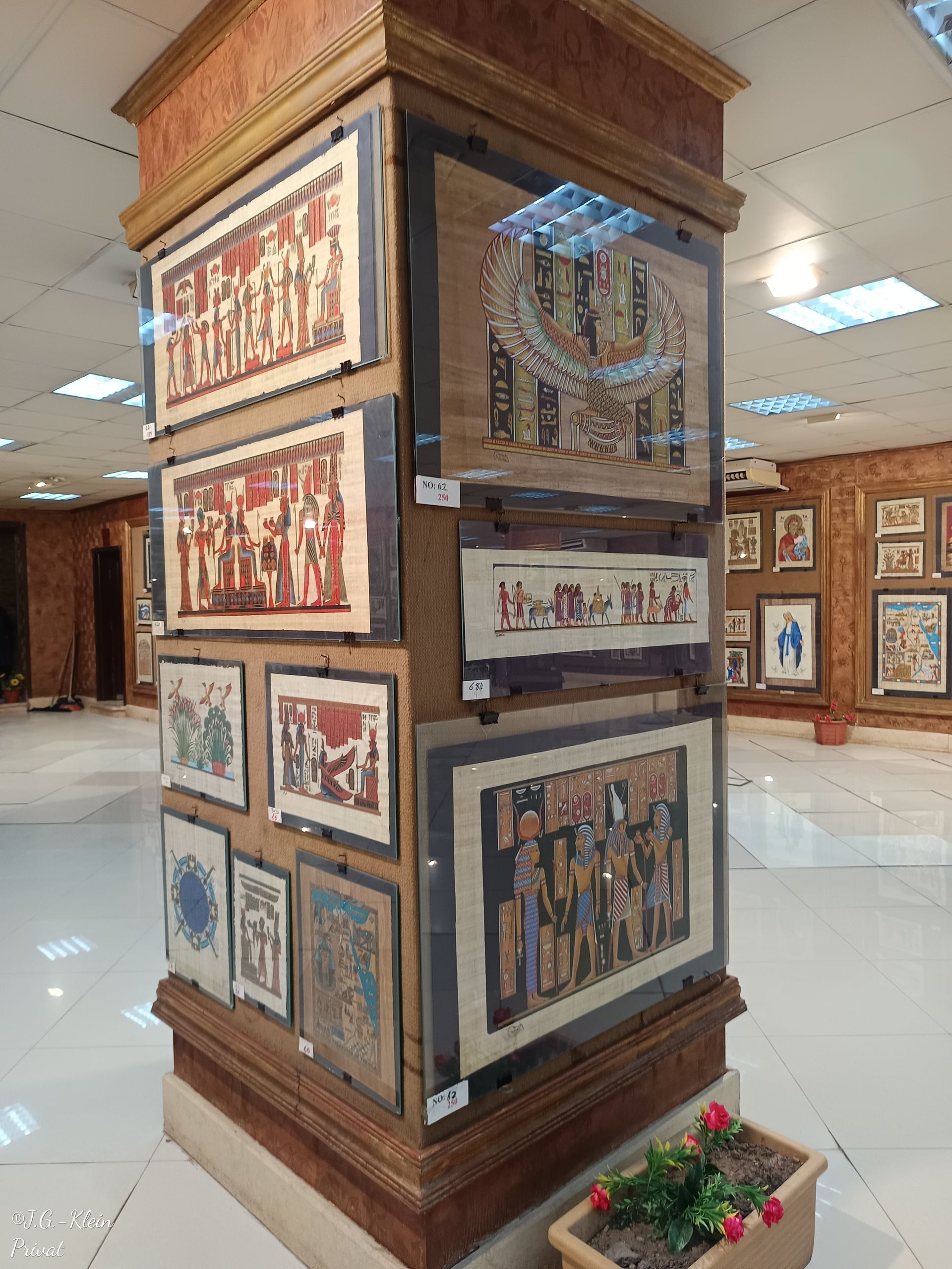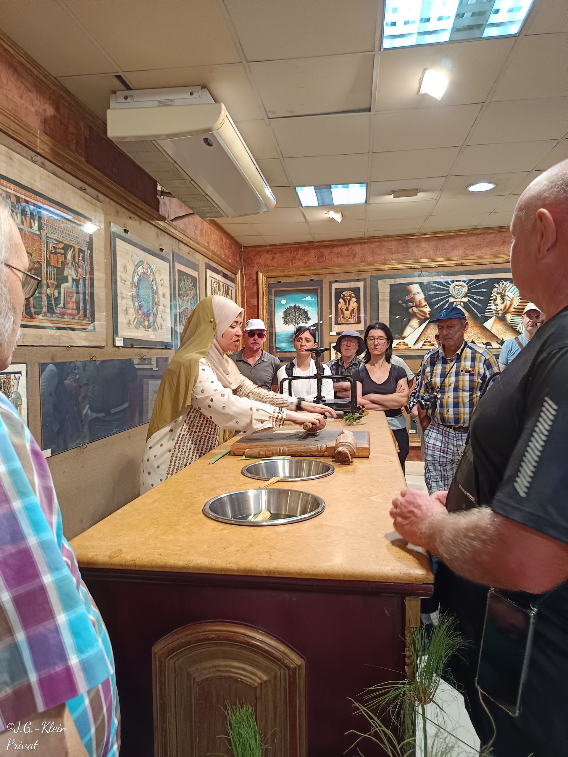 Nun fahren wir wieder zurück nach Kairo und treffen in einem Papyrus Geschäft den Rest der beiden Gruppen. Ab hier haben wir wieder unser gemeinsames Programm. Diese Papyrus Geschäfte gehören zum Pflichtprogramm auf einer Ägyptenreise. Es wird die Herstellung erklärt und natürlich wie es sich bei Verkaufsveranstaltung gehört zum Kauf animiert.