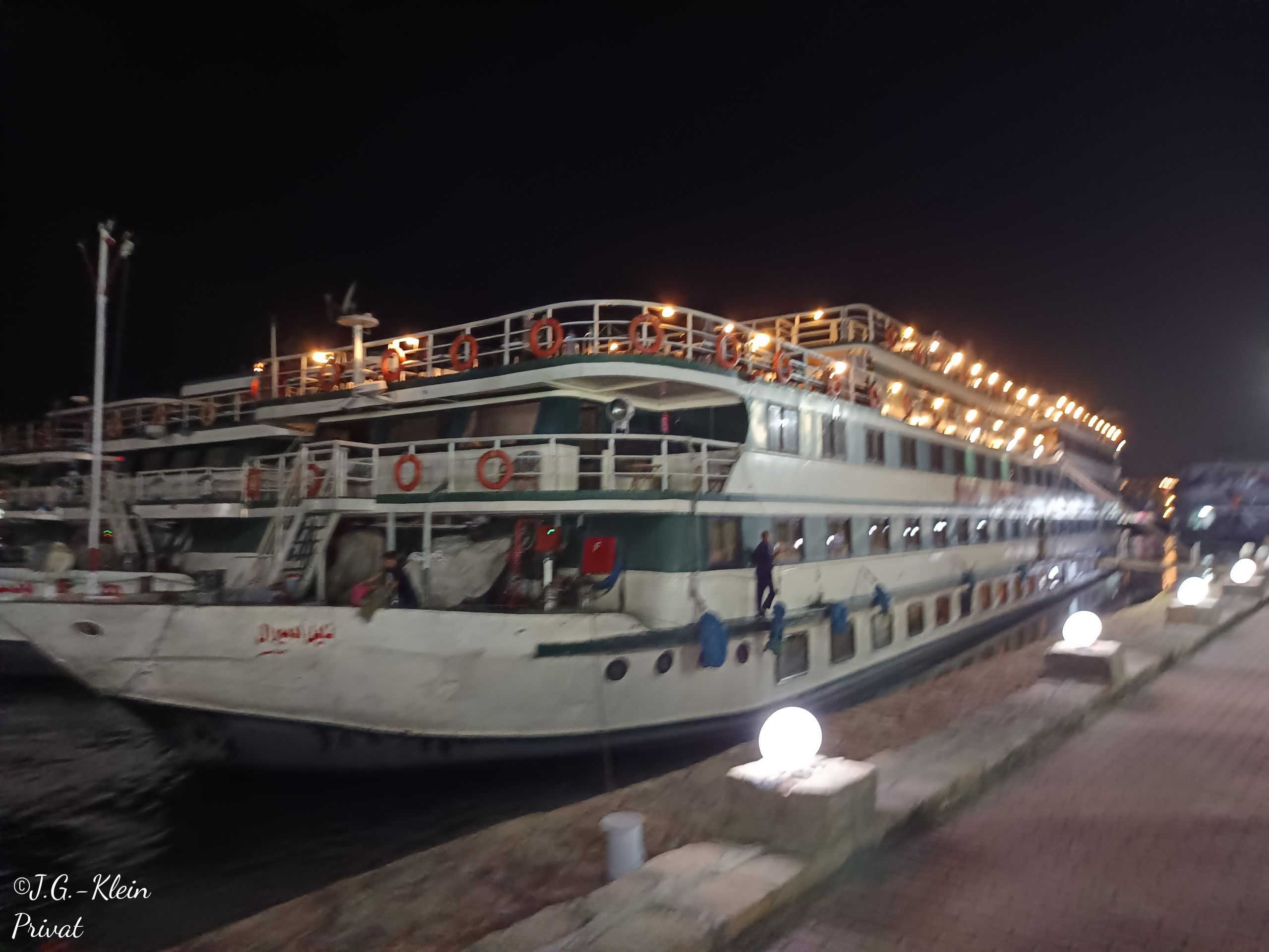 Um 22 Uhr erreichen wir unser Schiff. Der Reiseleiter teilte uns am Vortag auf Anfrage mit, dass wir mit der Nile Admiral fahren würden. Ein älteres aber schönes Schiff mit sehr gutem Essen. Letzte Renovierung vor ca. 20 Jahren. Immer wieder betonte er, wer ein 5 Sterne Schiff will müsse viel mehr zahlen. Ich hatte ein sehr ungutes Gefühl. Laut Prospekt hatten wir ein 5 Sterne Schiff gebucht. Mein Gefühl wurde bestätigt. Der erste Eindruck von außen.