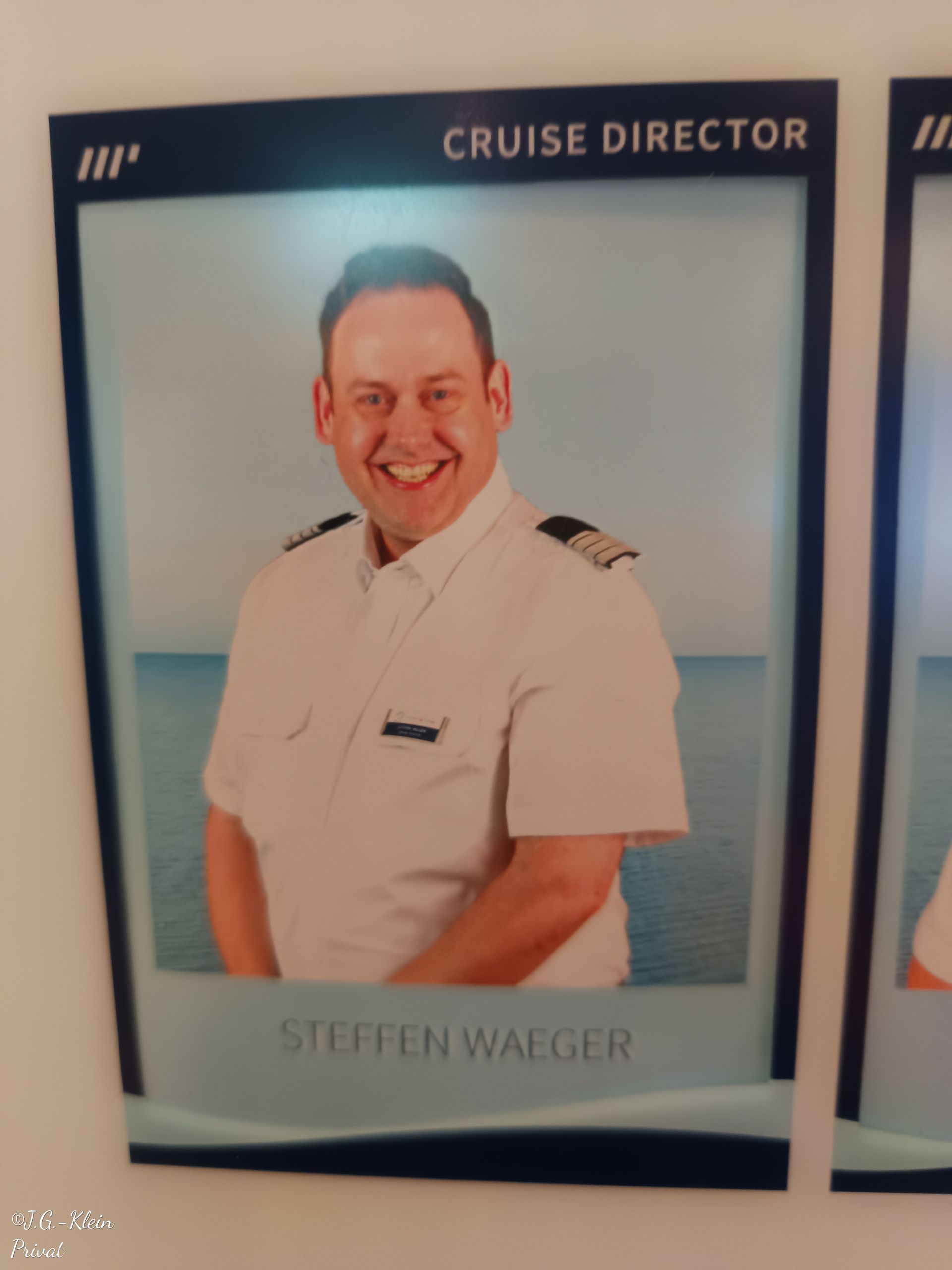 Nun wird es aber Zeit die wichtigsten Personen des Schiffs vorzustellen. Jens Troier unser Kapitän und Steffen Waeger die Stimme des Schiffs. Der Kapitän eher etwas zu, sagen wir mal steif, bei seinen täglichen Ansprachen. Da gibt es gewiss unterhaltsamere Kapitäne. Mit Steffen Waeger als Stimme des Schiffs hatten wir einen Glücksgriff. Humorvoll und immer präsent.