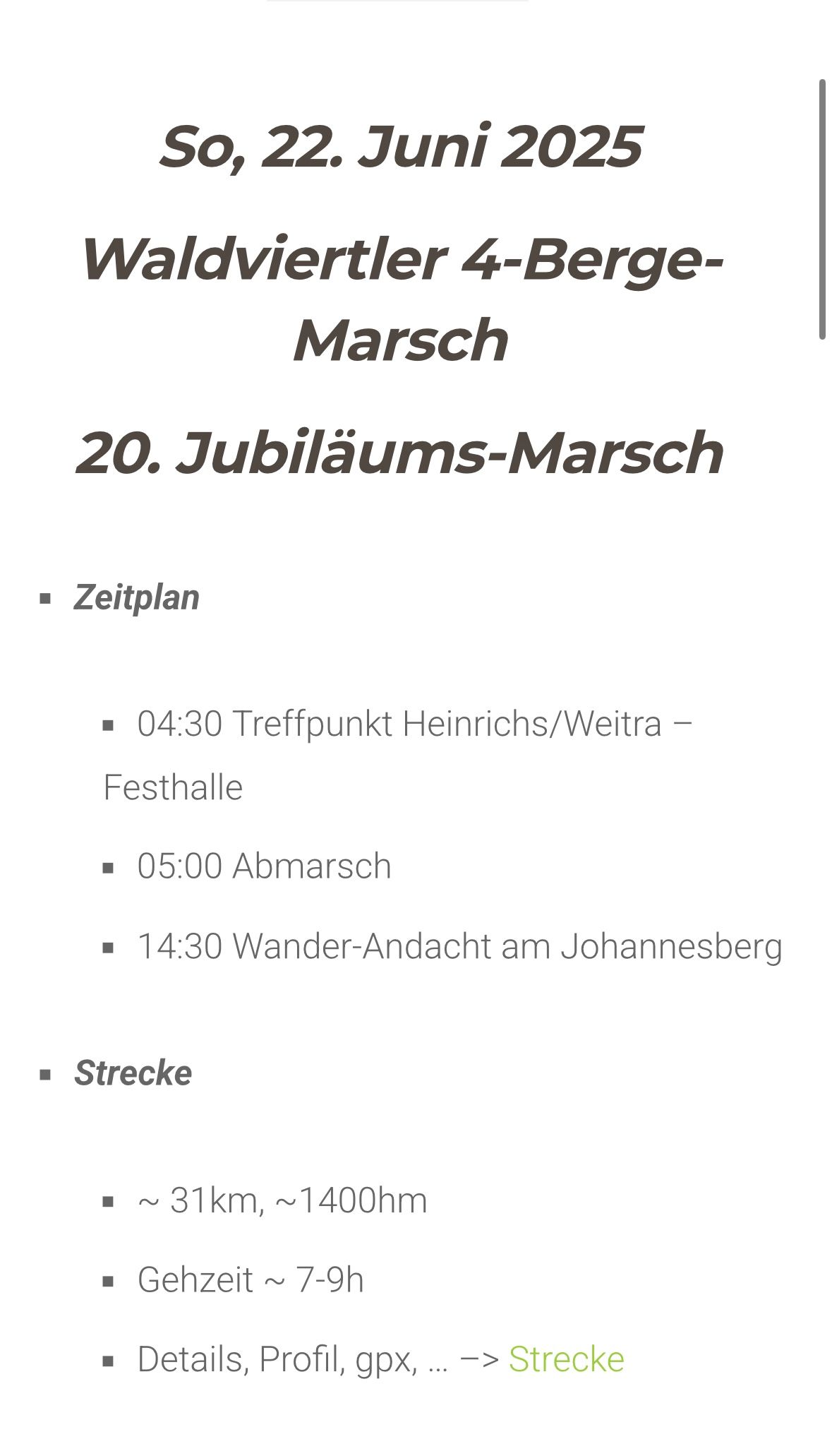Heute, am 22. Juni 2025, war es endlich so weit: Der legendäre 4-Berge-Marsch feierte sein 20-jähriges Jubiläum – ein Pflichttermin für alle, die diese besondere Herausforderung und die landschaftliche Schönheit des Waldviertels lieben. Und natürlich wollte ich bei diesem besonderen Event unbedingt dabei sein.