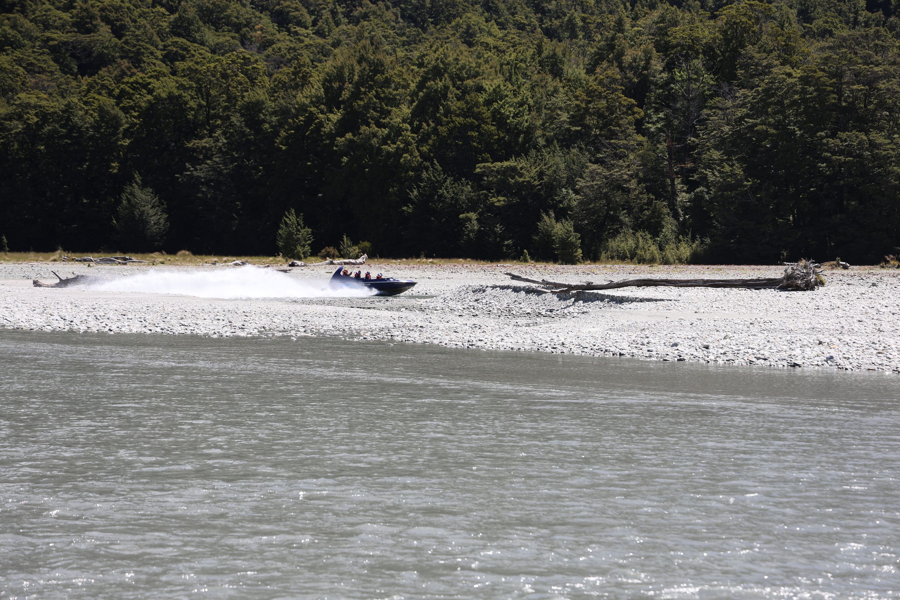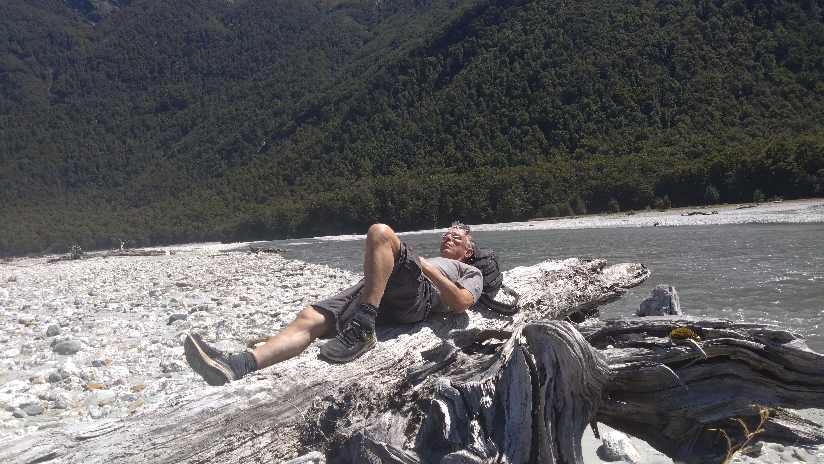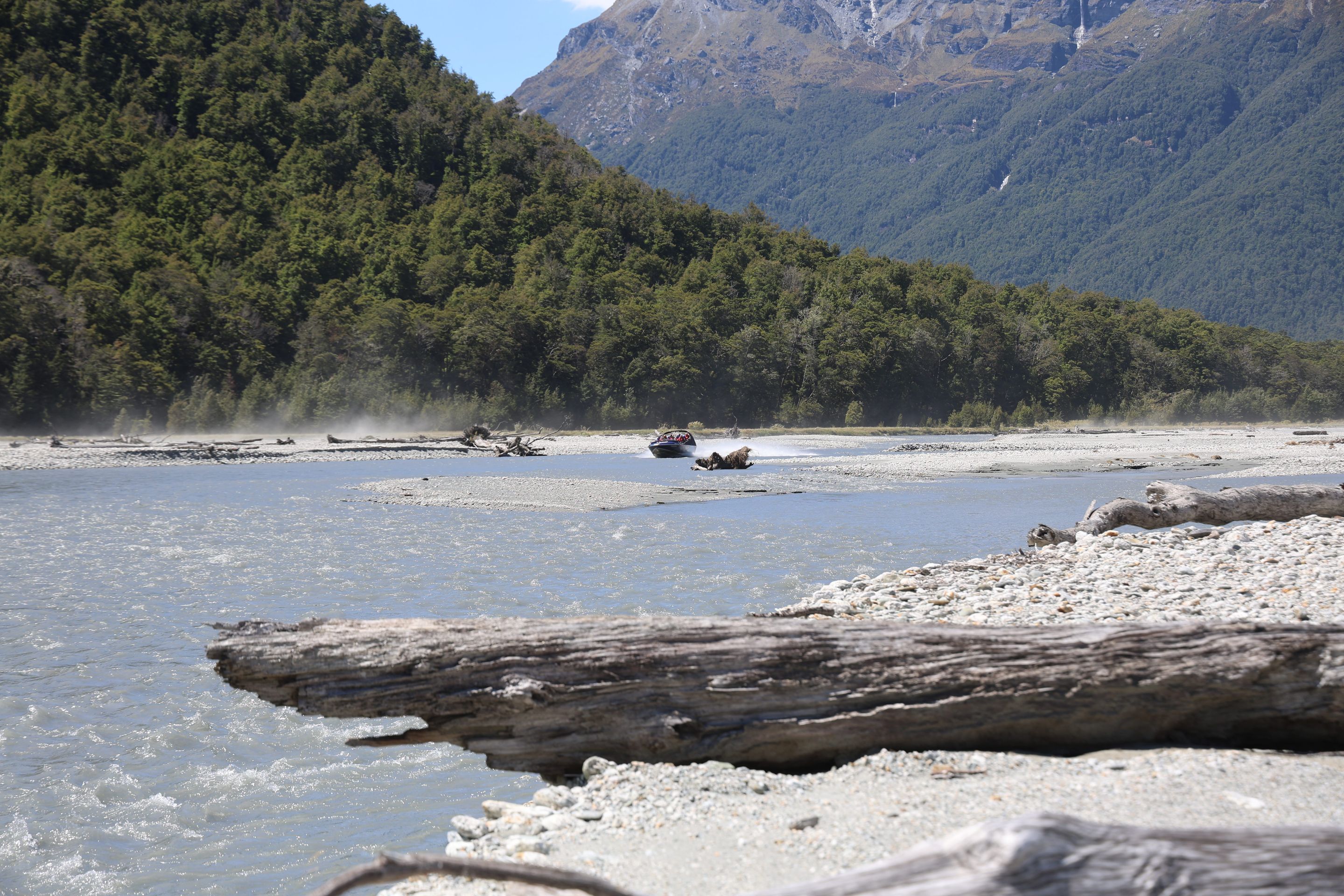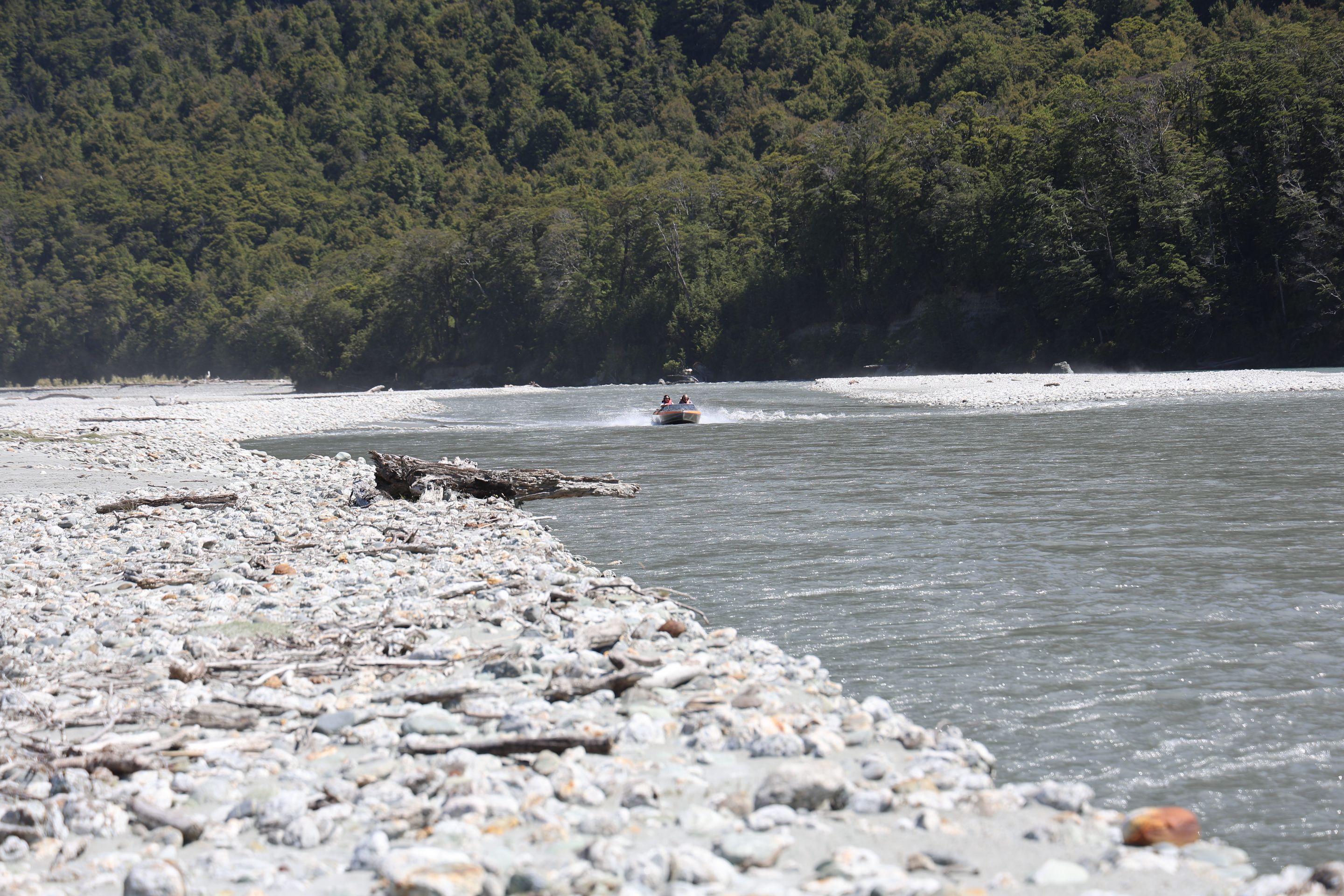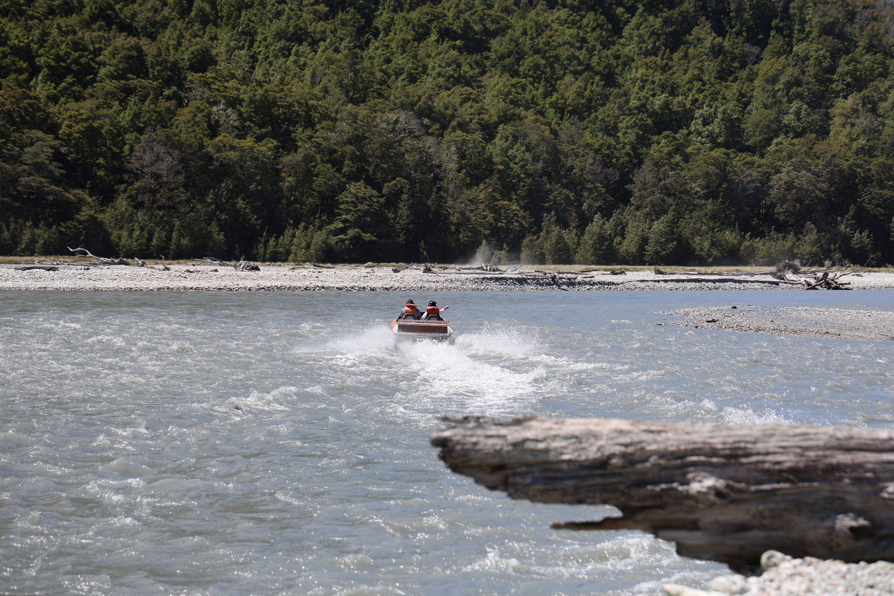 Ich fahre noch 5 km weiter, durchquere verschieden Bäche (Einer war zu tief, da musste ich erst 10min im kalten Wasser spielen und Steine wegräumen, danach passte der Wasserlevel) und komme am Ende zu dem dem kleinen DOC - Parkplatz Chinaman´s Bluff. Zu Fuß geht es eine Stunde im Flußtal aufwärts, irgendwann lege ich mich auf einen Stamm und döse was in der Sonne. Was jetzt kommt, ist irgendwie typisch NZ: Ein Motorgeräusch nähert sich von Flussaufwarts, dann sehe ich auch schon ein Jetboot. Insgesamt werden es 3 Boote, die da mit viel Getöse und Gekreische der Passagiere in mir vorbeidüsen. Scheint Spass zu machen, mitten im Nirgendwo. Dann kommt auch noch ein kleines privates Boot hochgeschossen, es hält bei mir und der Bootsführer lädt mich ein, mitzukommen. NZ halt...aber mit Laptop und Kamera im Rucksack ist Jetboot fahren eher schlecht.