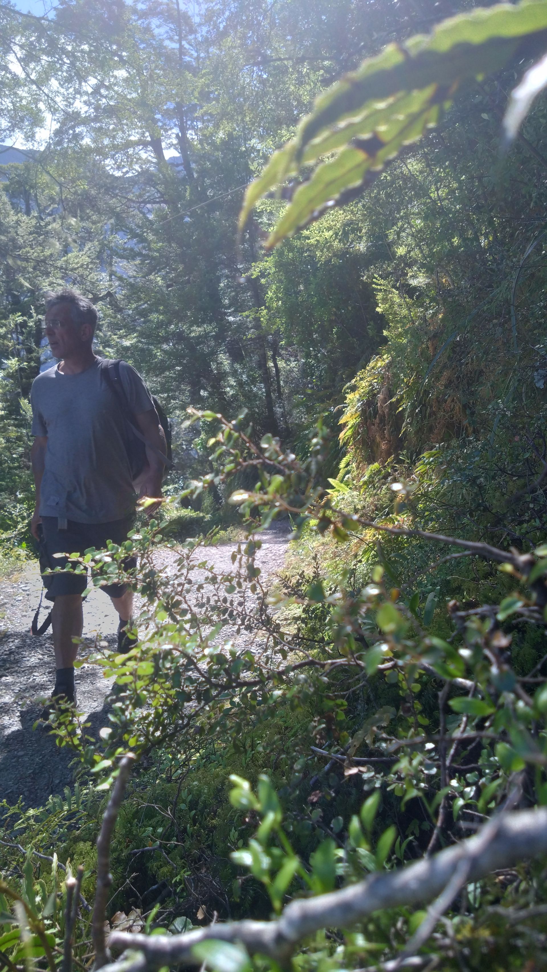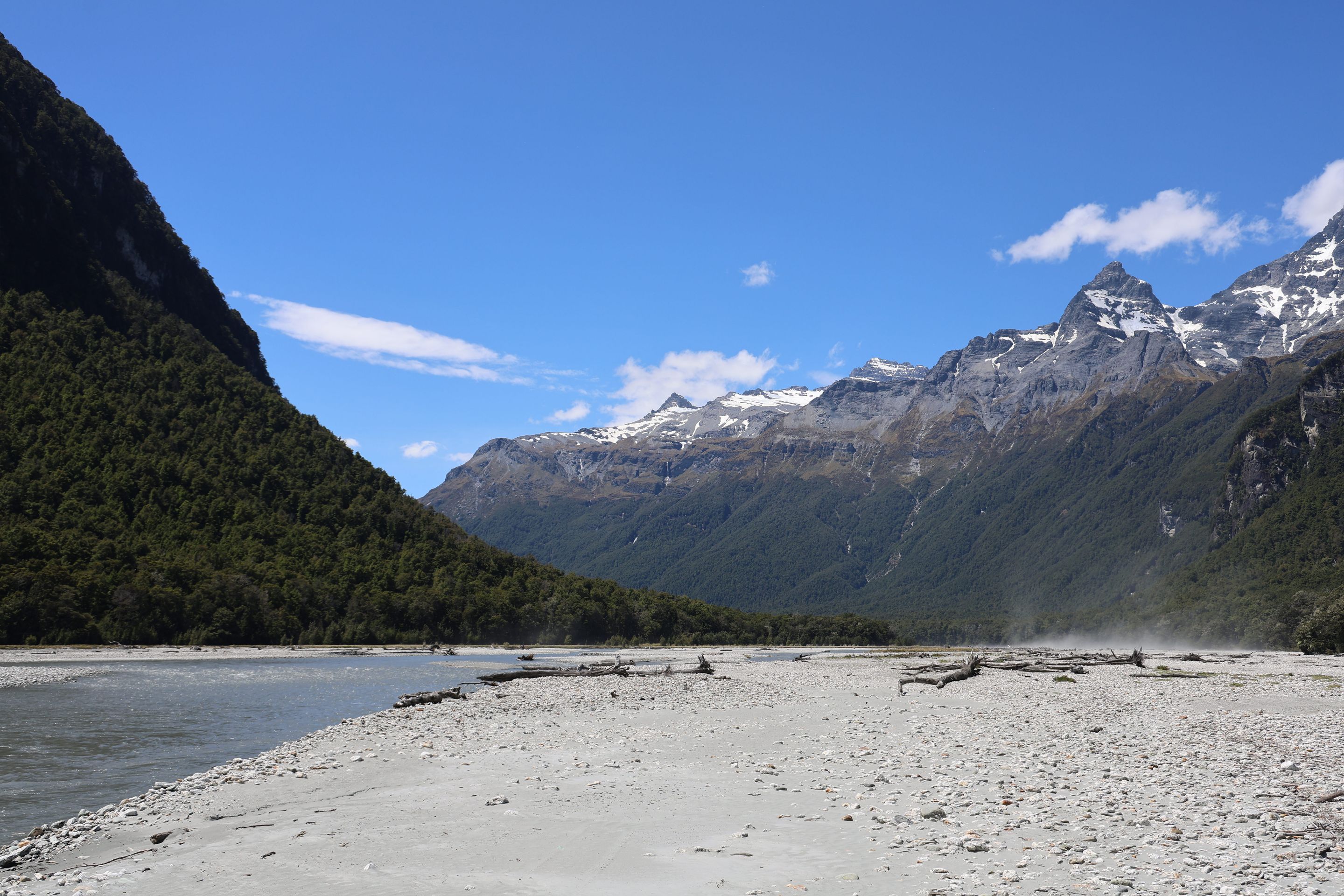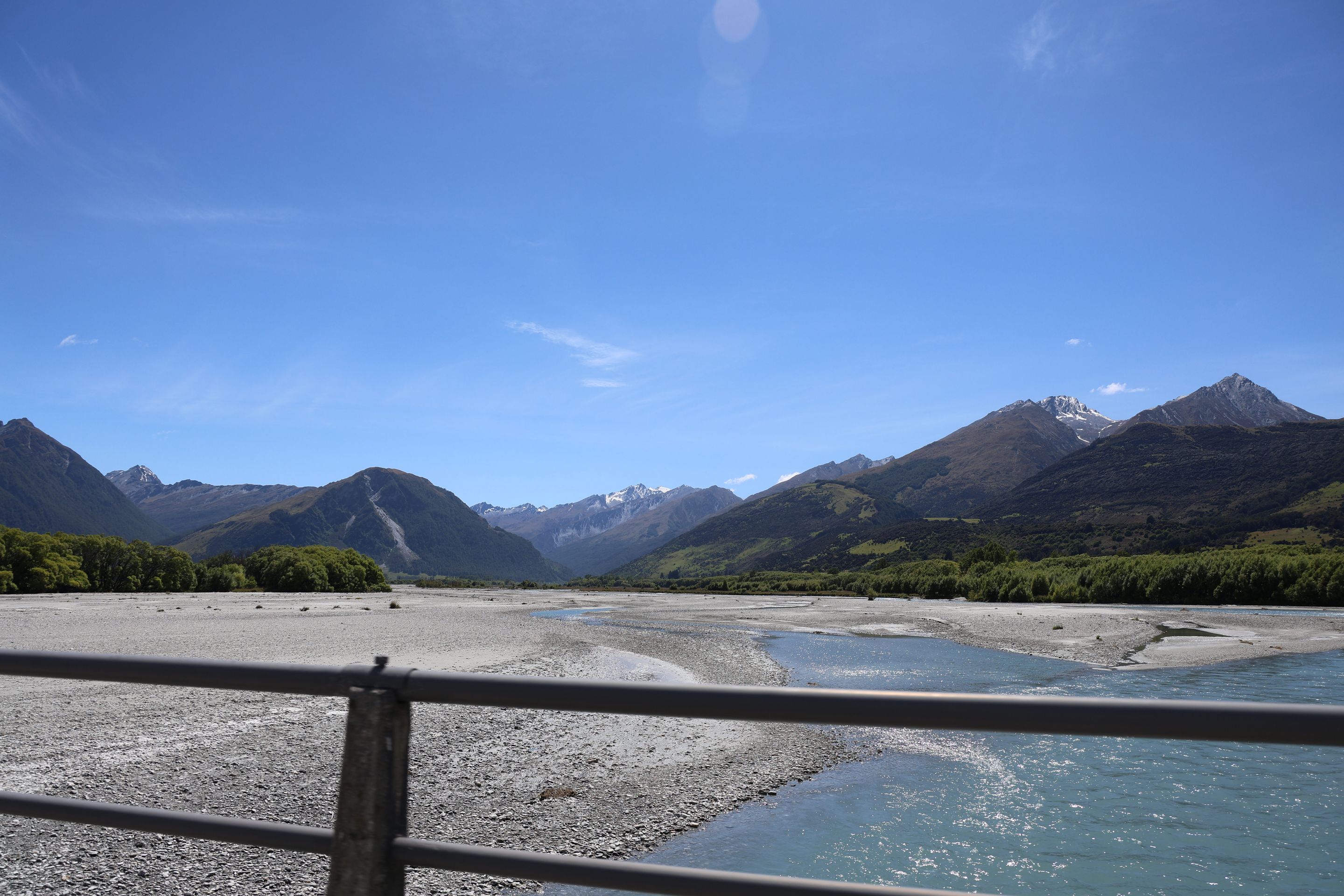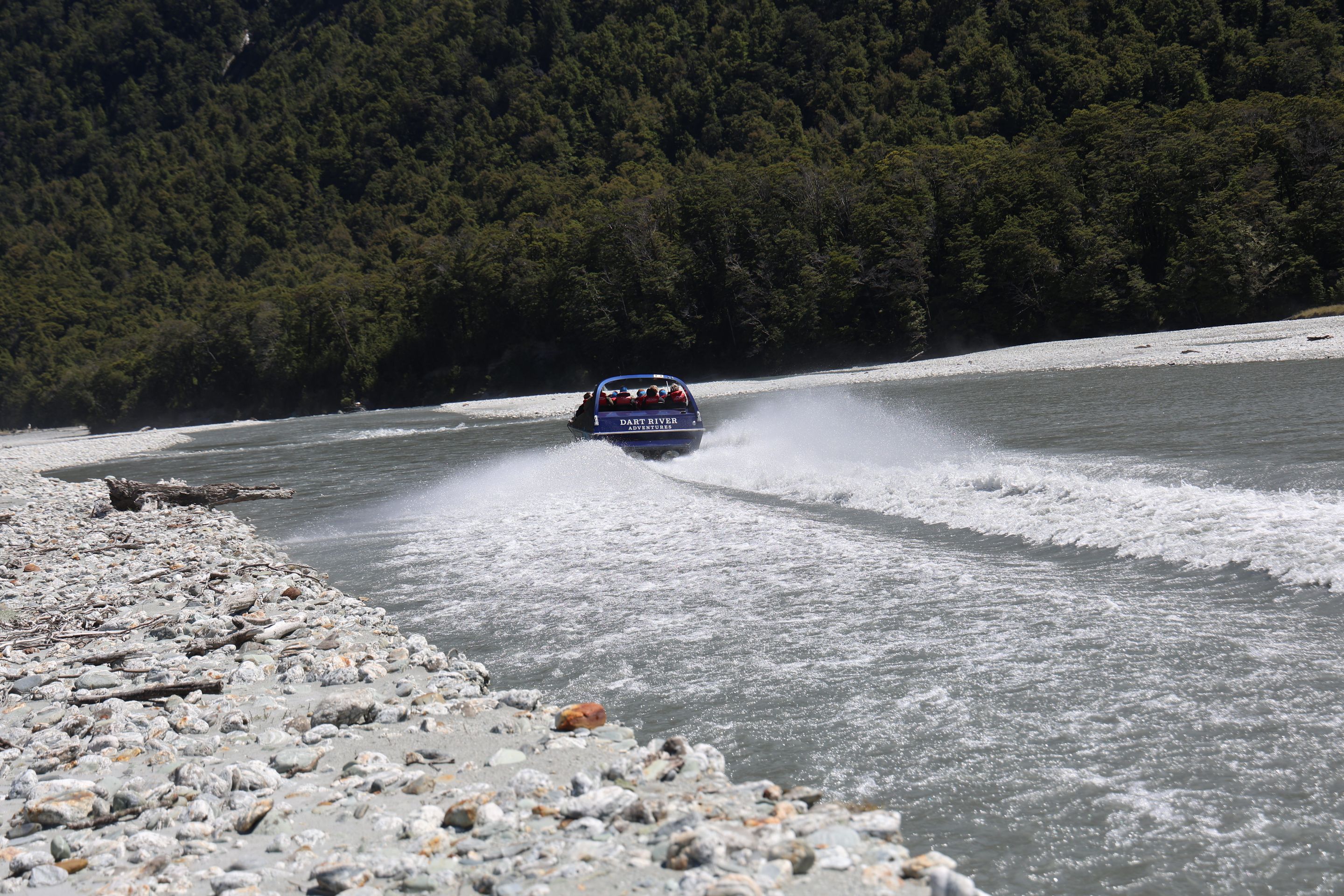 Ich fahre noch 5 km weiter, durchquere verschieden Bäche (Einer war zu tief, da musste ich erst 10min im kalten Wasser spielen und Steine wegräumen, danach passte der Wasserlevel) und komme am Ende zu dem dem kleinen DOC - Parkplatz Chinaman´s Bluff. Zu Fuß geht es eine Stunde im Flußtal aufwärts, irgendwann lege ich mich auf einen Stamm und döse was in der Sonne. Was jetzt kommt, ist irgendwie typisch NZ: Ein Motorgeräusch nähert sich von Flussaufwarts, dann sehe ich auch schon ein Jetboot. Insgesamt werden es 3 Boote, die da mit viel Getöse und Gekreische der Passagiere in mir vorbeidüsen. Scheint Spass zu machen, mitten im Nirgendwo. Dann kommt auch noch ein kleines privates Boot hochgeschossen, es hält bei mir und der Bootsführer lädt mich ein, mitzukommen. NZ halt...aber mit Laptop und Kamera im Rucksack ist Jetboot fahren eher schlecht.
