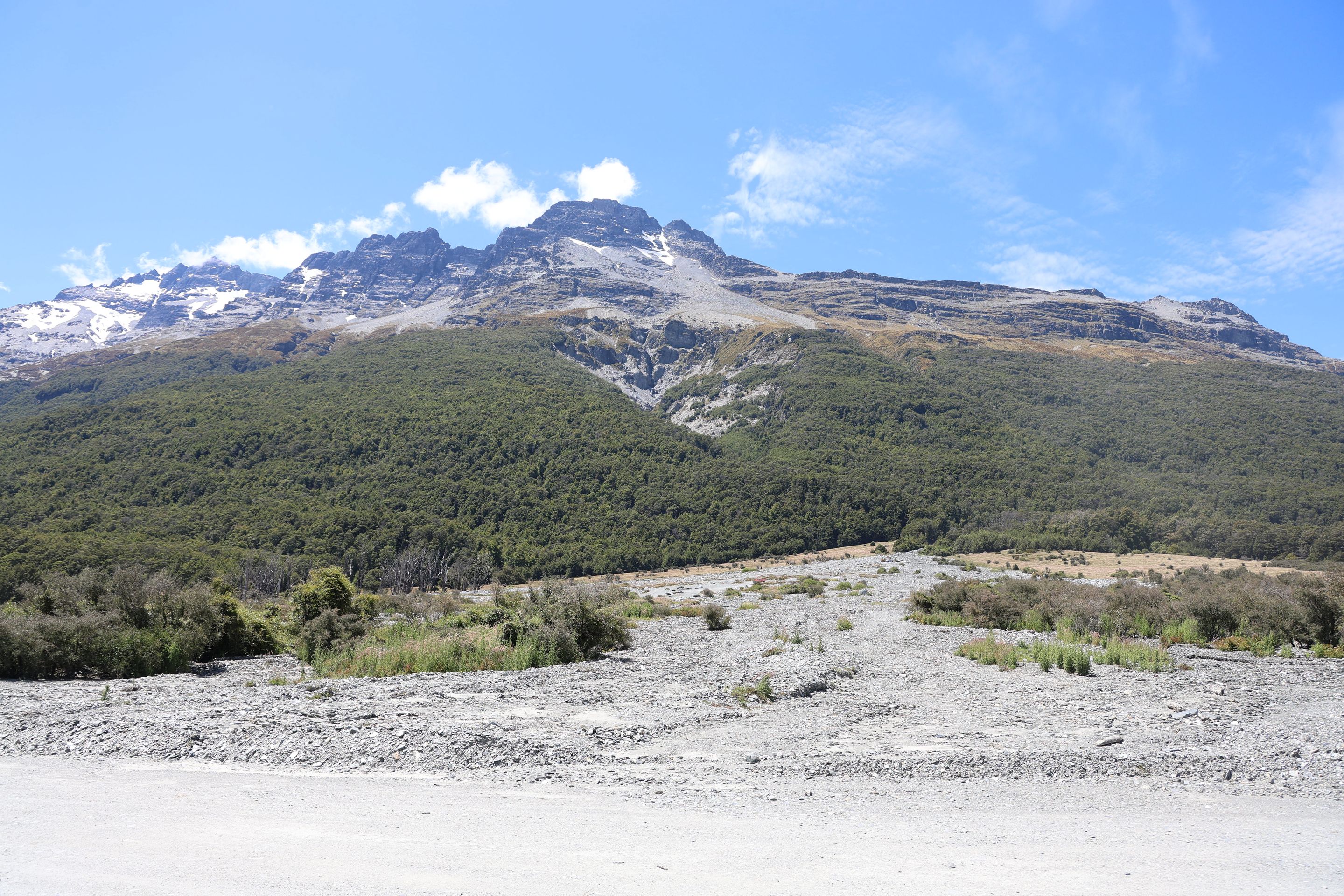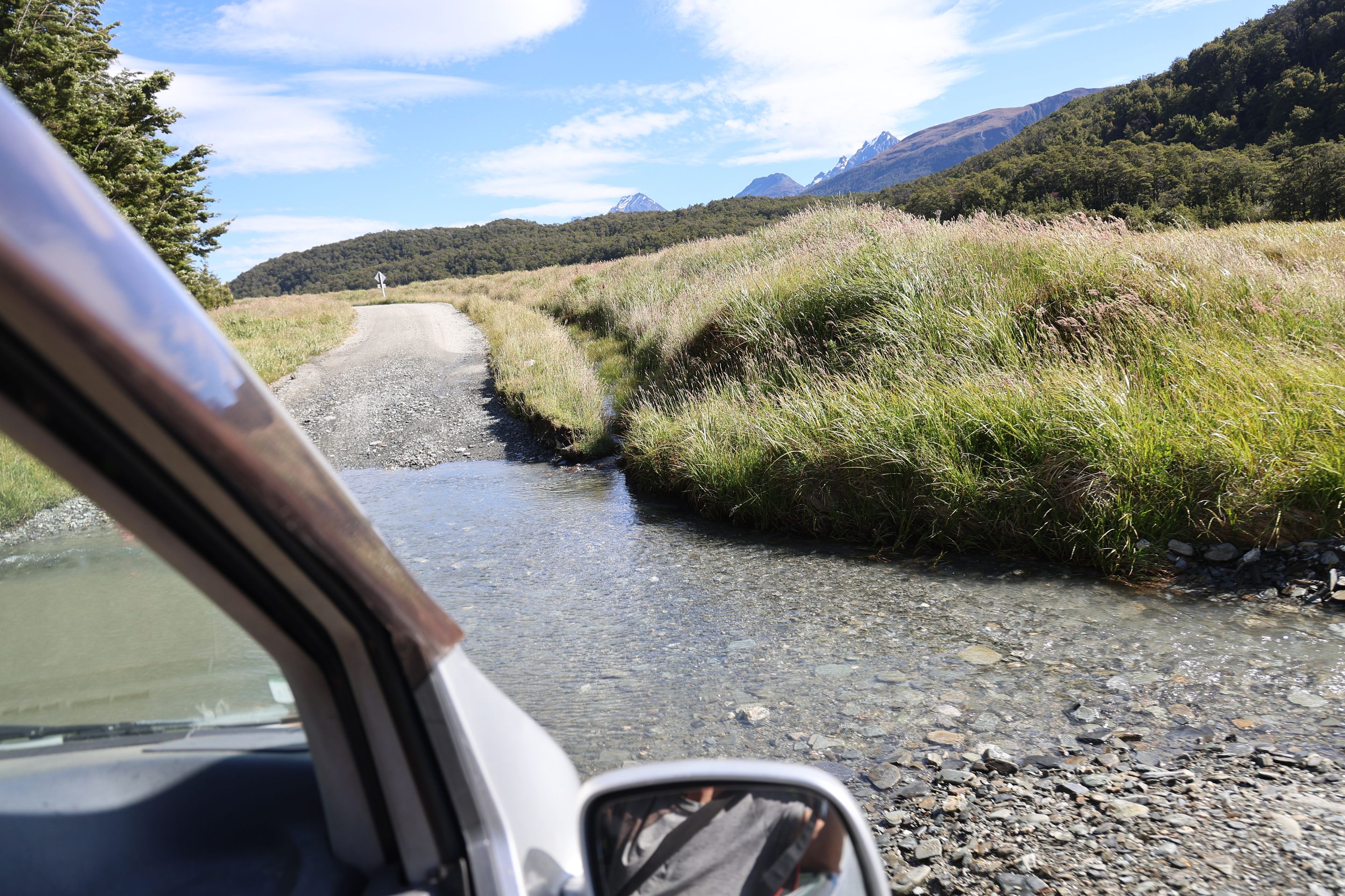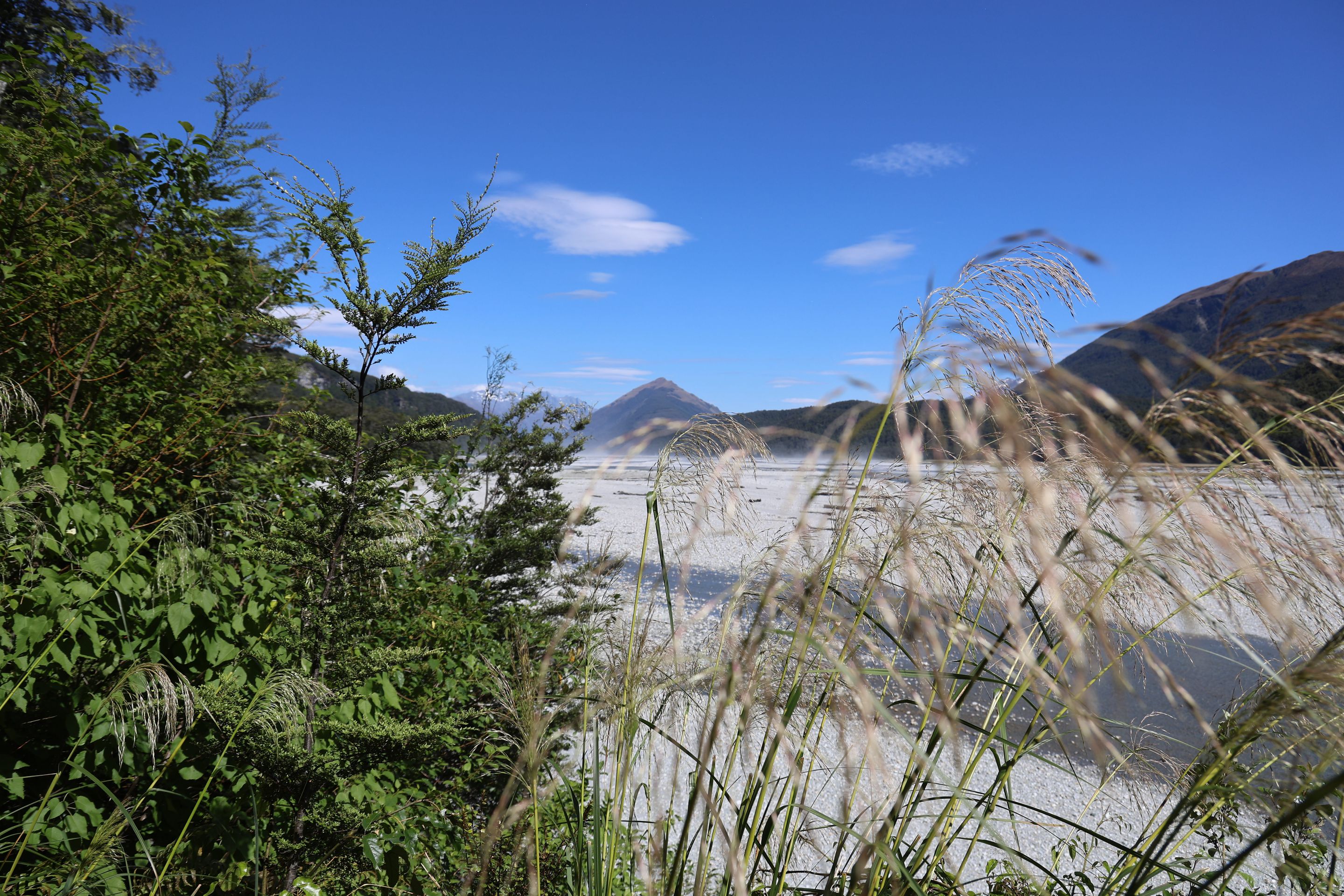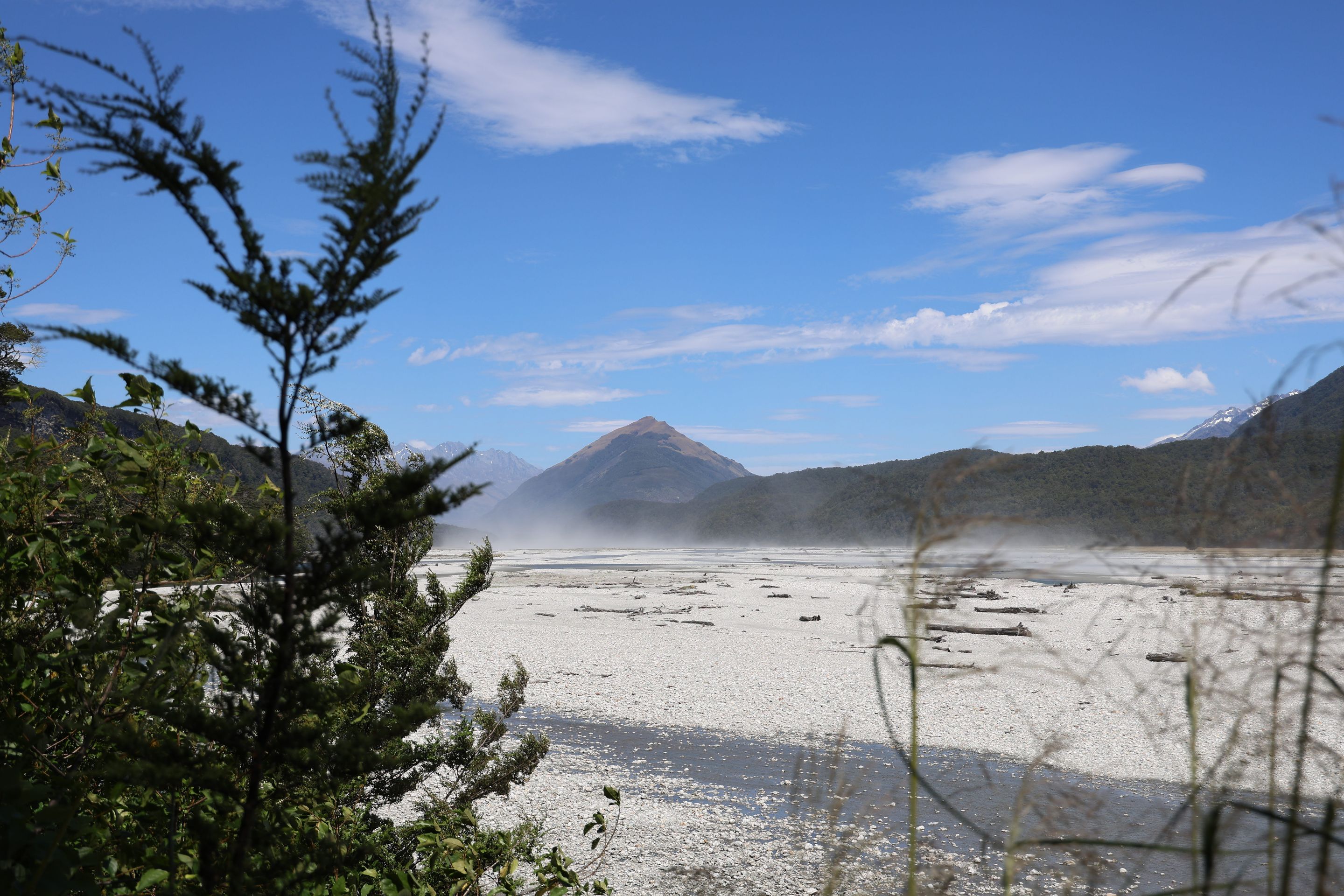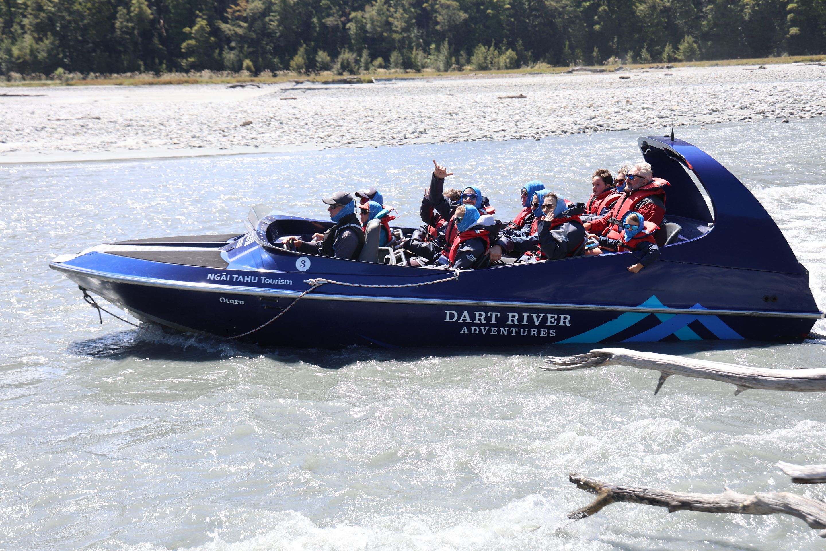 Ich fahre noch 5 km weiter, durchquere verschieden Bäche (Einer war zu tief, da musste ich erst 10min im kalten Wasser spielen und Steine wegräumen, danach passte der Wasserlevel) und komme am Ende zu dem dem kleinen DOC - Parkplatz Chinaman´s Bluff. Zu Fuß geht es eine Stunde im Flußtal aufwärts, irgendwann lege ich mich auf einen Stamm und döse was in der Sonne. Was jetzt kommt, ist irgendwie typisch NZ: Ein Motorgeräusch nähert sich von Flussaufwarts, dann sehe ich auch schon ein Jetboot. Insgesamt werden es 3 Boote, die da mit viel Getöse und Gekreische der Passagiere in mir vorbeidüsen. Scheint Spass zu machen, mitten im Nirgendwo. Dann kommt auch noch ein kleines privates Boot hochgeschossen, es hält bei mir und der Bootsführer lädt mich ein, mitzukommen. NZ halt...aber mit Laptop und Kamera im Rucksack ist Jetboot fahren eher schlecht.