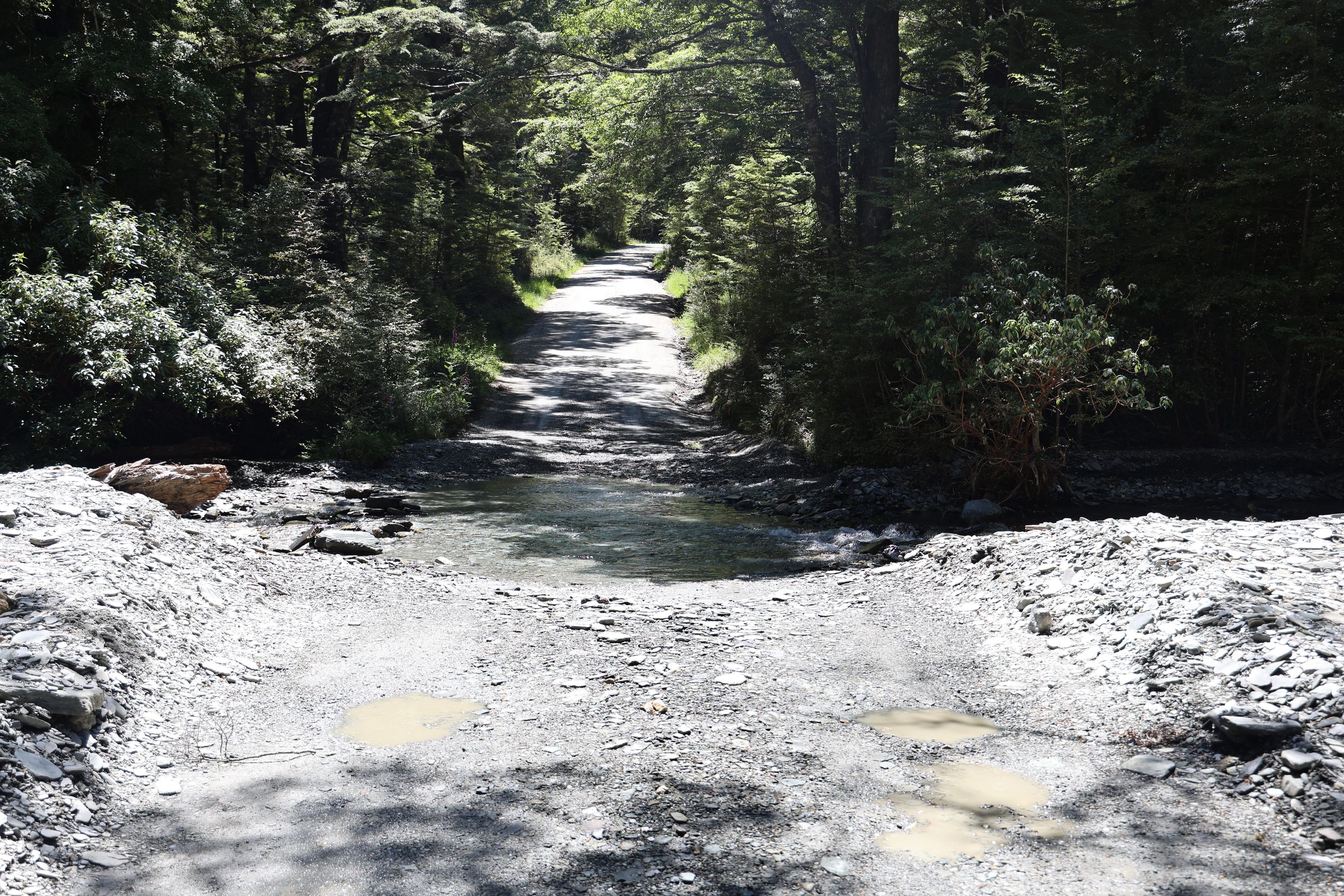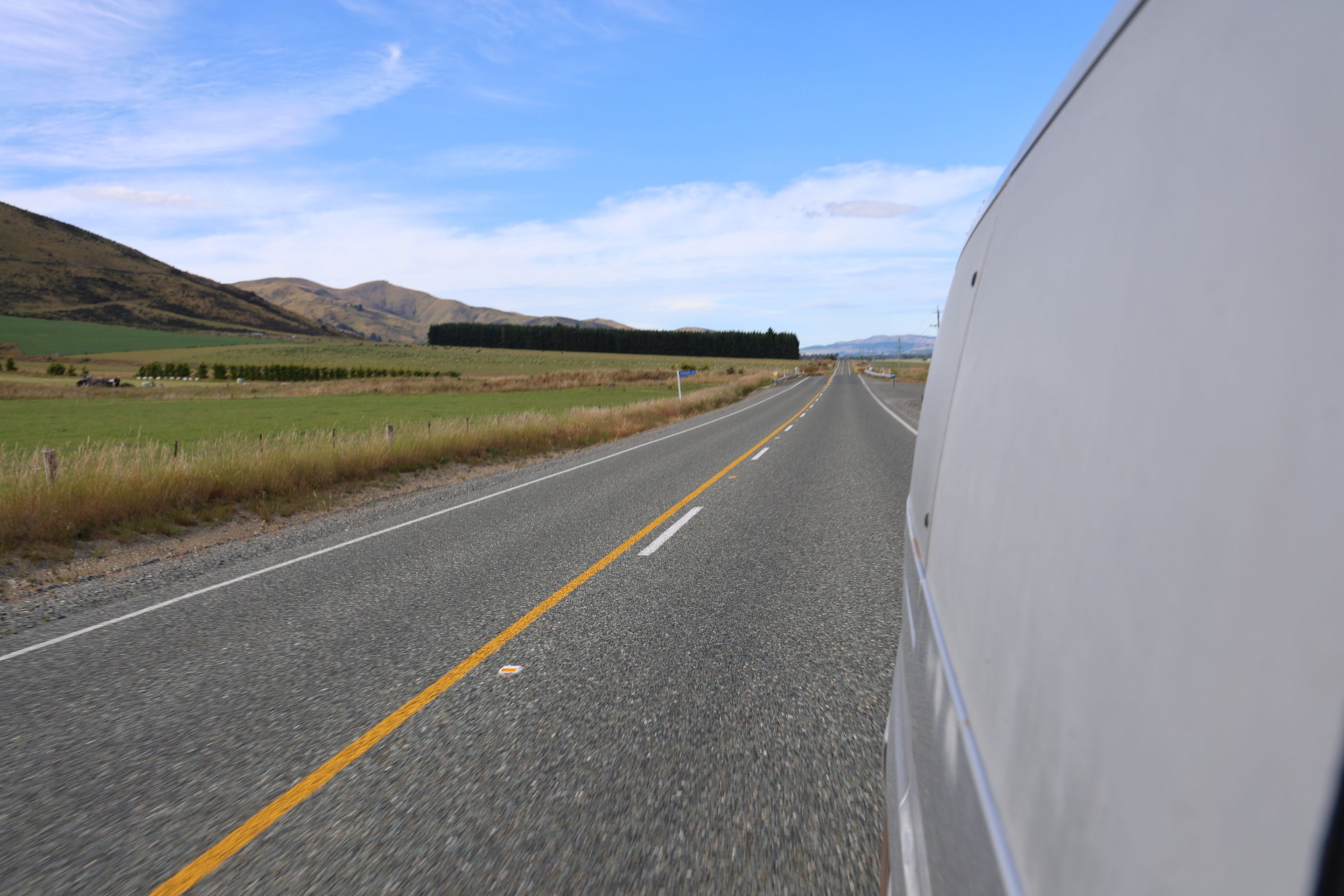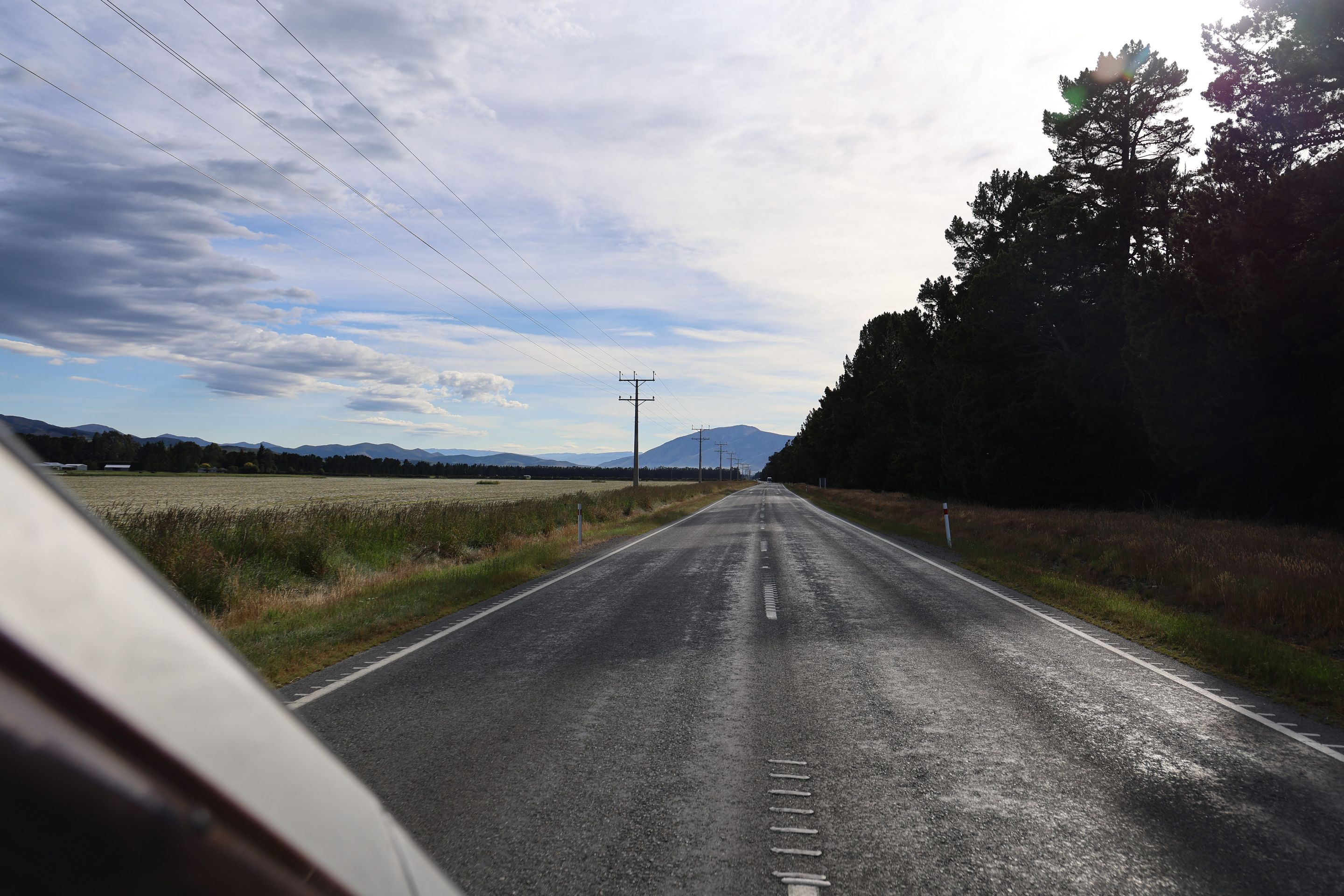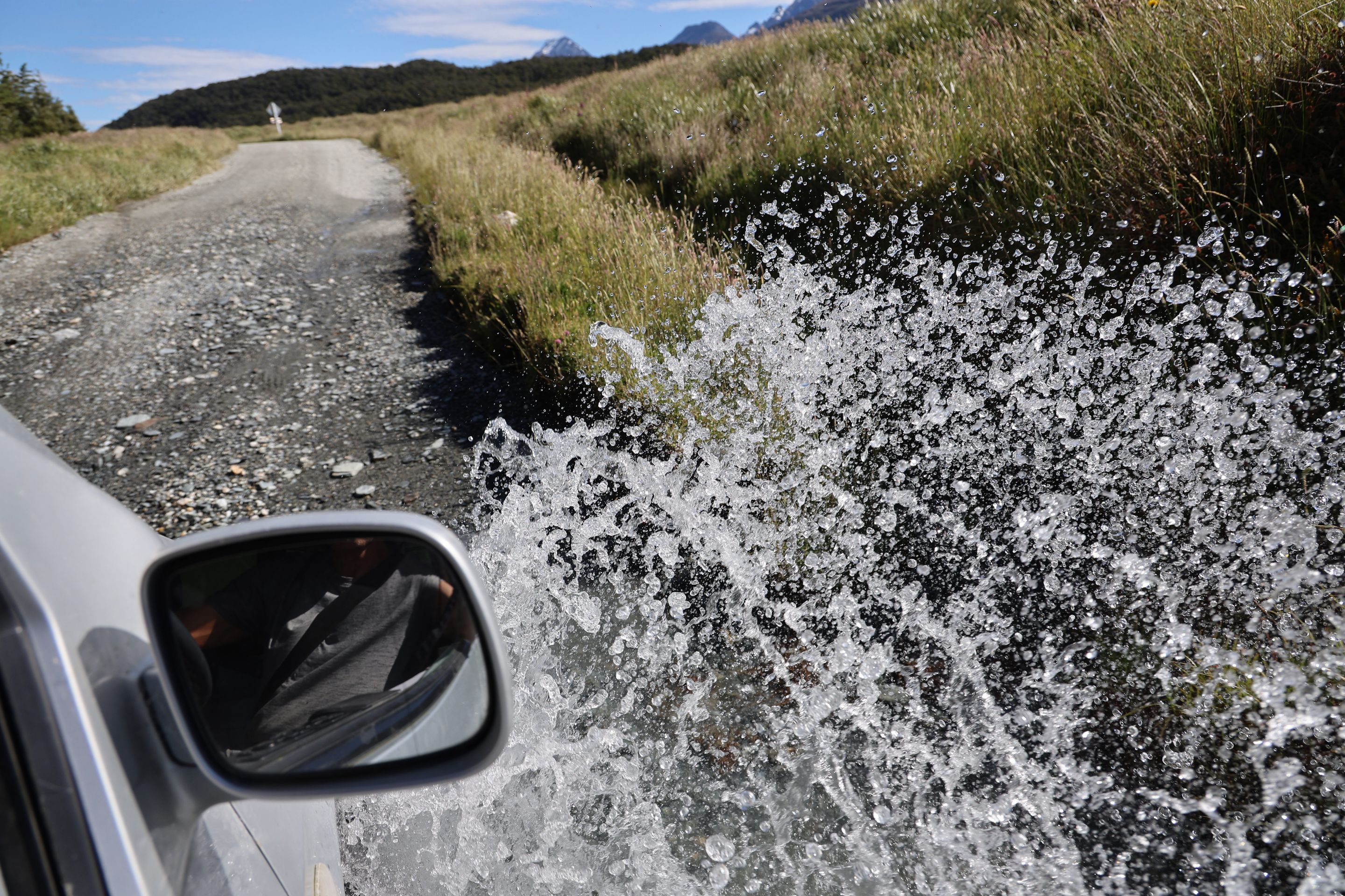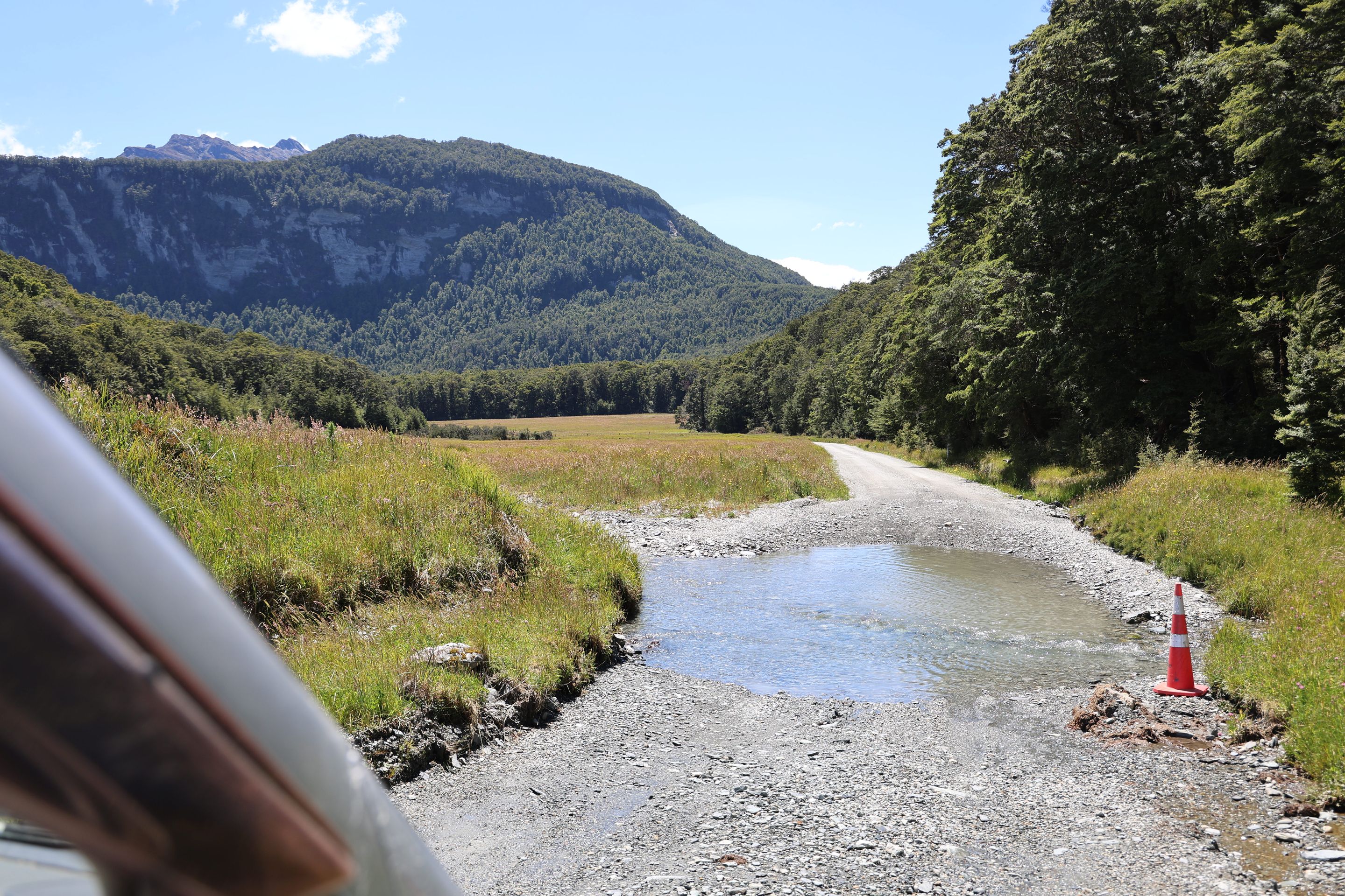 Ich fahre noch 5 km weiter, durchquere verschieden Bäche (Einer war zu tief, da musste ich erst 10min im kalten Wasser spielen und Steine wegräumen, danach passte der Wasserlevel) und komme am Ende zu dem dem kleinen DOC - Parkplatz Chinaman´s Bluff. Zu Fuß geht es eine Stunde im Flußtal aufwärts, irgendwann lege ich mich auf einen Stamm und döse was in der Sonne. Was jetzt kommt, ist irgendwie typisch NZ: Ein Motorgeräusch nähert sich von Flussaufwarts, dann sehe ich auch schon ein Jetboot. Insgesamt werden es 3 Boote, die da mit viel Getöse und Gekreische der Passagiere in mir vorbeidüsen. Scheint Spass zu machen, mitten im Nirgendwo. Dann kommt auch noch ein kleines privates Boot hochgeschossen, es hält bei mir und der Bootsführer lädt mich ein, mitzukommen. NZ halt...aber mit Laptop und Kamera im Rucksack ist Jetboot fahren eher schlecht.