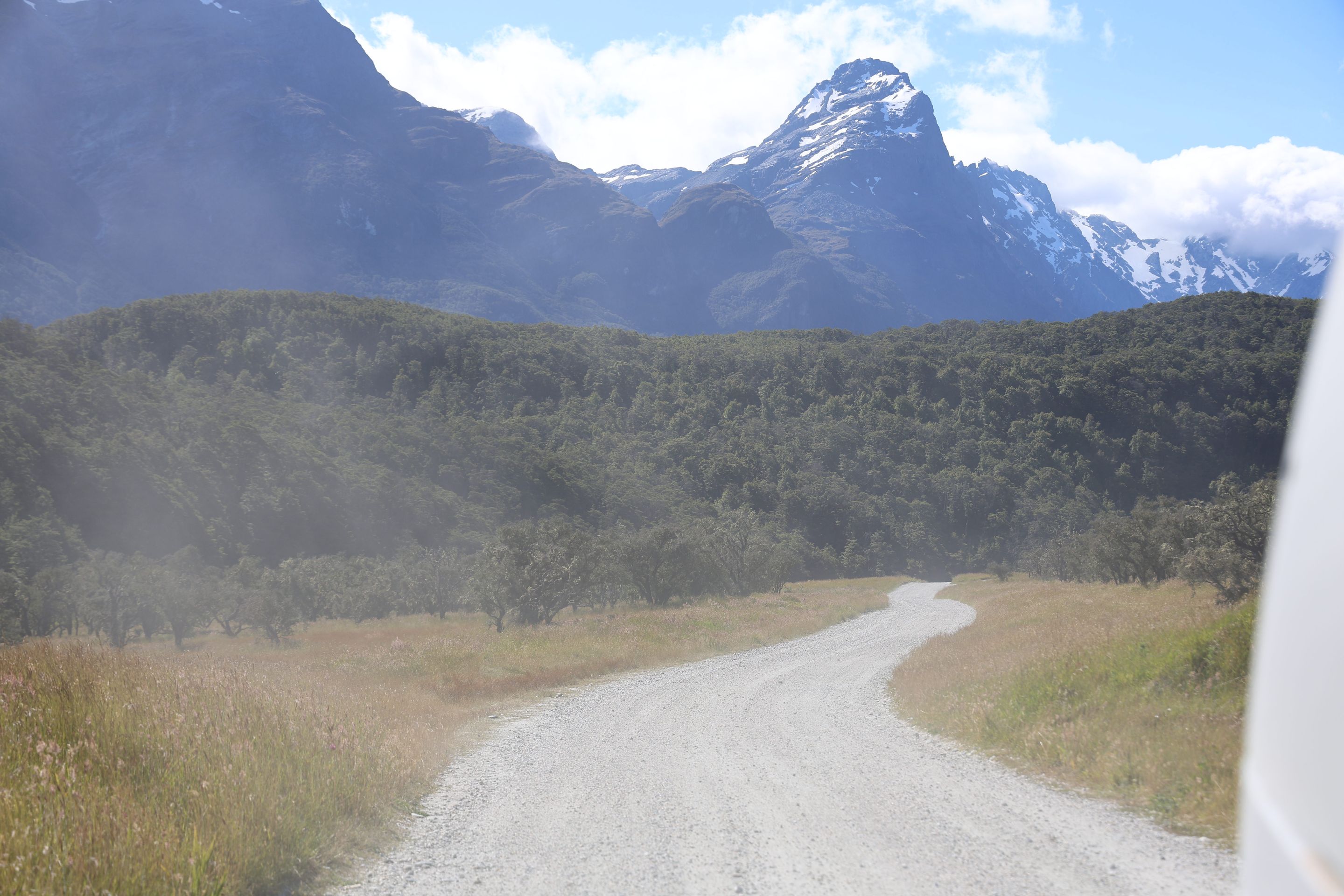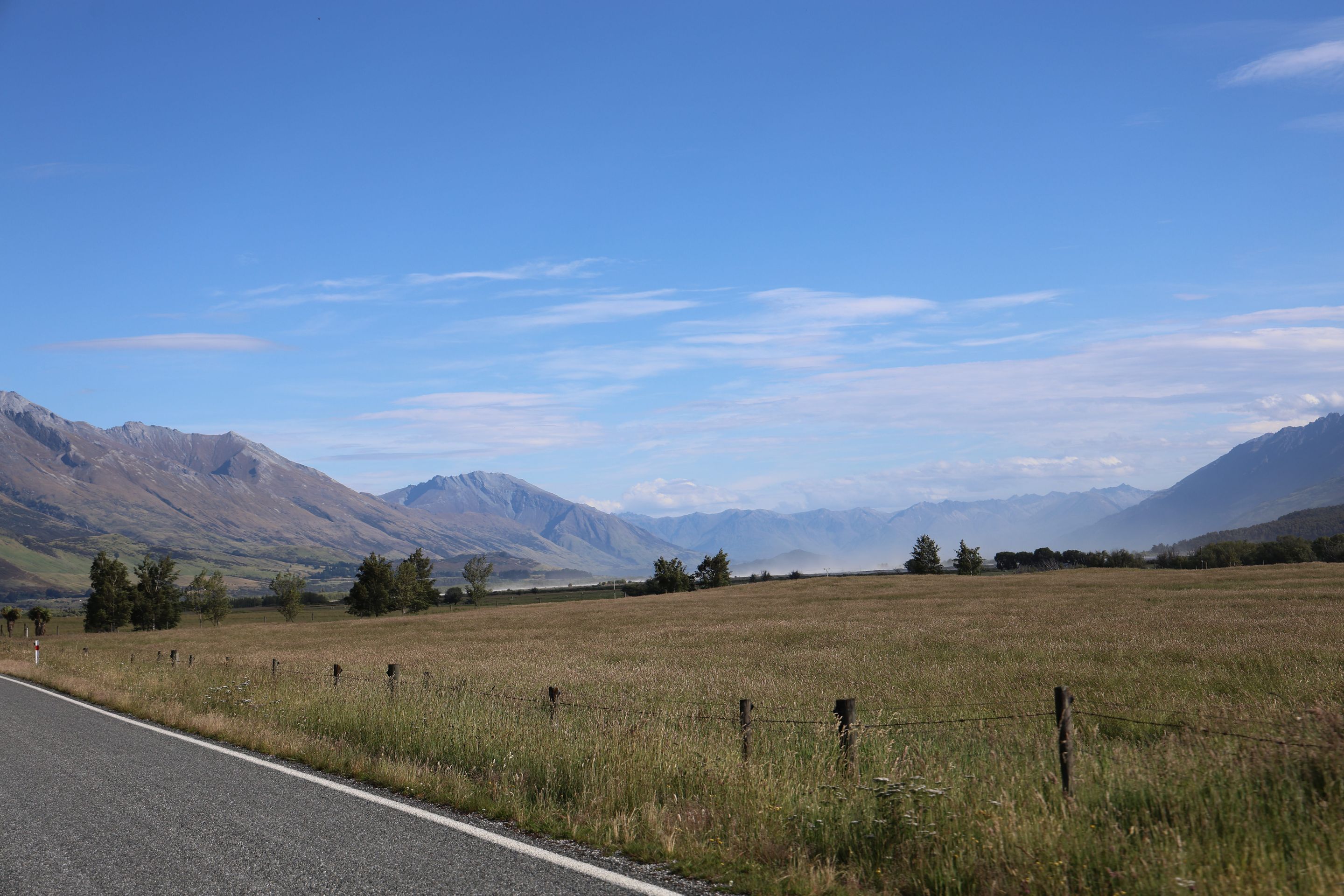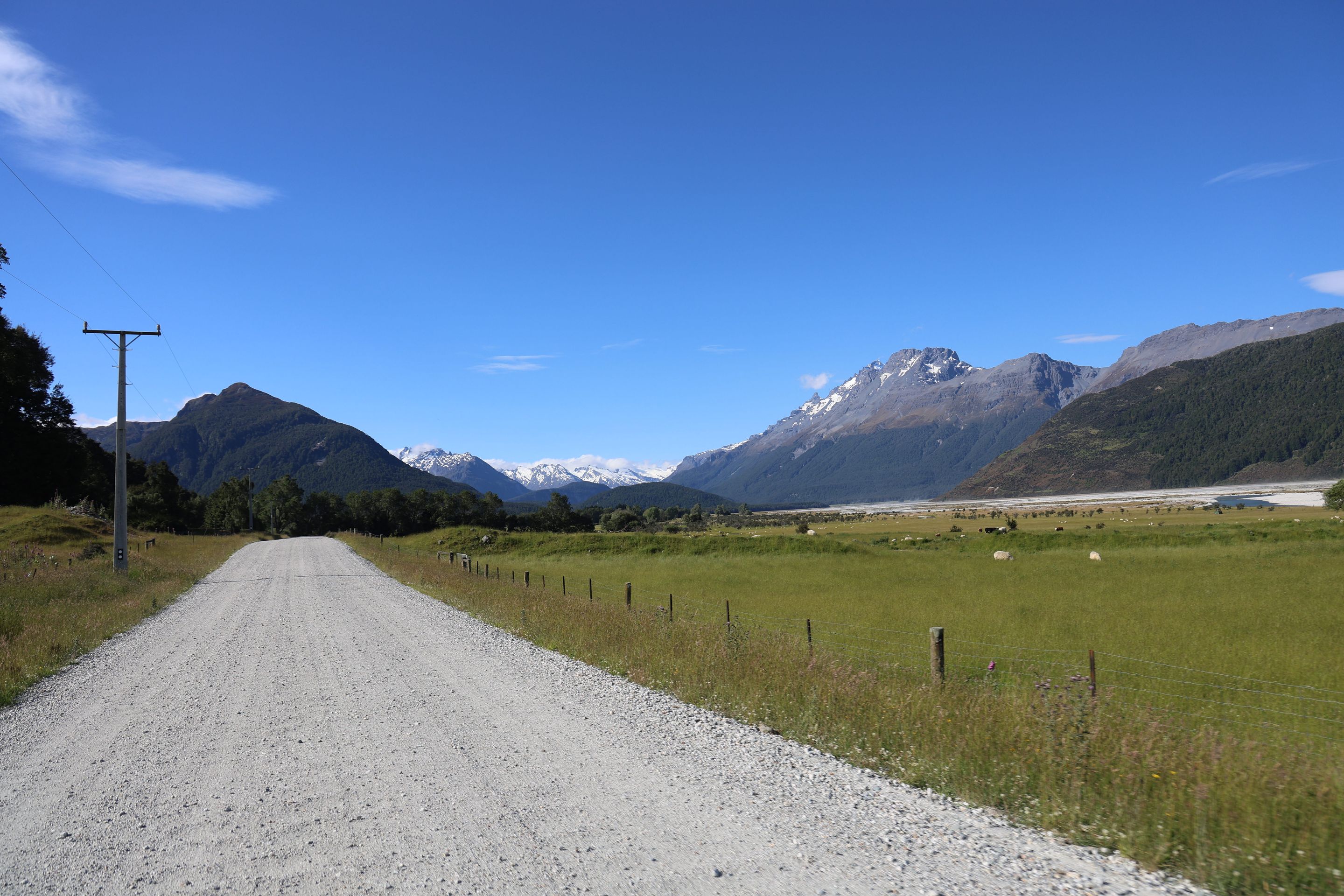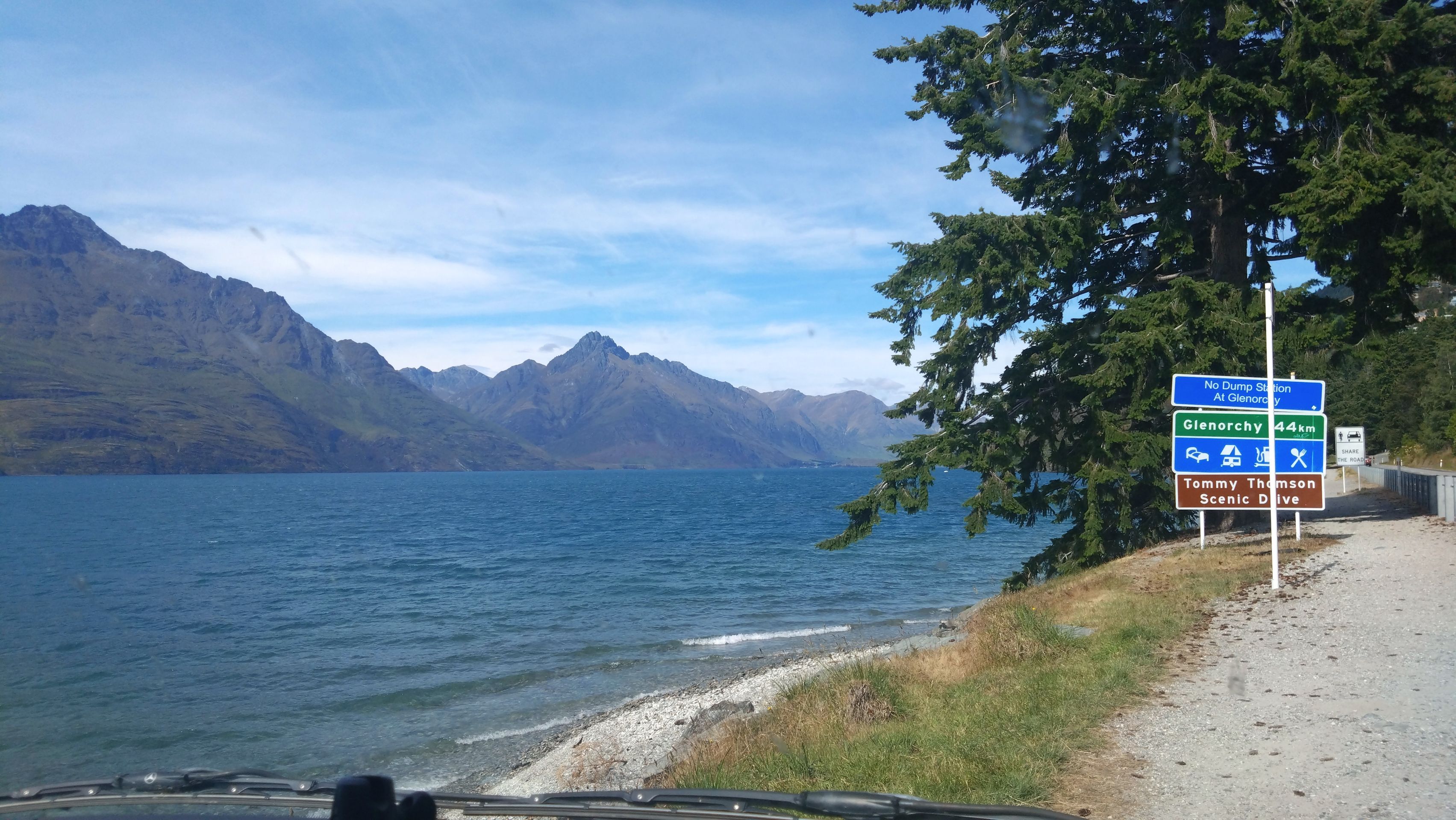 Nach einem kurzen Kaffee mache ich mich auf den Rückweg nach Queenstown auf, werde dann am Ufer des Wakatipu bleiben und zum nordöstlichen Bereich nach Glenorchy fahren, dort möchte ich mir Drehorte der Her der Ringe Triologie ansehen. Der wie ein abgebrochener Bumerang geformte Lake ist schnell erreicht, jetzt folge ich dem östliche Seeufer bis Queenstown, dann durchs Zentrum weiter nach Westen. Kurz vor Glenorchy passiere ich einen Heliport, die Flugverbindung von hier nach Milford Sound dauert 15 min, zu Fuß legt man den 35km Track in 2 Tagen zurück, ich bin jetzt 350 km außenrum gefahren...Hinter dem Ort beginnen die 15km Gavel Road nach Paradise, hier wurden Teile der Herr der Ringe - Filme gedreht (Stichwort Lothlorien, Isengard, Die zwei Türme).