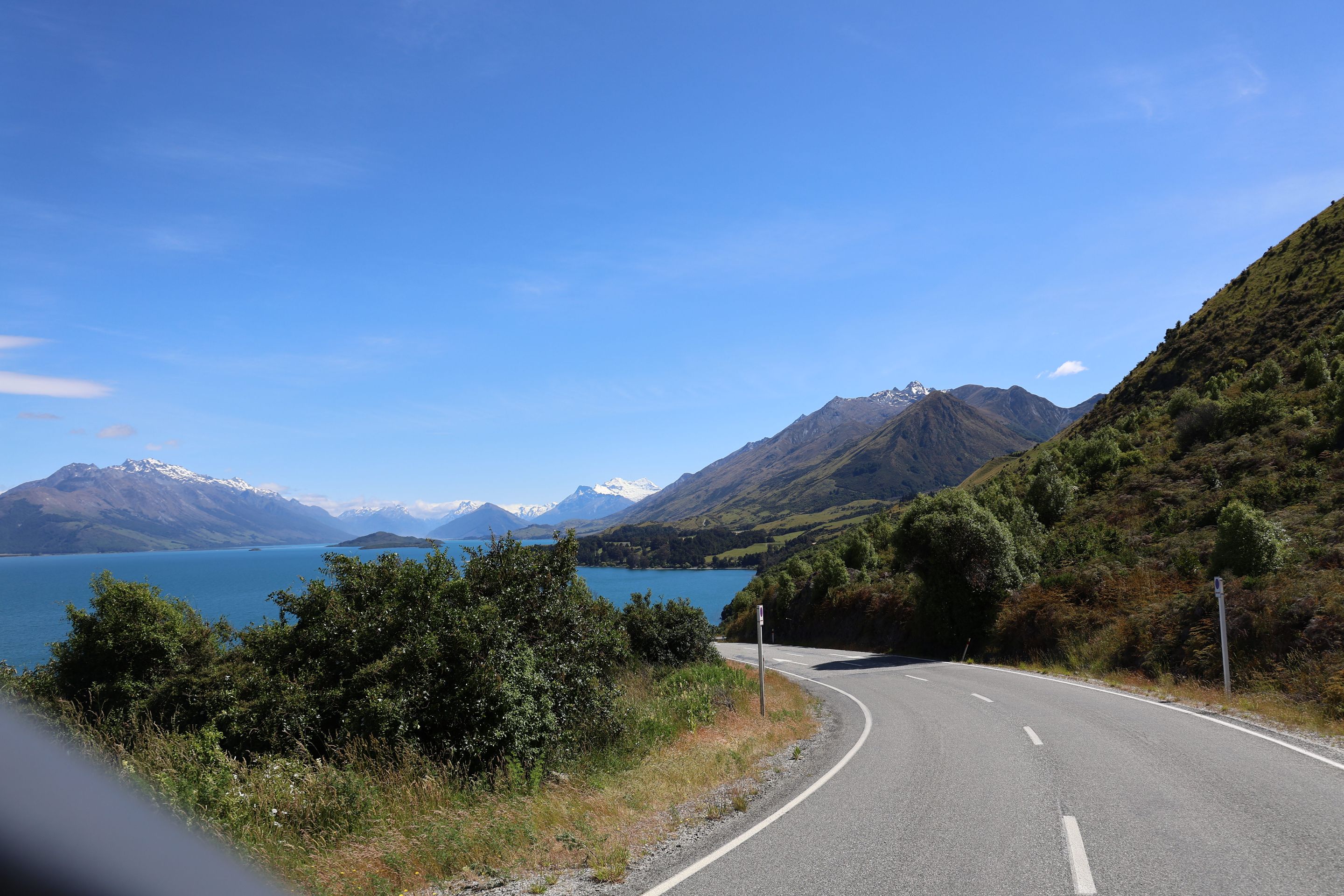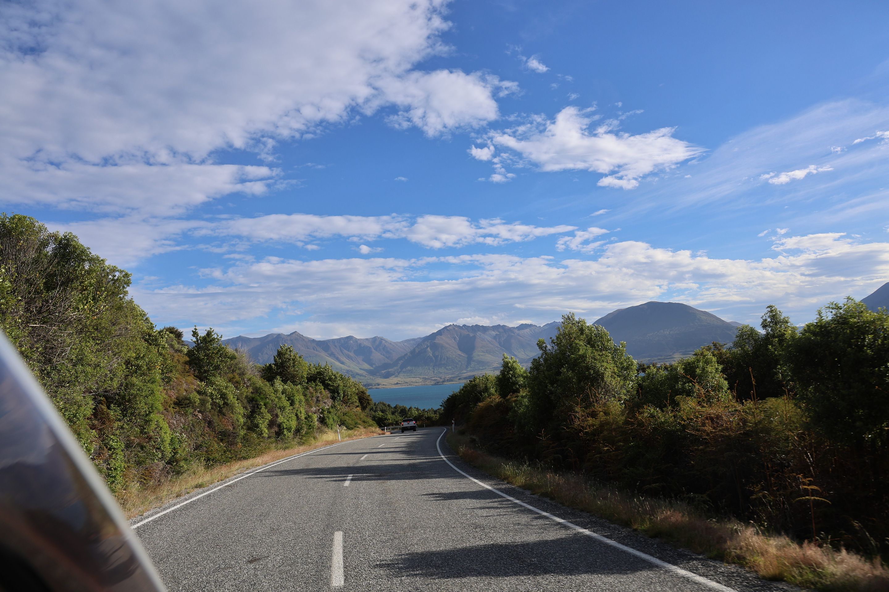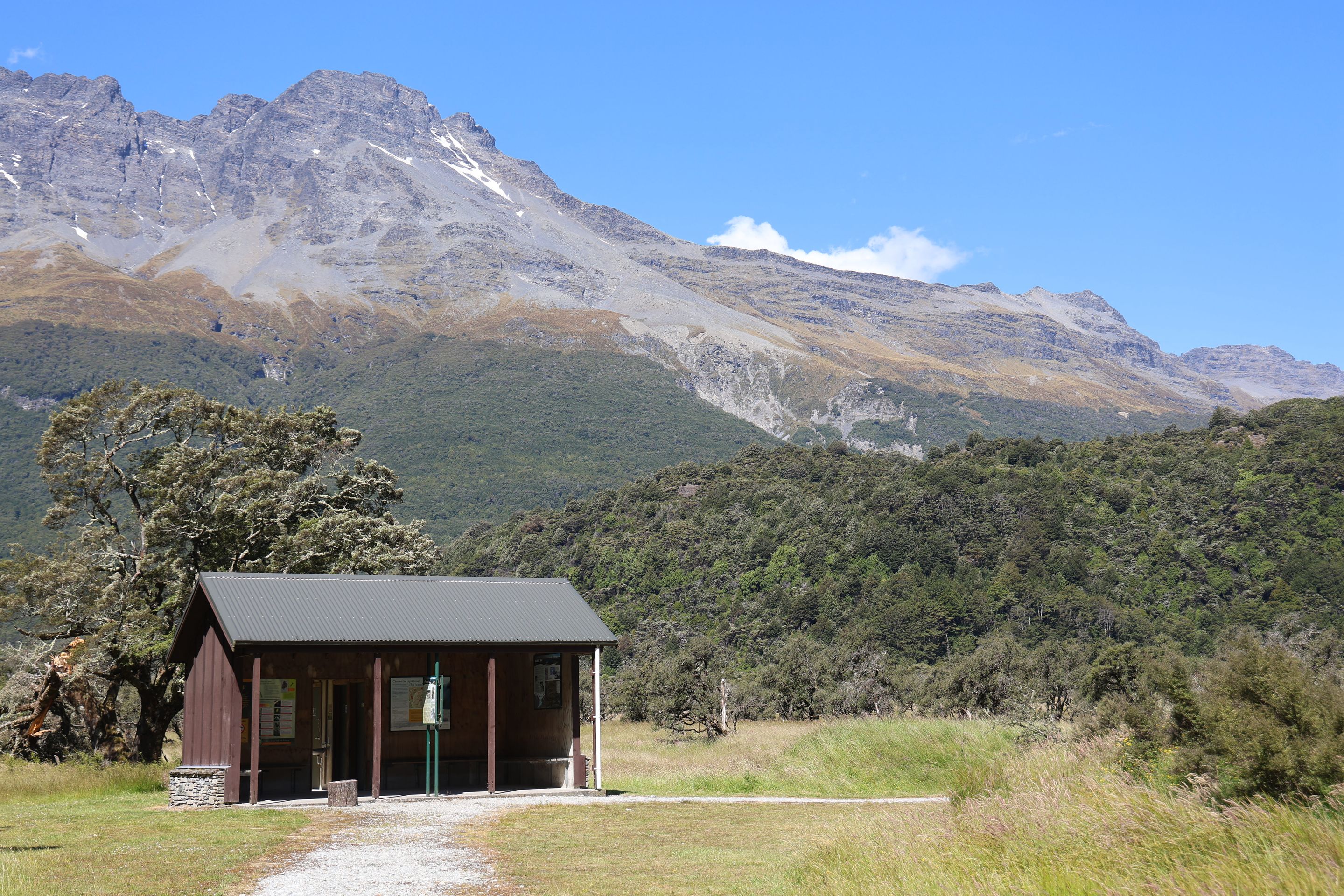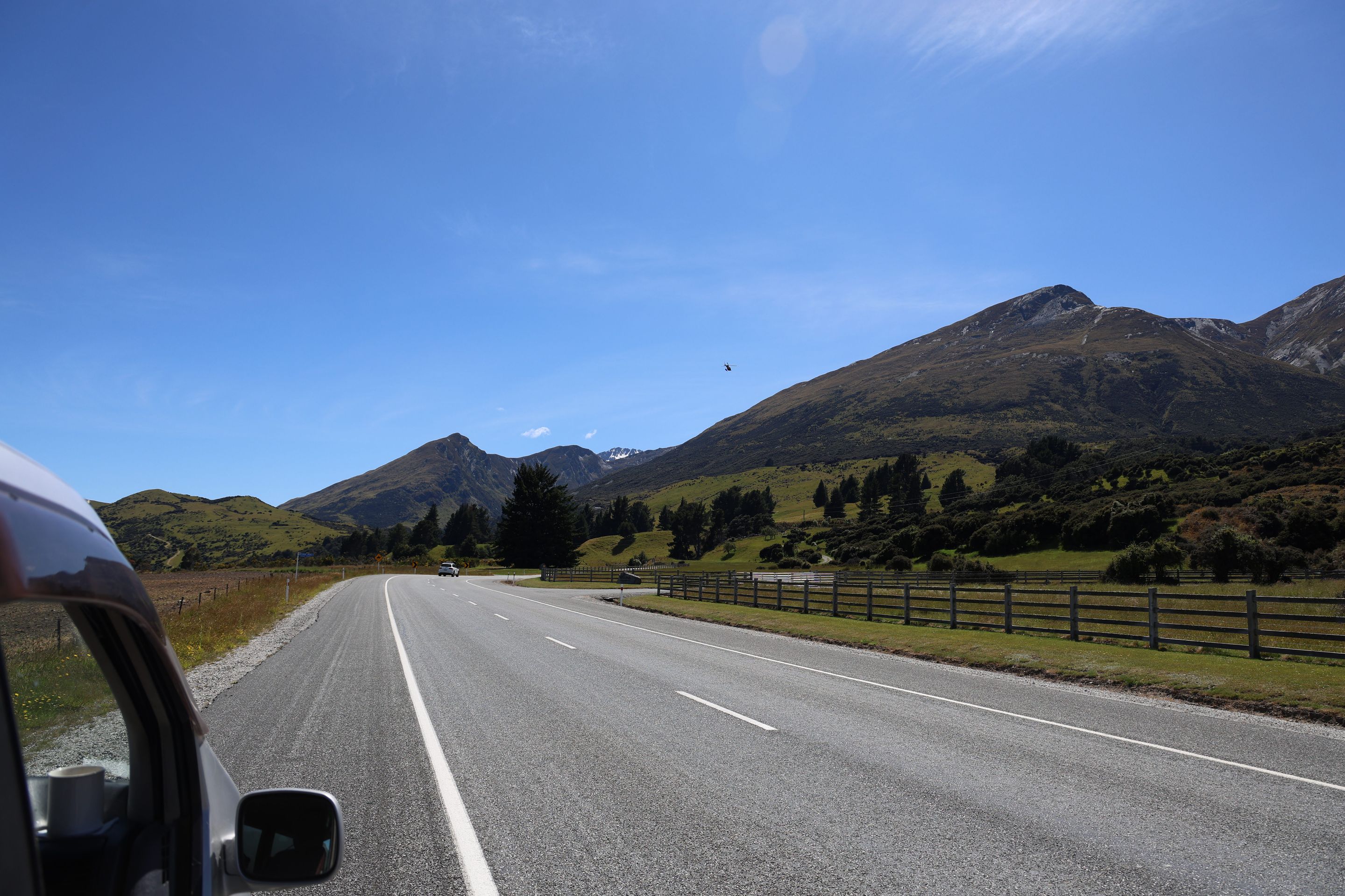 Nach einem kurzen Kaffee mache ich mich auf den Rückweg nach Queenstown auf, werde dann am Ufer des Wakatipu bleiben und zum nordöstlichen Bereich nach Glenorchy fahren, dort möchte ich mir Drehorte der Her der Ringe Triologie ansehen. Der wie ein abgebrochener Bumerang geformte Lake ist schnell erreicht, jetzt folge ich dem östliche Seeufer bis Queenstown, dann durchs Zentrum weiter nach Westen. Kurz vor Glenorchy passiere ich einen Heliport, die Flugverbindung von hier nach Milford Sound dauert 15 min, zu Fuß legt man den 35km Track in 2 Tagen zurück, ich bin jetzt 350 km außenrum gefahren...Hinter dem Ort beginnen die 15km Gavel Road nach Paradise, hier wurden Teile der Herr der Ringe - Filme gedreht (Stichwort Lothlorien, Isengard, Die zwei Türme).