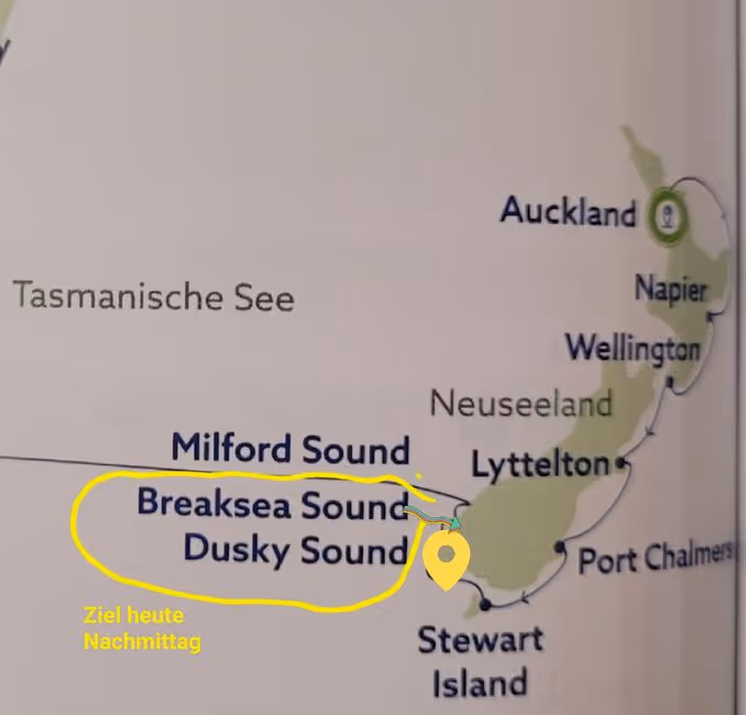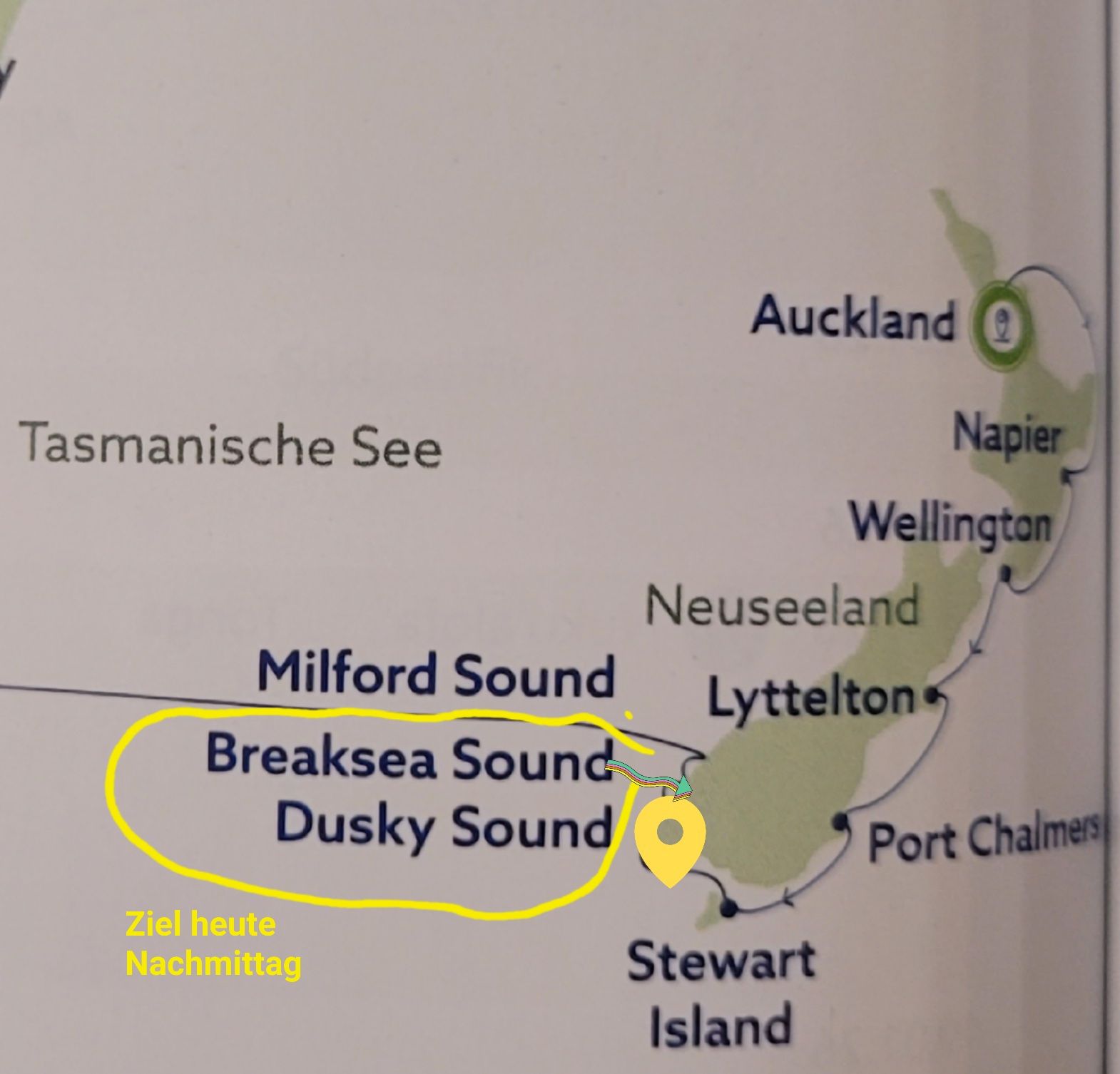 Da die Wettervorhersage heute kein Tendern auf Steward Island zugelassen hätte, wurde das Kreuzen im Dusky Sound und Breaksea Sound um einen Tag vorgezogen.