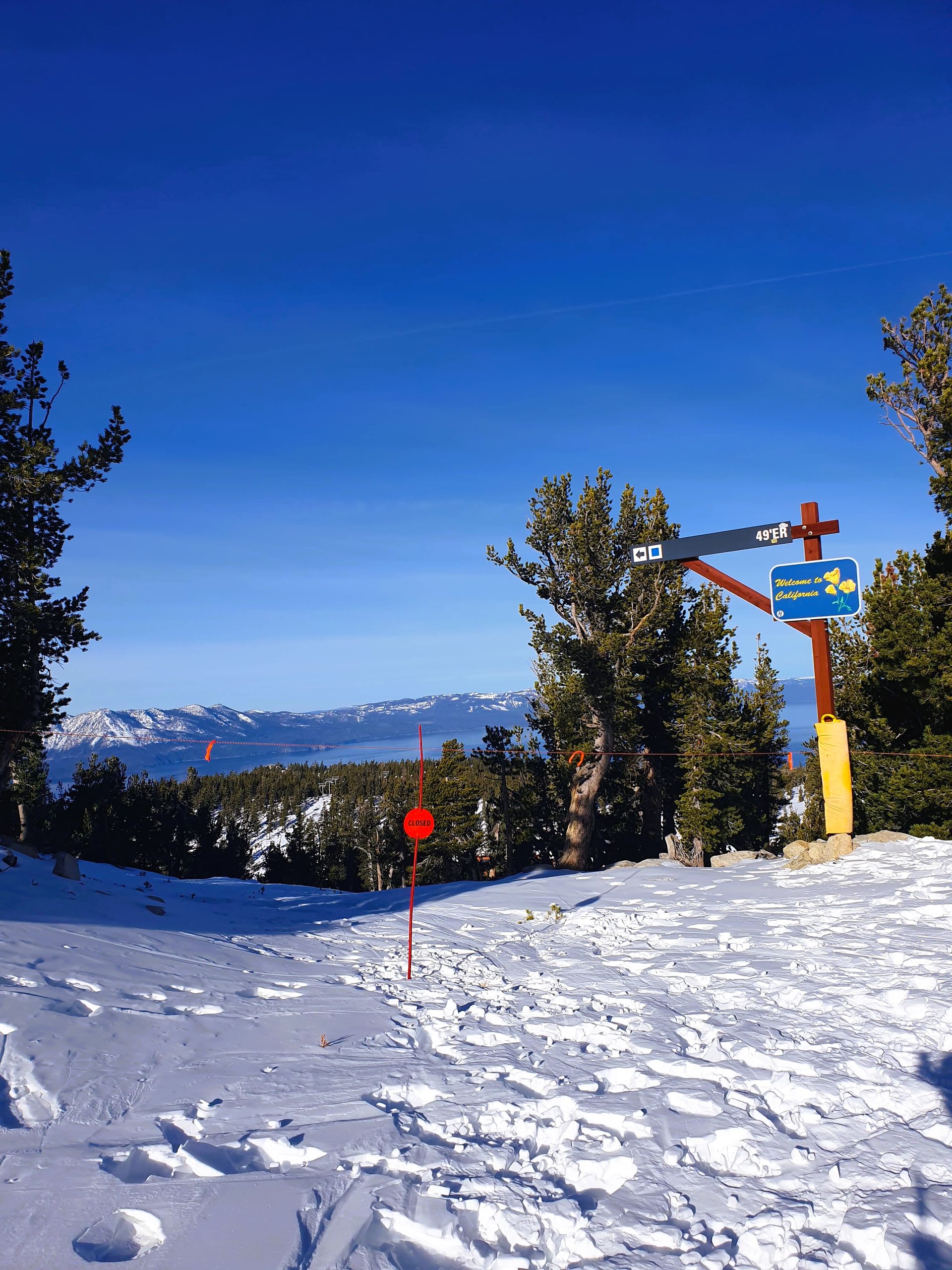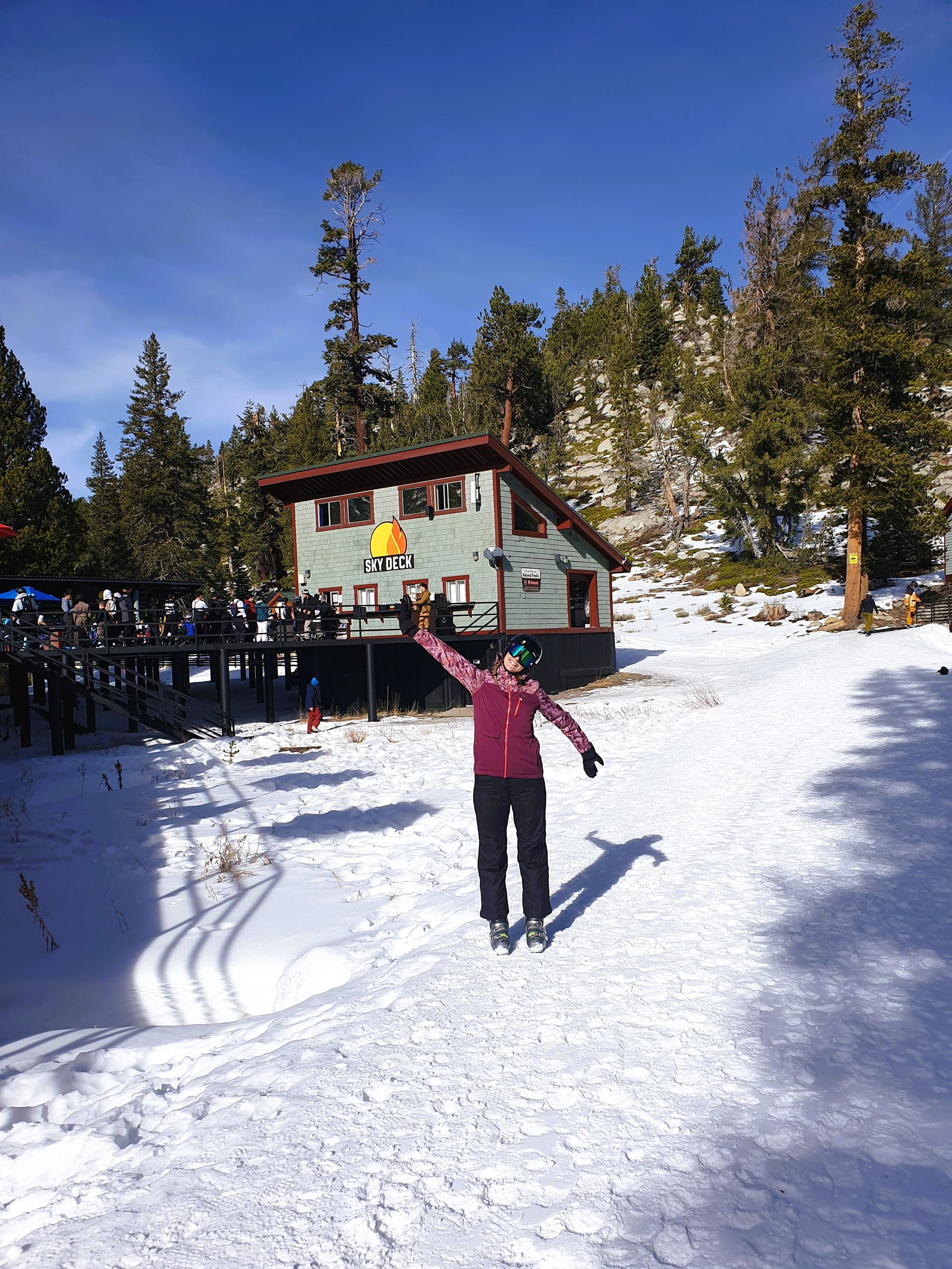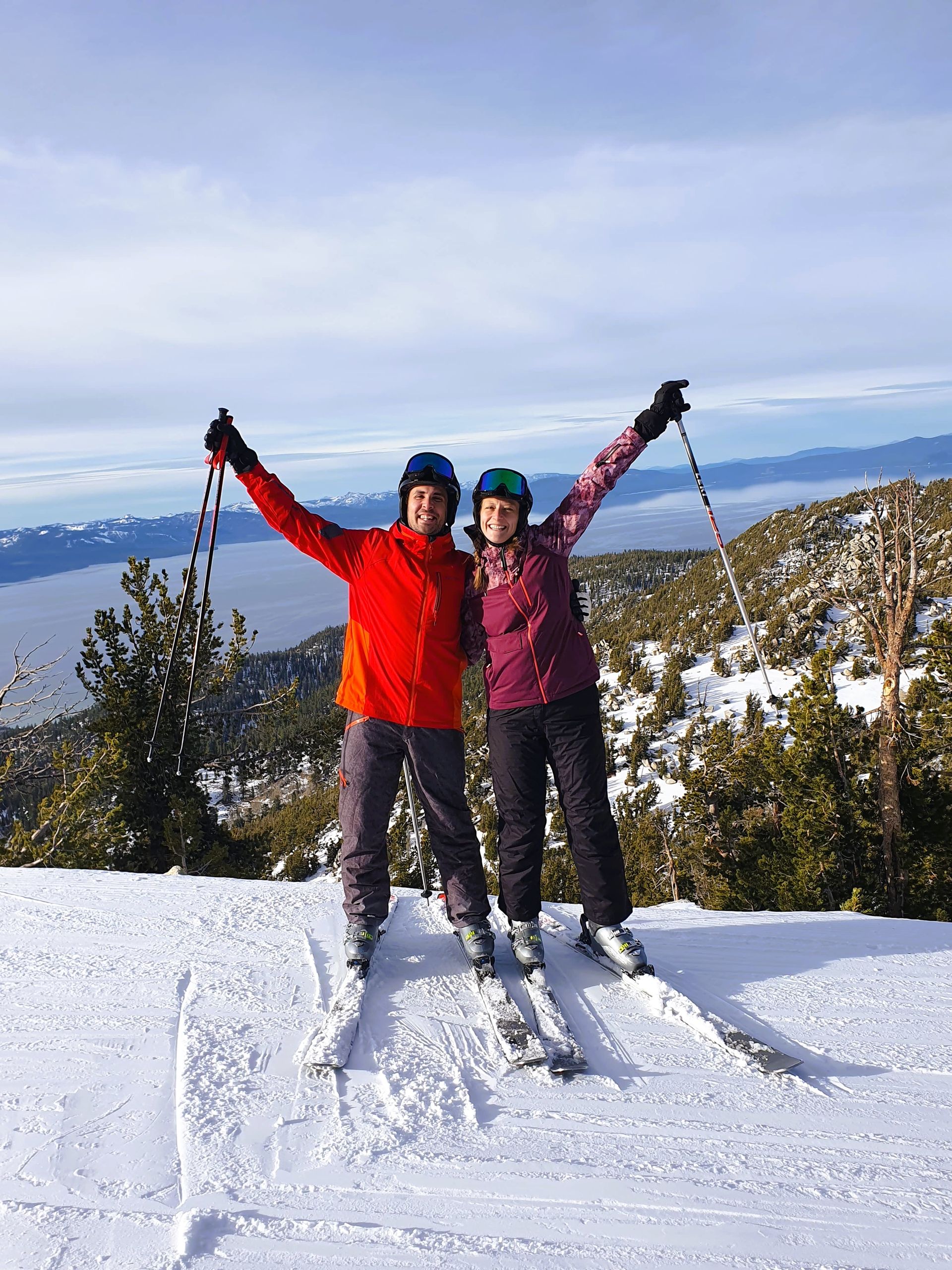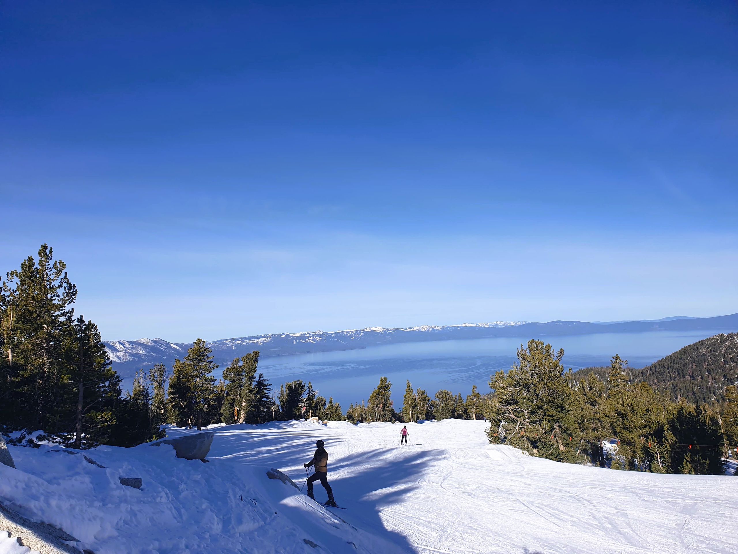 Samstag morgen ging es los. Unser erstes Skigebiet war das "Heavenly Ski Resort", welches direkt an unserem Hotel lag. Wir konnten also zu Fuß zur Gondel laufen. Nachdem wir unsere Skipässe schon vorher gekauft und auf dem Handy hatten, konnte es direkt losgehen (Man lässt einfach sein Bluetooth an und schon wird der Skipass in der Jacke gescannt). Bei bestem Wetter fuhren wir die Pisten ab. Heavenly ist ein etwas kleineres Skigebiet, ist jedoch dafür bekannt einen tollen Ausblick auf den Lake Tahoe während des Skifahrens zu haben. Das können wir absolut bestätigen! Zur Mittagspause ging es in eine "Hütte" im Skigebiet. Wie erwartet gab es hier leider keinen Kaiserschmarrn, Knödeltris oder Apfelstrudel wie normalerweise beim Ski fahren. Wir mussten uns mit einfachen Sandwiches begnügen.. Dies lag jedoch daran, dass das Skigebiet erst die zweite Woche offen hatte und noch nicht viele Gäste da waren. Normalerweise gibt es hier BBQ, also alle mögliche Auswahl an Burgern zum Mittagessen, also typisch amerikanisch. Den Nachmittag über machten wir weiter das Skigebiet unsicher.
