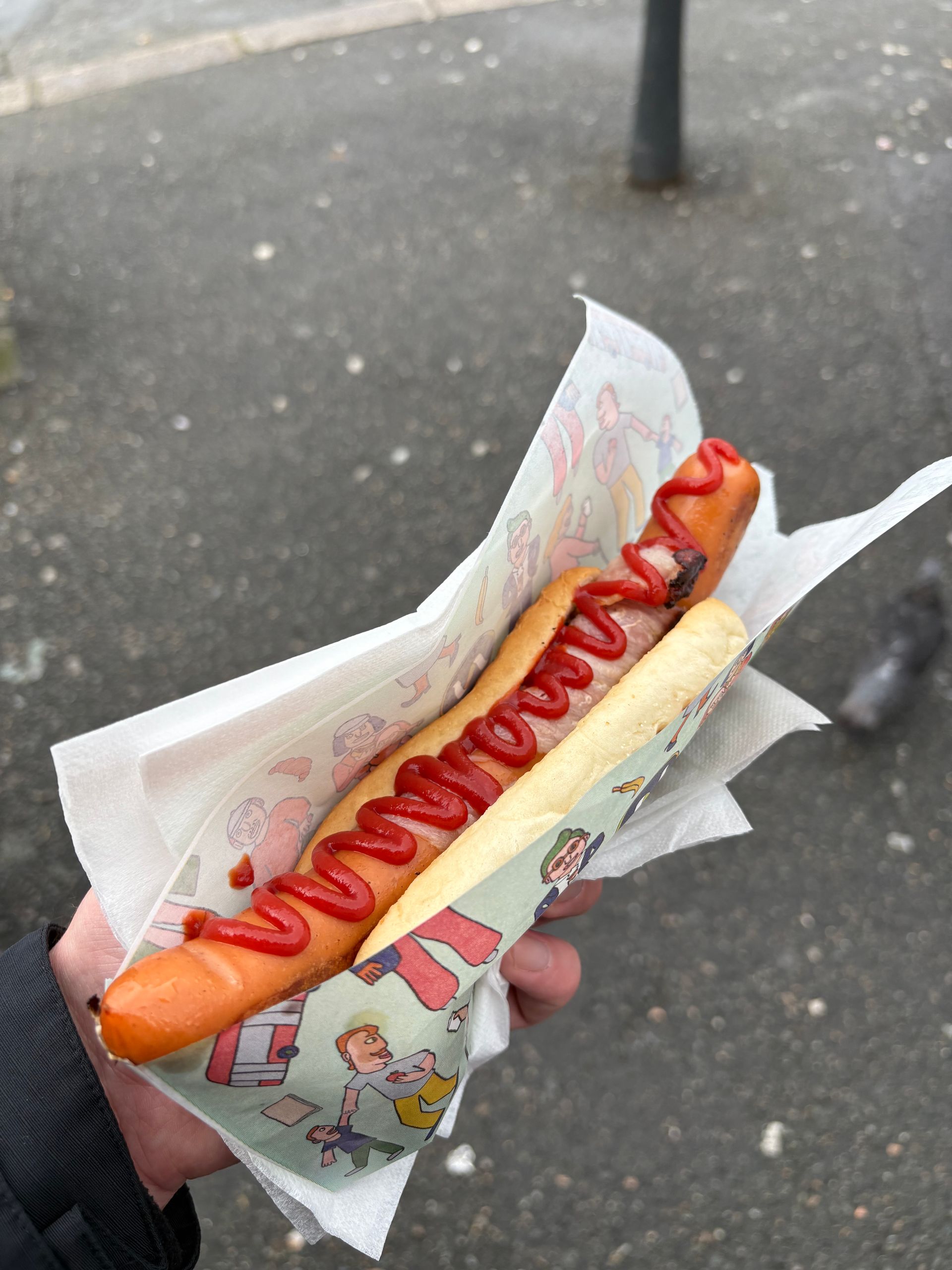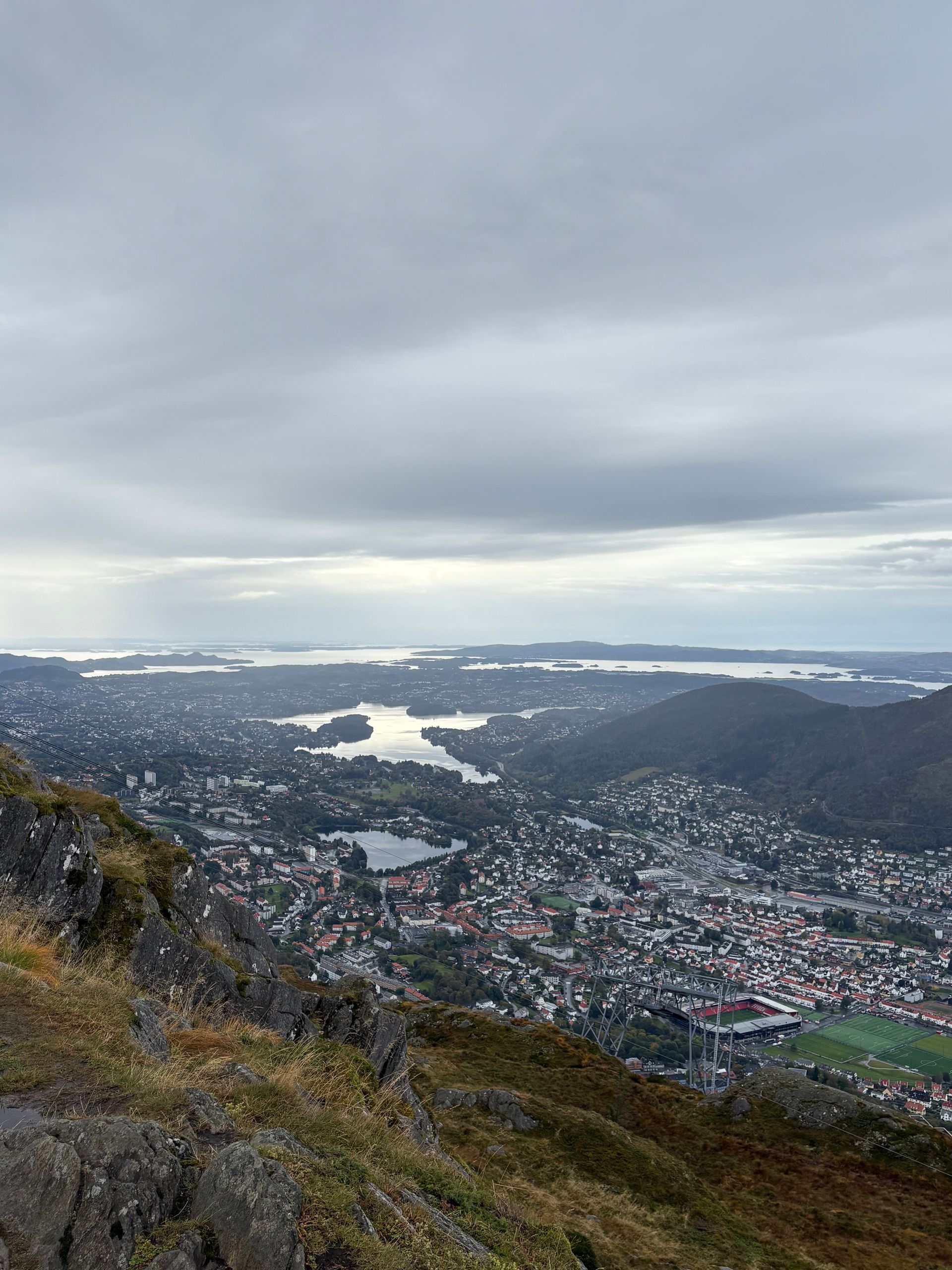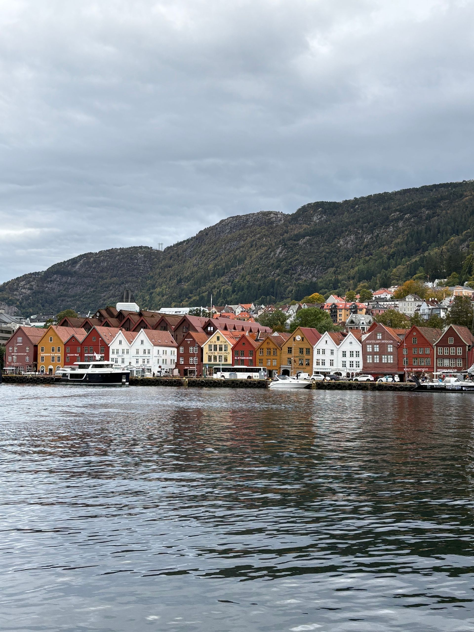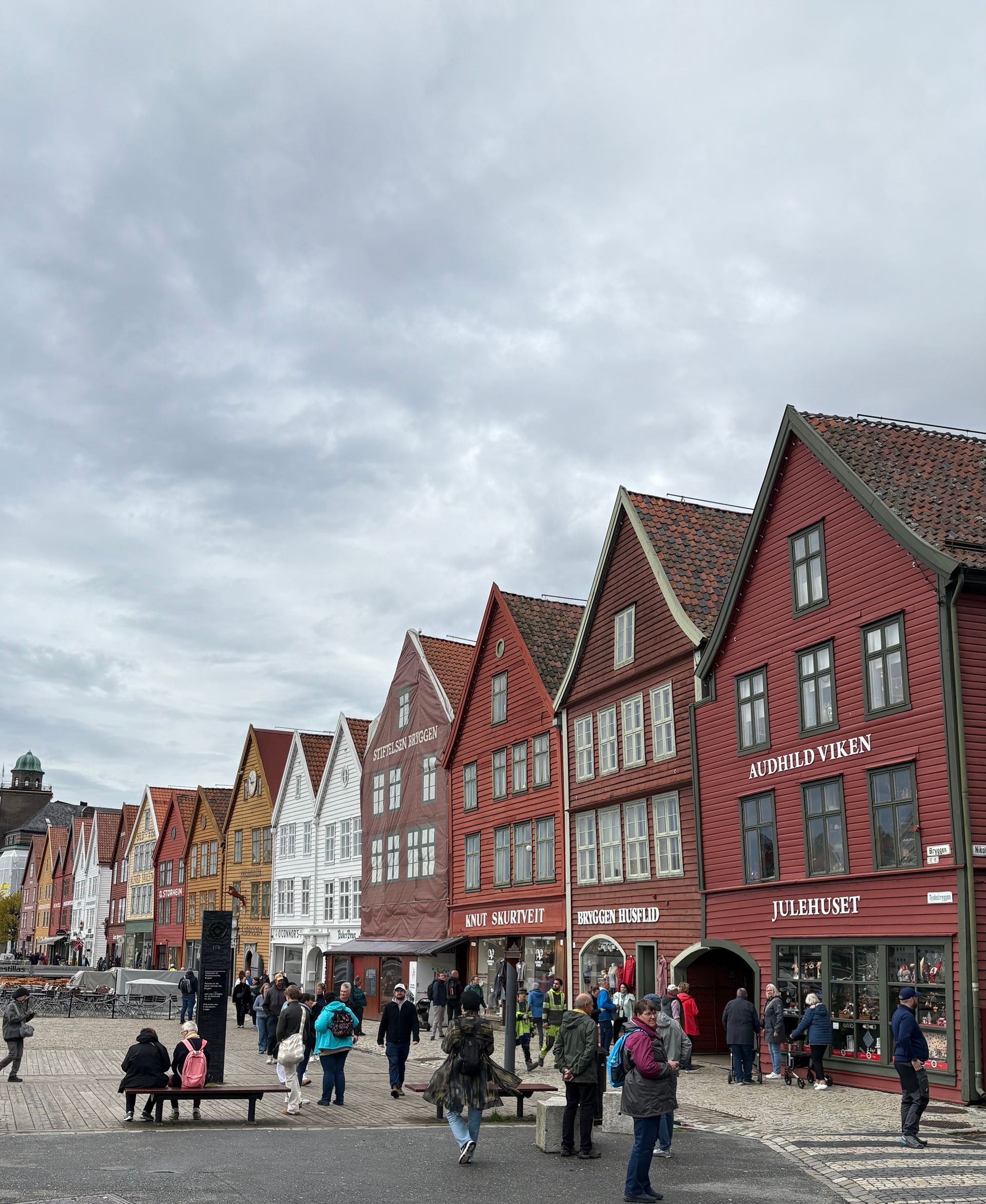 Das Wetter in Bergen ist üblicherweise geprägt durch Wolken und Regen. Dementsprechend sollte man sich anziehen. Man wird es keine Ewigkeiten da oben aushalten 😅. Dennoch hat es sich gelohnt und wir konnten weit schauen. In dem Timeslot unseres Ausflugs hat es auch nicht geregnet 👍🏻. Nach einer kleinen Stärkung im Restaurant (Preise waren in Ordnung), sind wir mit der Seilbahn hinunter gefahren. Anschließend ging es mit dem Bus Richtung Nova. Elisa ist zum Aufwärmen direkt weitergefahren zum Schiff. Ich hingegen bin am Fischmarkt ausgestiegen und bin durch die Innenstadt geschlendert. Ich wollte unbedingt die „bunten Häuser“ besichtigen, die Bergen charakterisieren. Das habe ich auch getan. Vor Ort gestalten sich die Dinge gar nicht so einfach. Das Wetter war ungemütlich, die Hauptstraße mit viel Verkehr (Bussen auch besonders) verläuft direkt vor den Häusern. Bauarbeiten und Baustellenfahrzeuge sind am Rumwerkeln, viele Touristen laufen umher … aber dennoch habe ich ein paar Bilder geknipst und für uns Magnete mitgebracht. Auf dem Rückweg durfte ein Hotdog natürlich nicht fehlen 😃. Weiterhin habe ich viele Holzhäuser gesehen, die