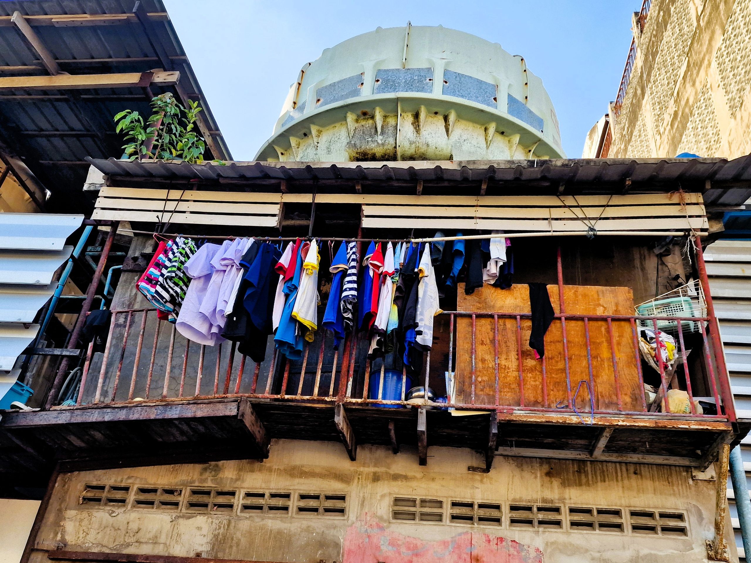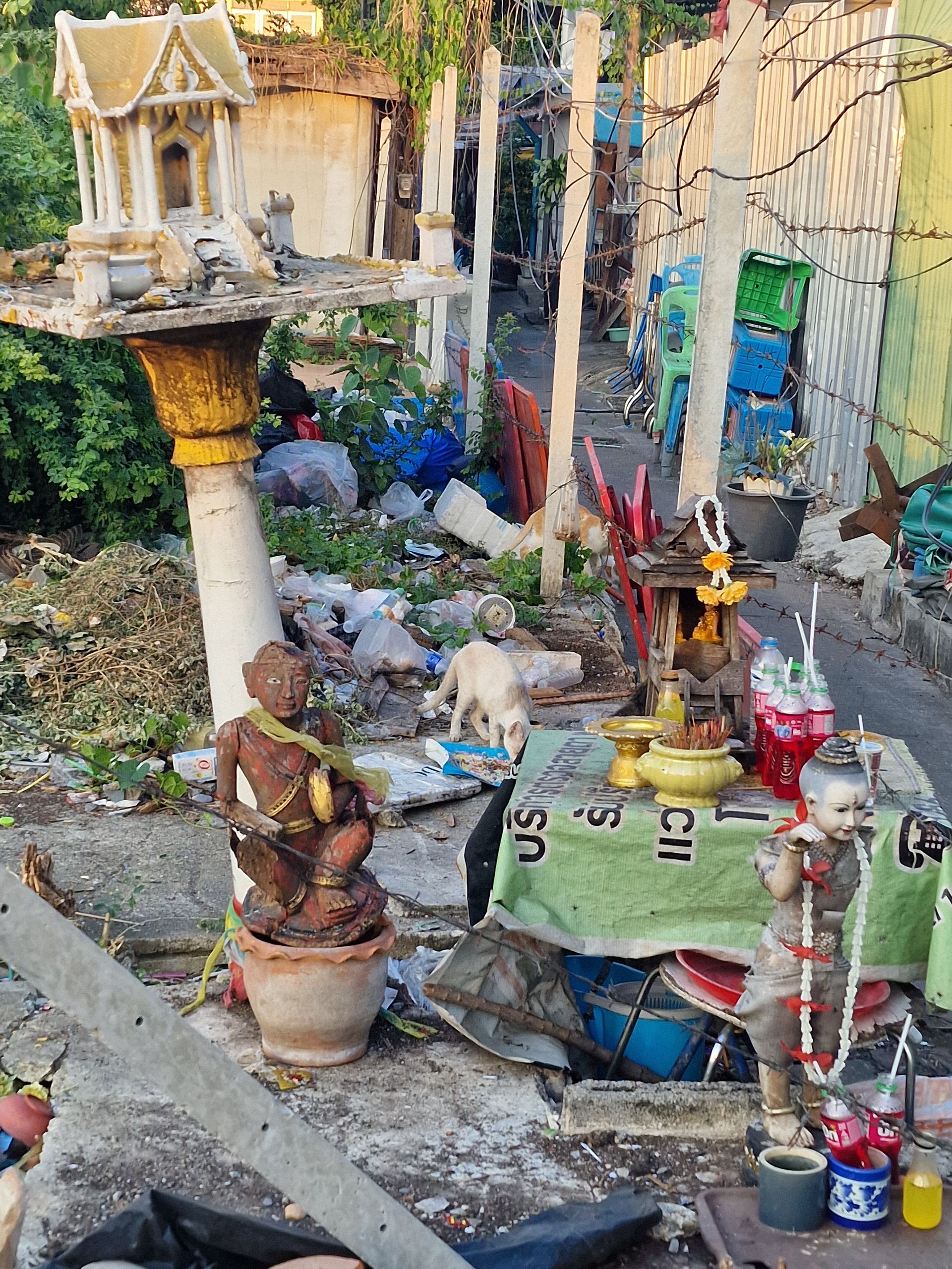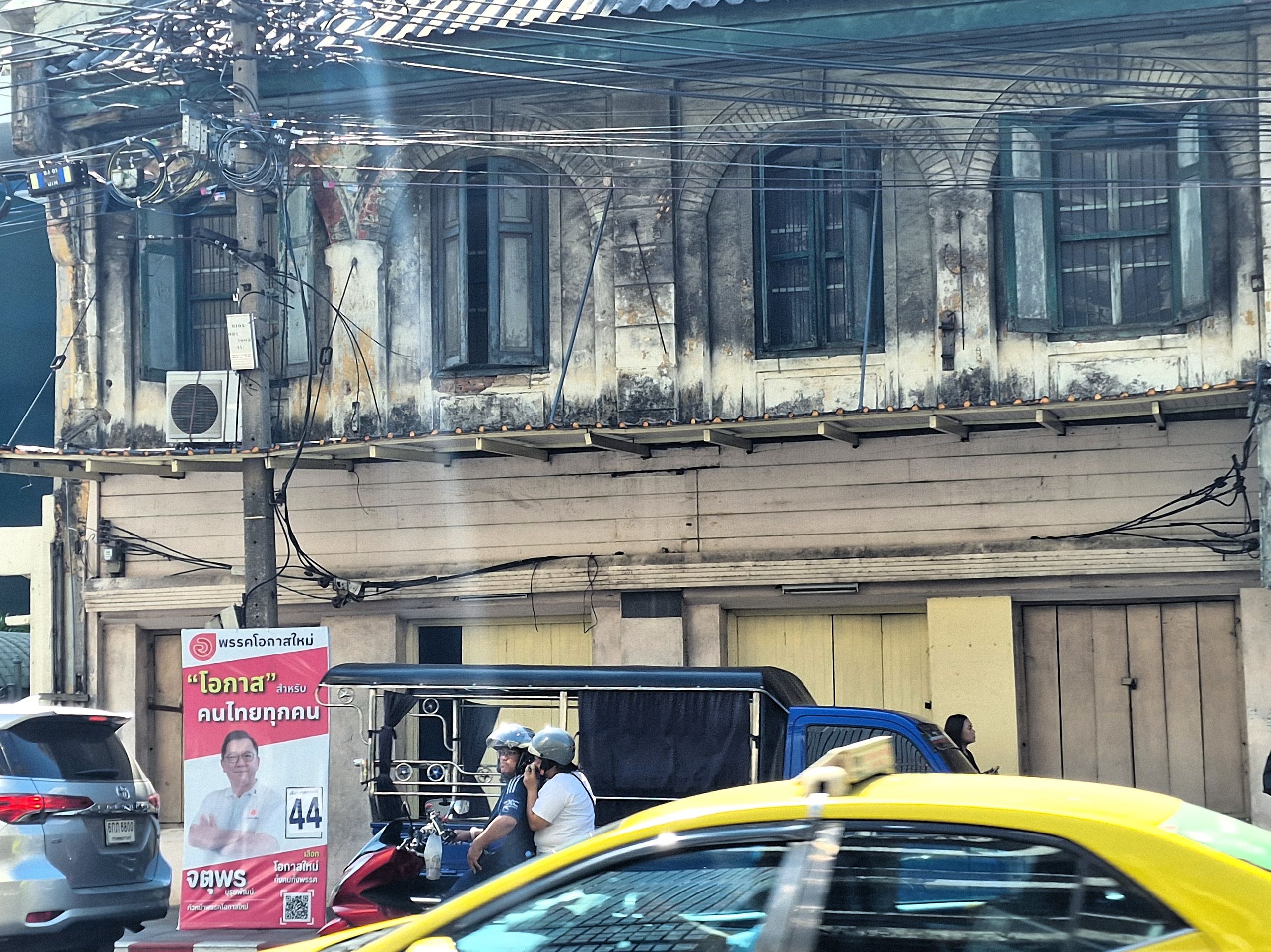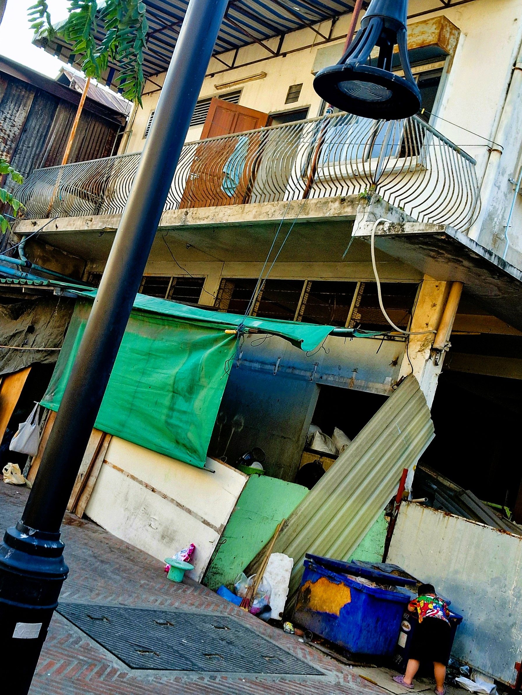 Wir kommen am Flughafen an, schlagen uns mit unsren Koffern und Zeit mit dem öffentlichen Transport durch bis zu unsrer Adresse... und erleben auf der Prachtstraße Ratchadamnoen rechts, links Bauzäune (es werden die alten Häuser saniert), in der Mitte ebenso (eine Metrostrecke wird gebaut) und auf den Gehsteigen obdachlose Männer und Frauen, Jung und Alt, mit armseligem Hab und Gut, liegend oder sitzend auf Pappkartons. Ich weiß nicht, wie viele, habe nicht gezählt, aber mehr als mehrere, eher zig hausen auf dem Bürgersteig. Wir gehen um die Ecke, es hört nicht auf, dazu geschlossene Läden, verriegelte Häuser. Nächste Ecke, nächste Ecke, wir gehen durch eine Urinwolke und stehen vor unserm Hotel. Beide völlig fassungslos.