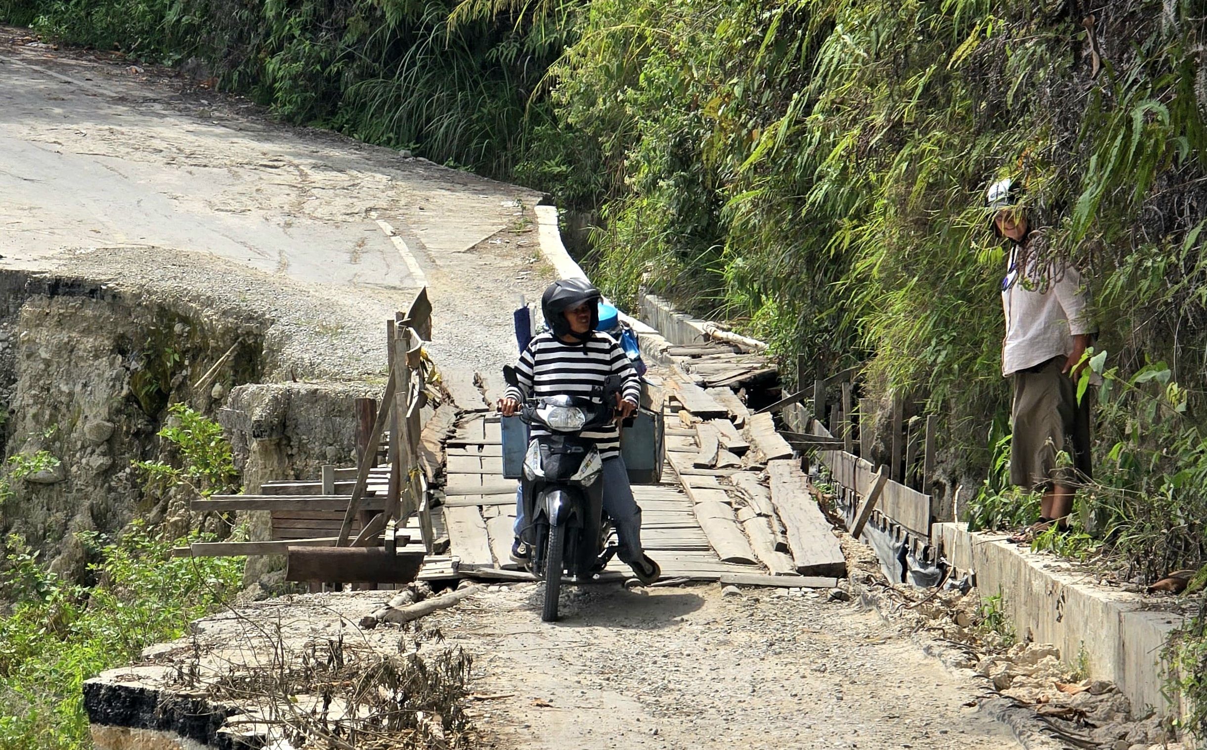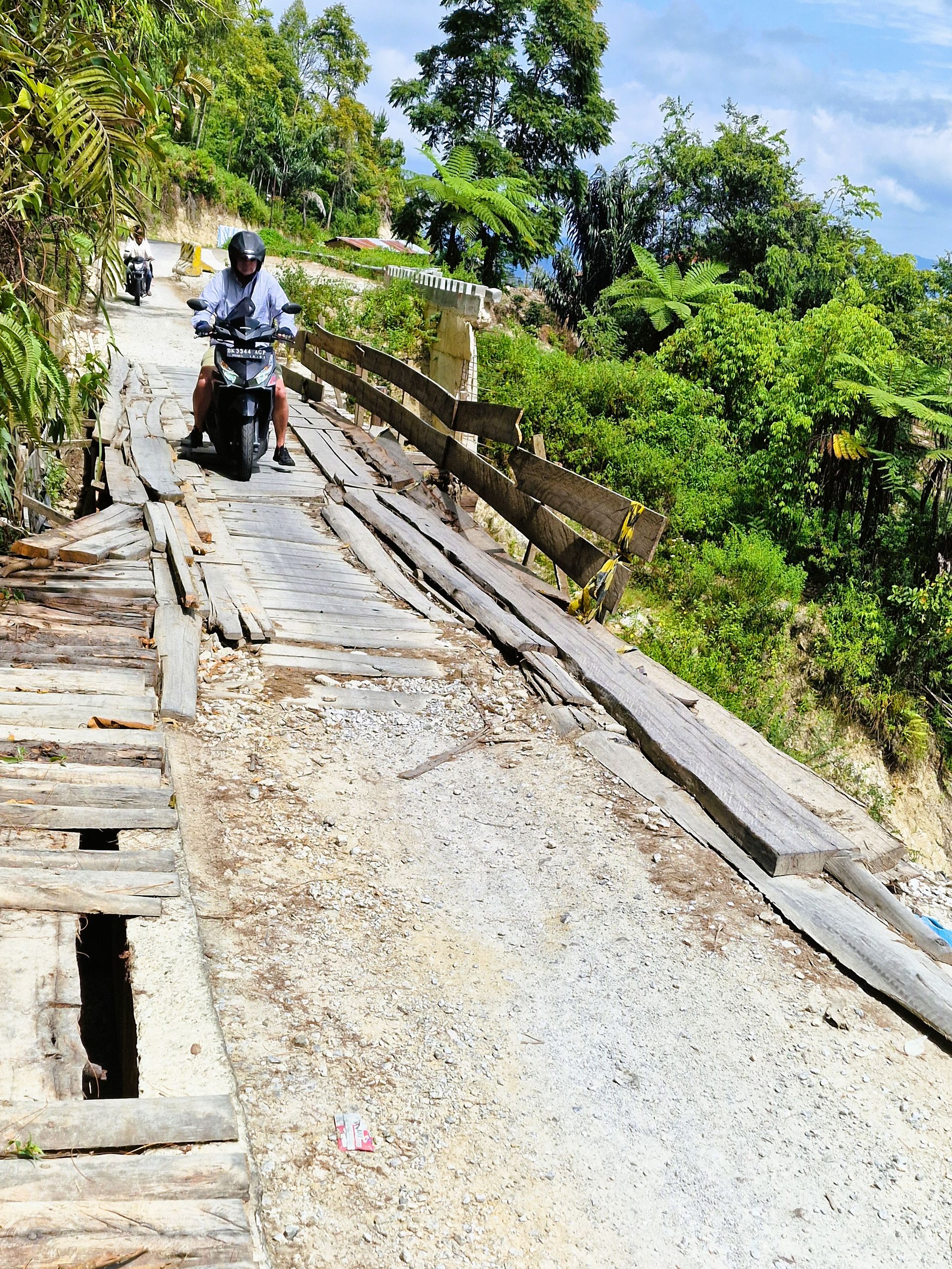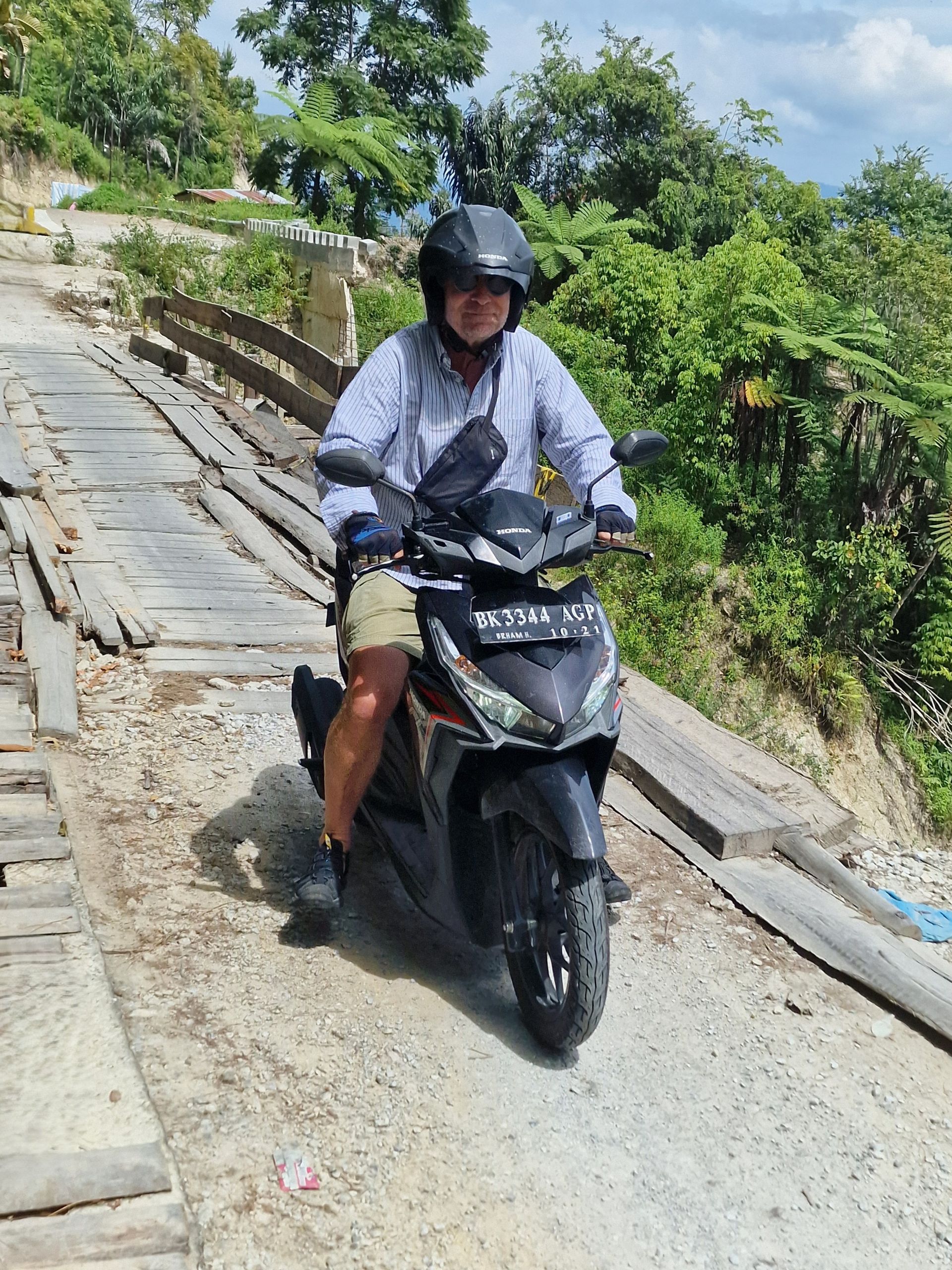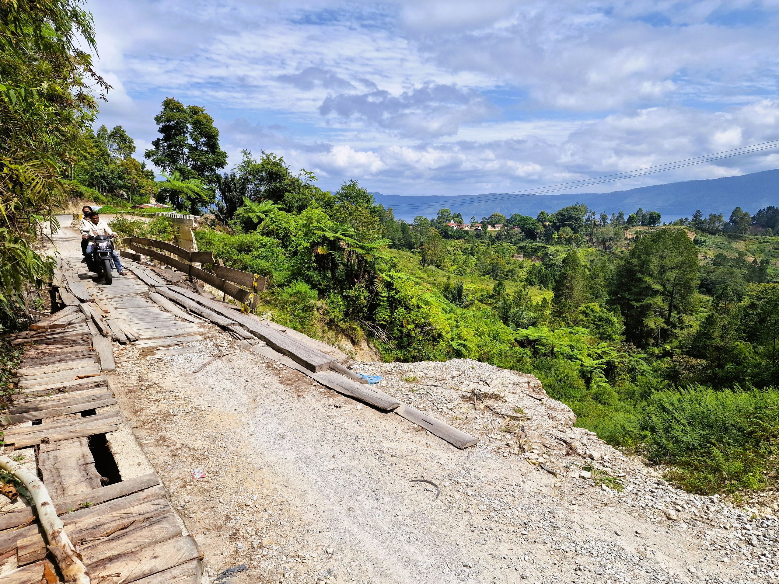Tagsüber machen wir uns mit dem Moped auf, fahren hoch auf das Plateau von Samosir, der Insel im Tobasee. Die Straße, vor 8 Jahren noch gut, ist zum Teil ab- und an einer Stelle ganz weggebrochen. Mit Brettern ist ein Steg zum Überqueren gezimmert. Schlaglöcher und Spalten erschweren das weitere Fahren für uns. Es ist schon immer in Sumatra eine Mammutaufgabe gewesen, Straßen zu bauen und, vor allem, instand zu halten. Sumatra ist, wie ganz Indonesien, tektonisch aktiv und der tropische Regen tut an der, schier niemals endenden Aufgabe des Straßenbaues, sein letztes dazu.