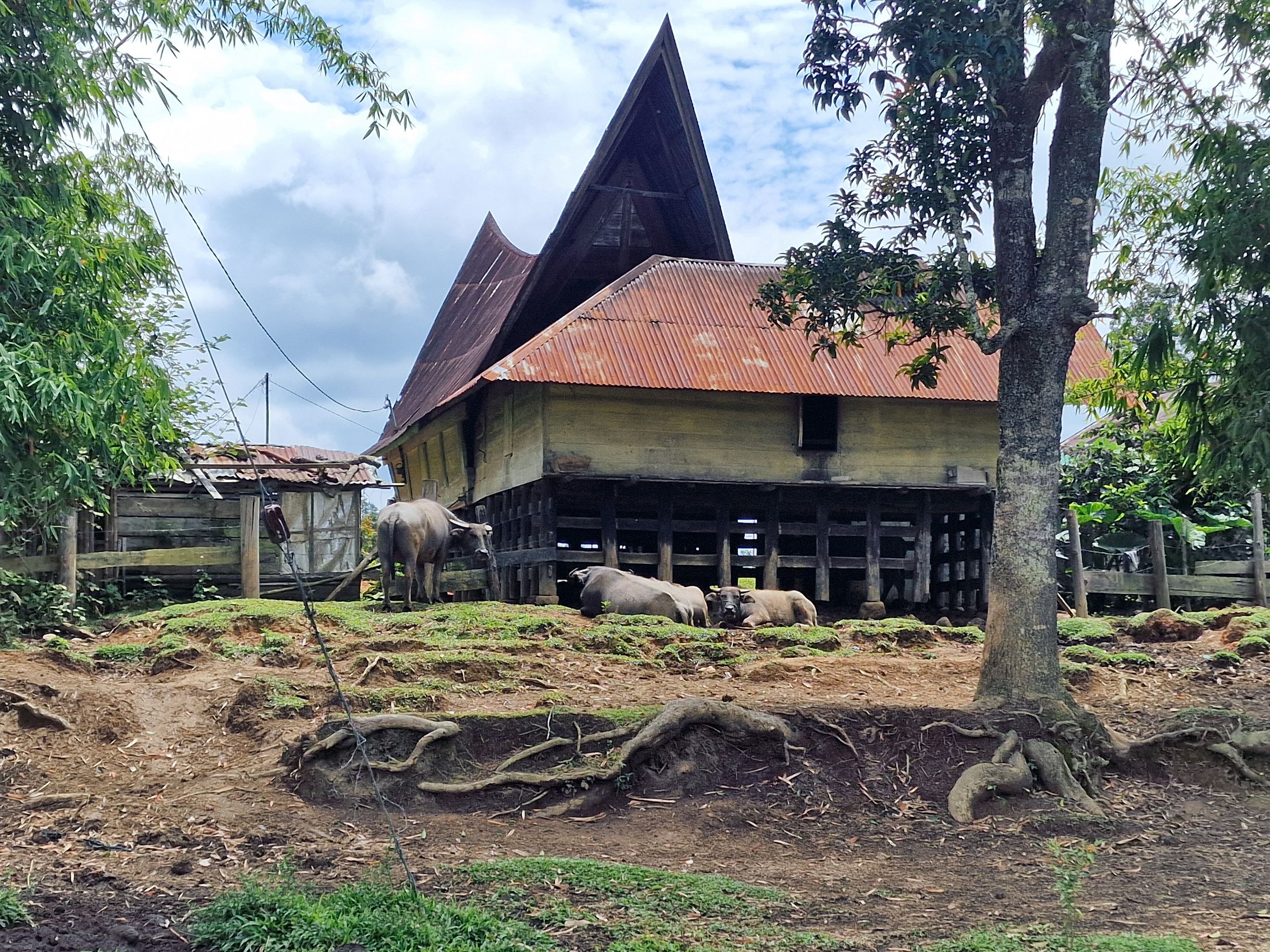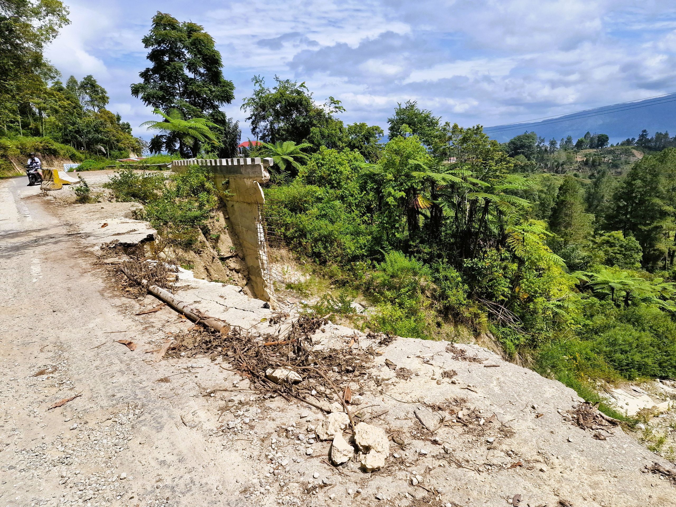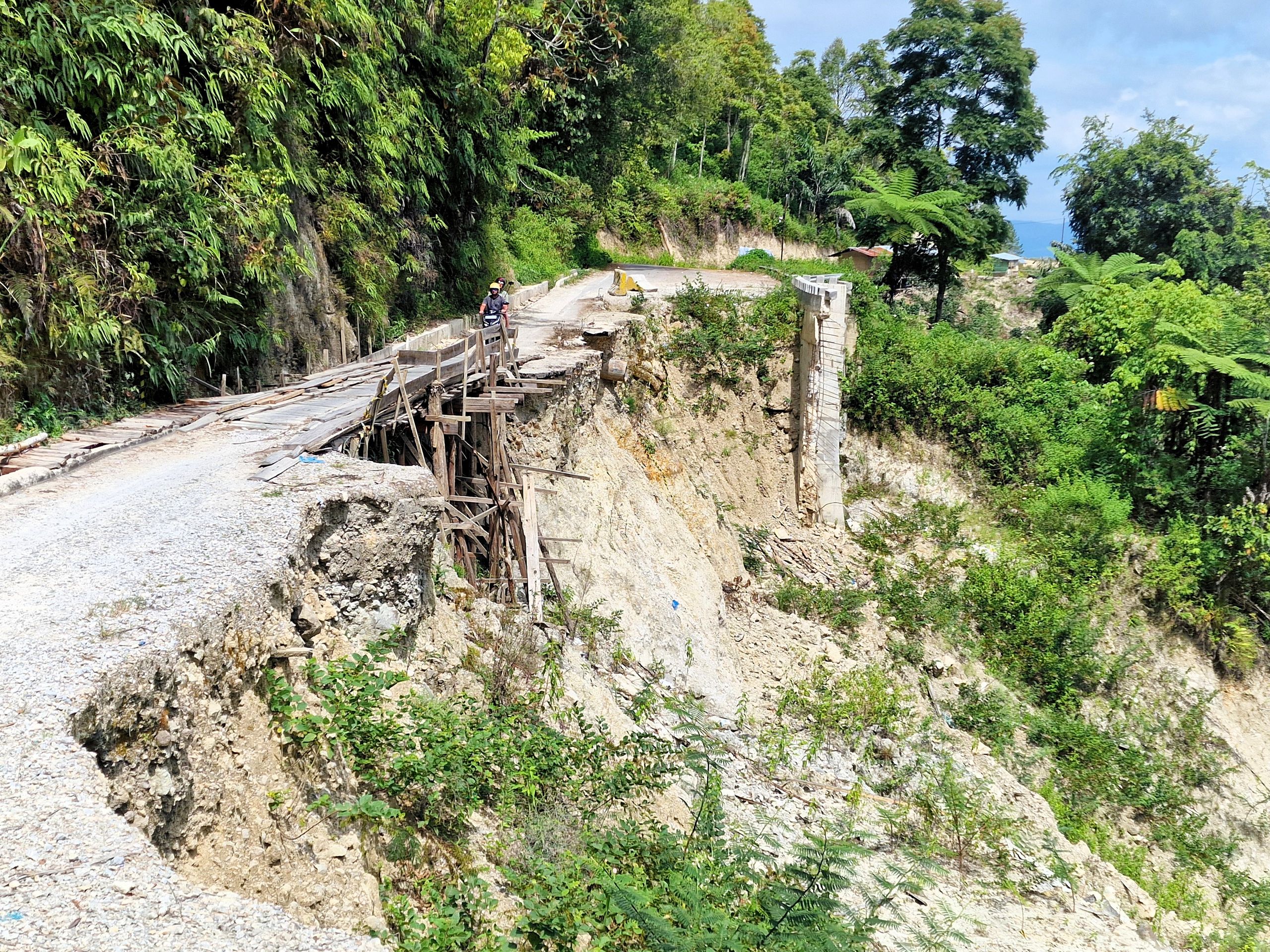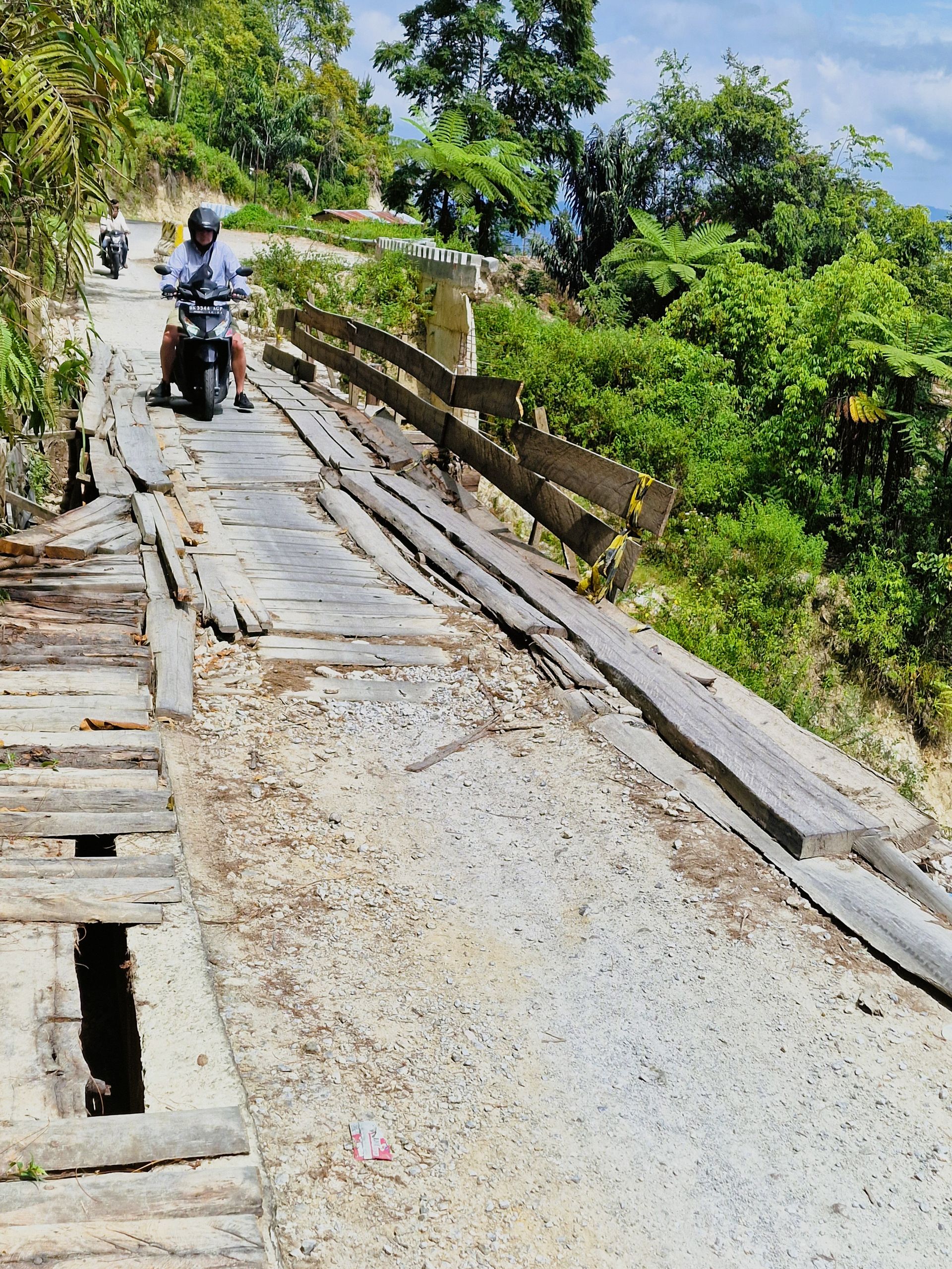 Tagsüber machen wir uns mit dem Moped auf, fahren hoch auf das Plateau von Samosir, der Insel im Tobasee. Die Straße, vor 8 Jahren noch gut, ist zum Teil ab- und an einer Stelle ganz weggebrochen. Mit Brettern ist ein Steg zum Überqueren gezimmert. Schlaglöcher und Spalten erschweren das weitere Fahren für uns. Es ist schon immer in Sumatra eine Mammutaufgabe gewesen, Straßen zu bauen und, vor allem, instand zu halten. Sumatra ist, wie ganz Indonesien, tektonisch aktiv und der tropische Regen tut an der, schier niemals endenden Aufgabe des Straßenbaues, sein letztes dazu.