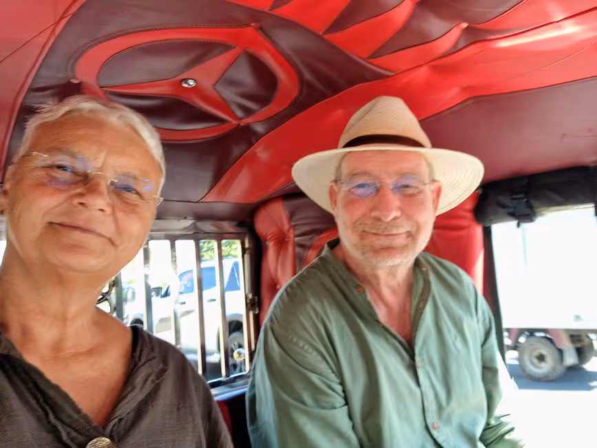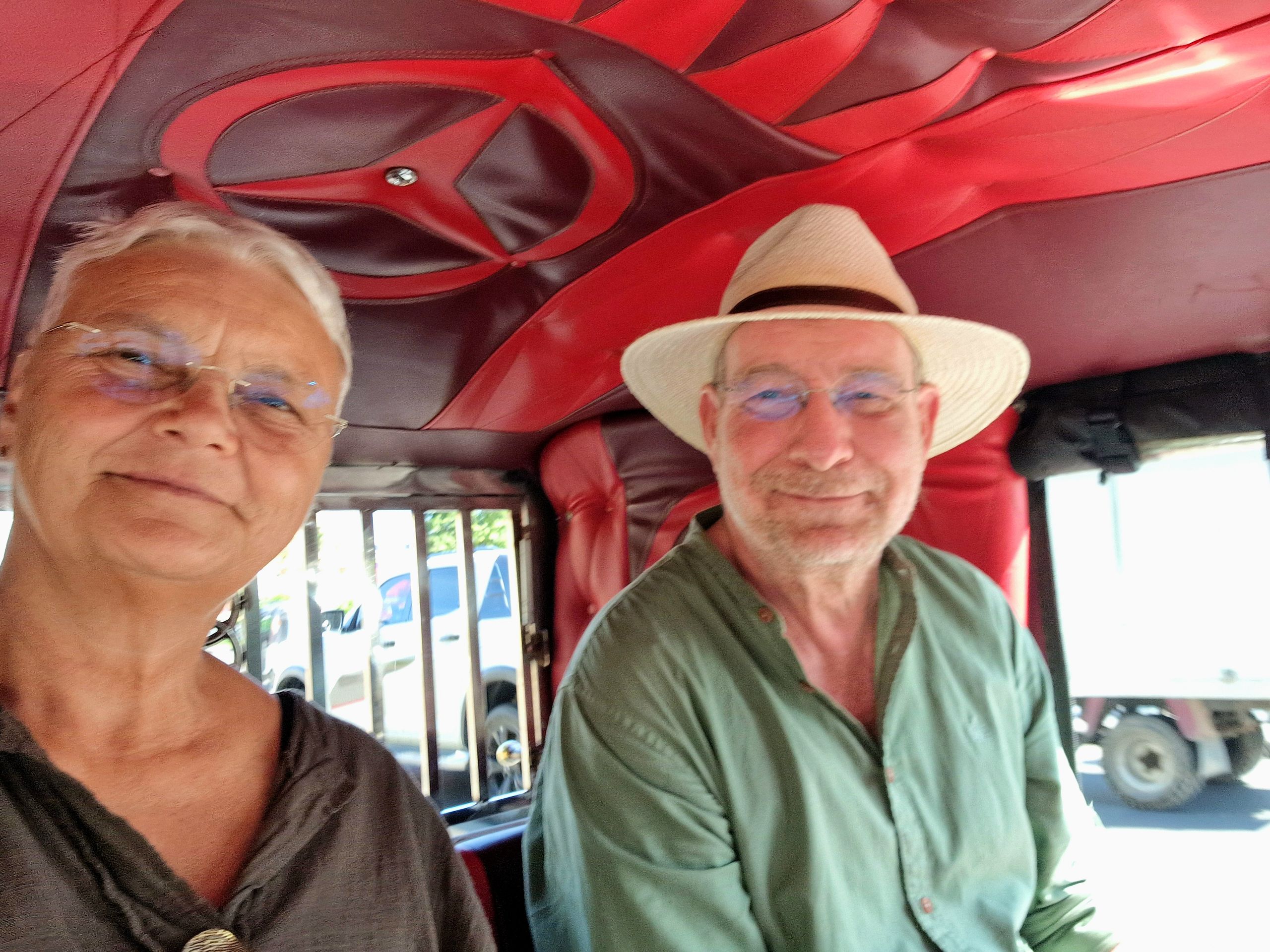 Die Tage stecken voller Überraschungen, angefangen von der eigenen Befindlichkeitn hin zu intensiven Gesprächen von+mit anderen Reisenden. Blaugefärbte Hunde, Krafttraining am Flußufer, unsre 1. Tuktuk-Fahrt und wunderbare Bilder eines Projektes mit alten Frauen, die (noch-)einmal in ihrem Leben die besondere Kleidung einer "göttlichen" Tänzerin tragen dürfen.