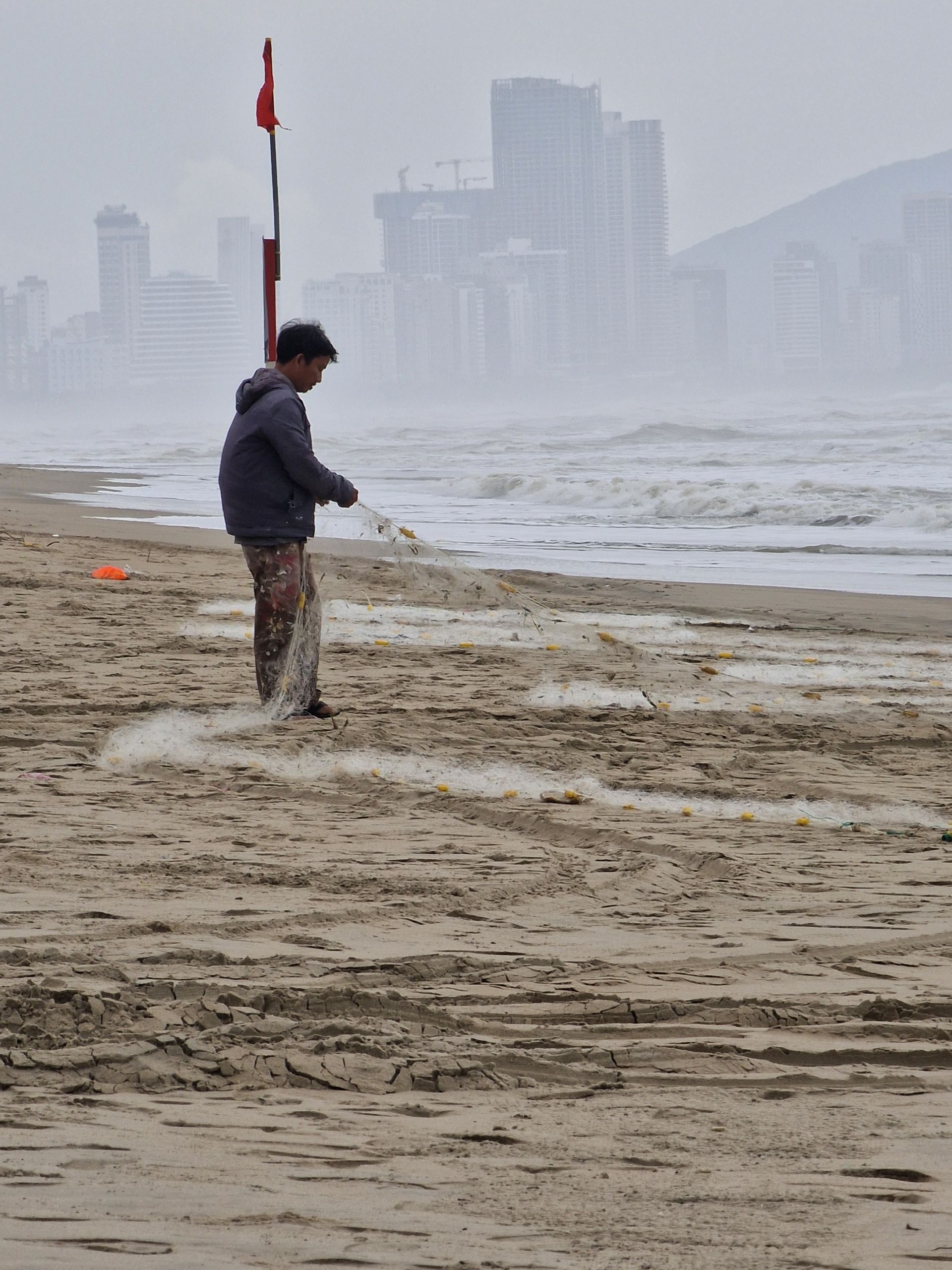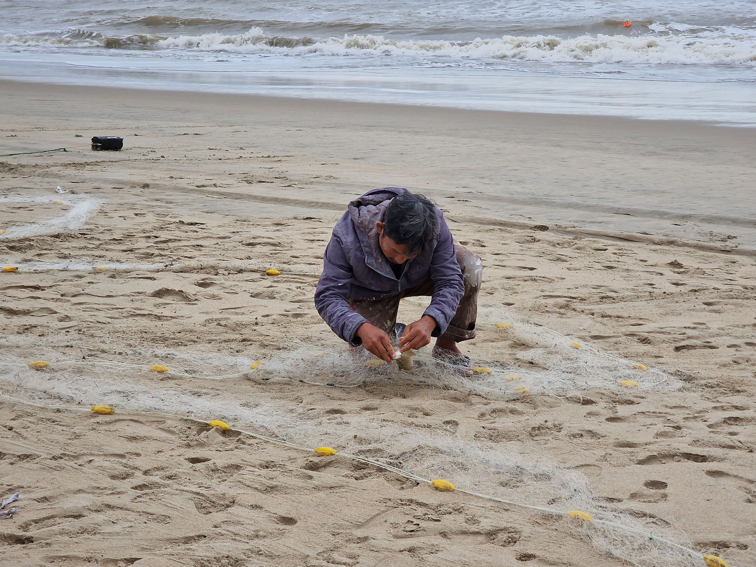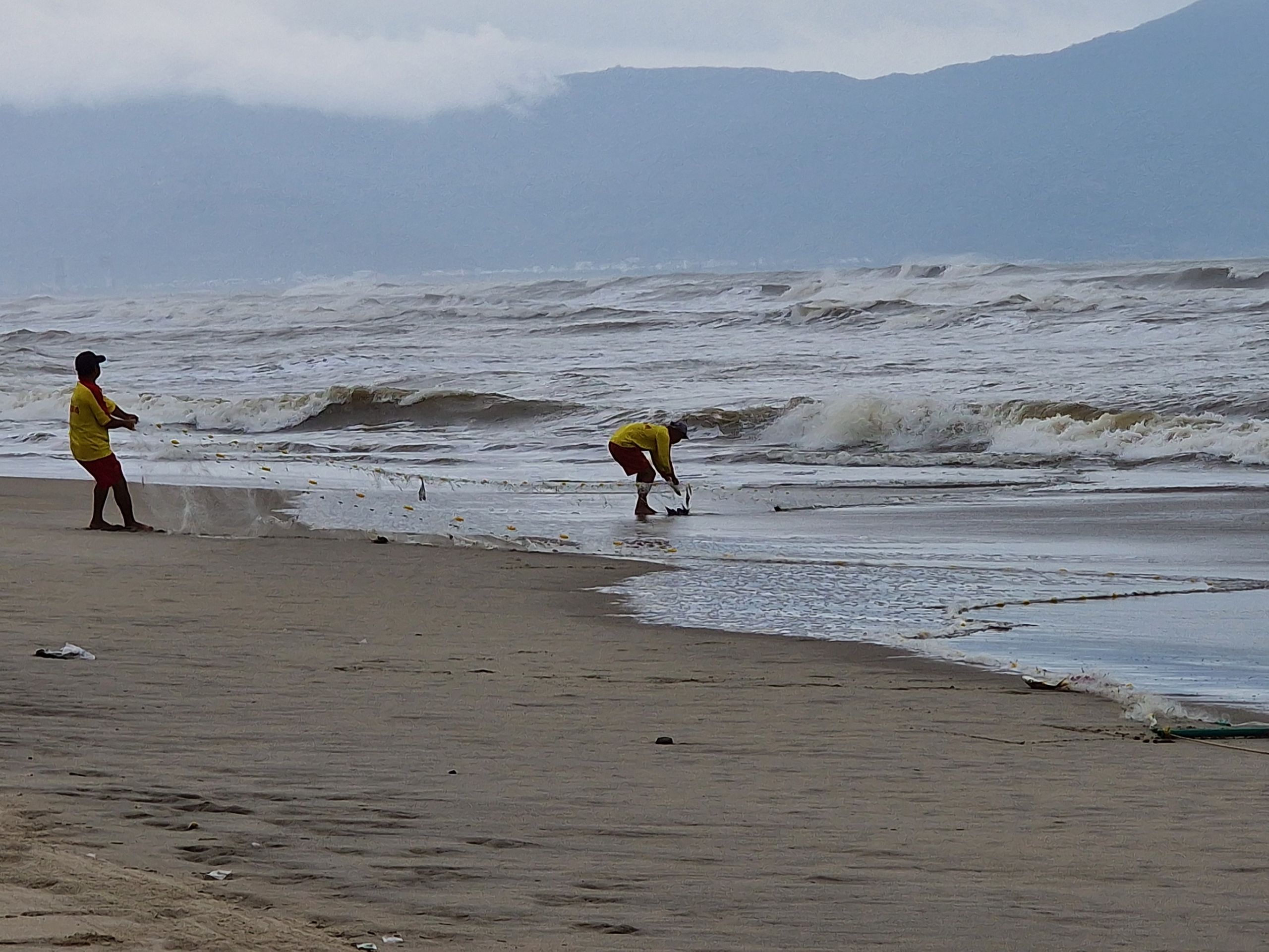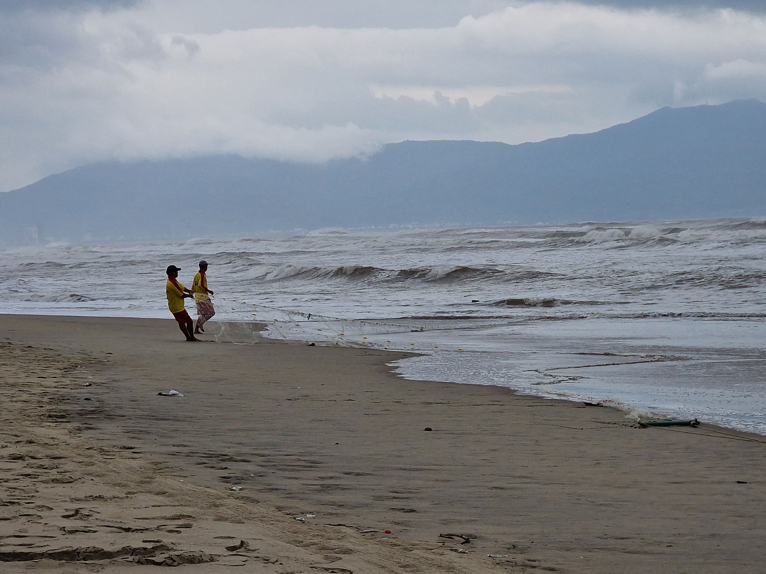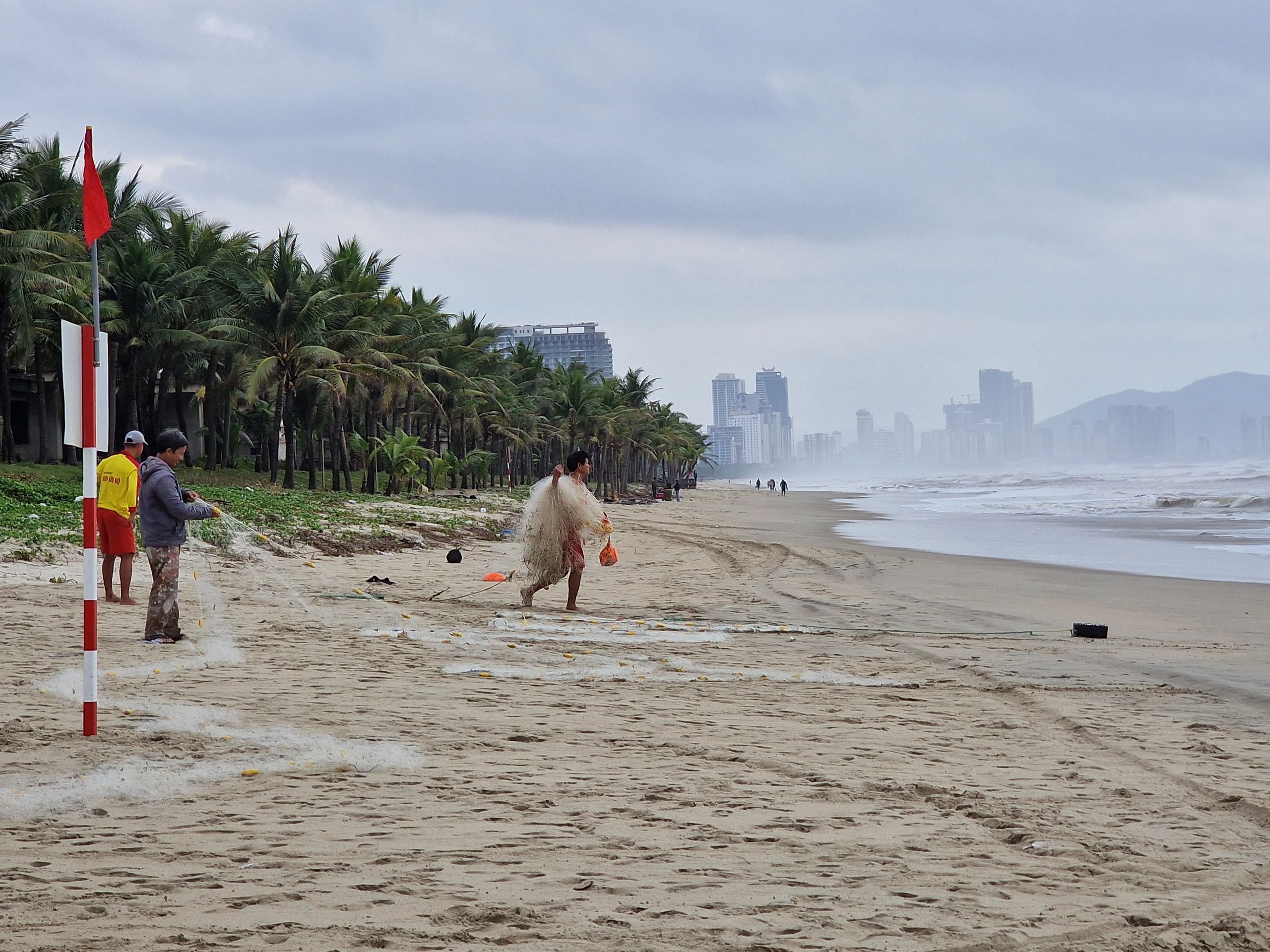 Ähnliches zwischen Hoi An und Da Nang, am Meer. Die Life Guard Security am Strand half die Fischernetze einzuholen, was bei den großen Wellen nicht einfach erschien. Ein Fischer hilft dem anderen und taucht in die Wellen, um das Netz auszubreiten. Ich weiß nicht, ob sie das immer so machen oder bei milderem Seegang eigentlich mit dem Boot rausfahren. Es hat mich einfach beeindruckt, mit welchem Aufwand und welcher Unermüdlichkeit nicht aufgegeben wird. Der Ertrag des einen Netzes betrug 4 Fische.