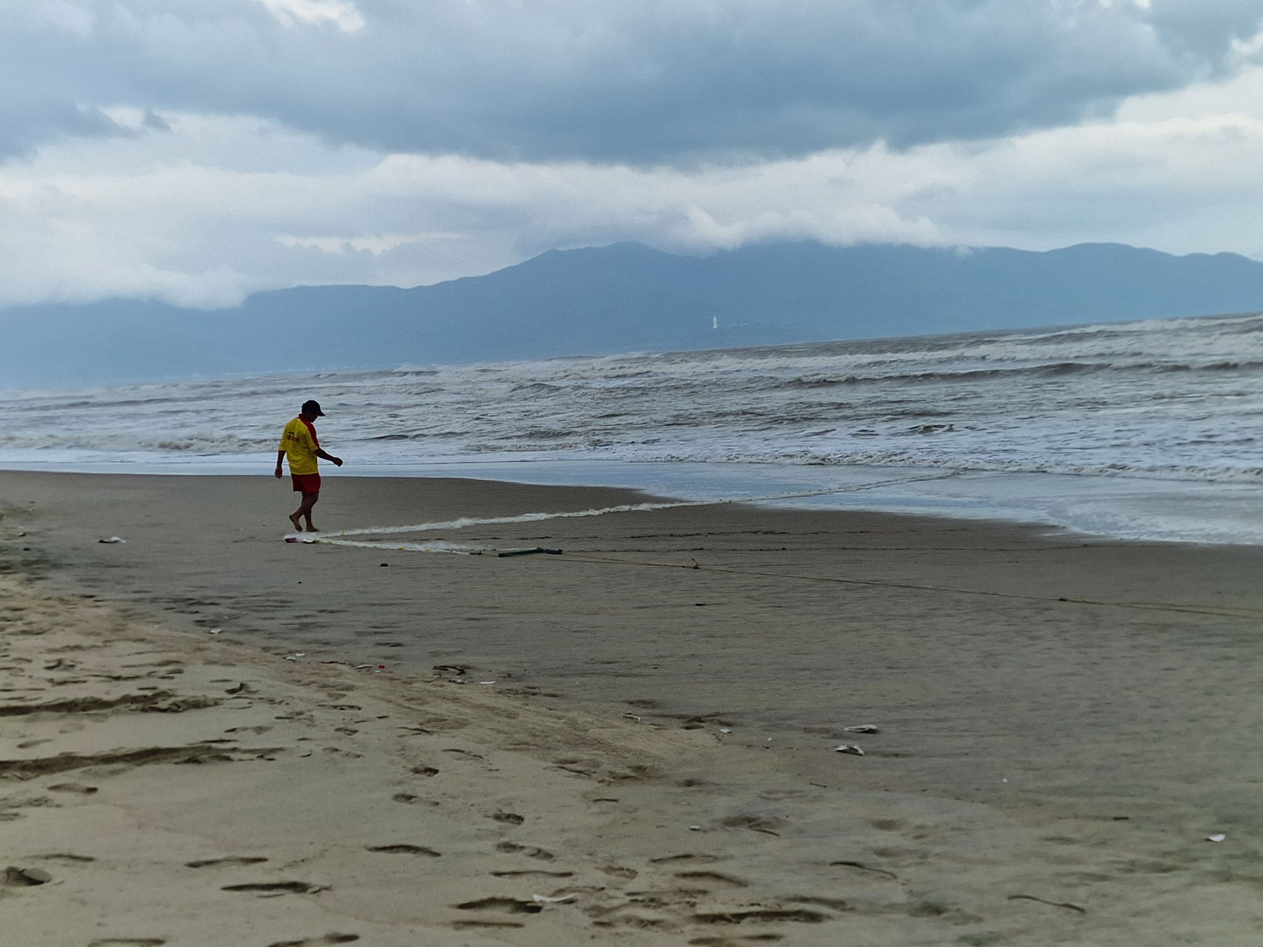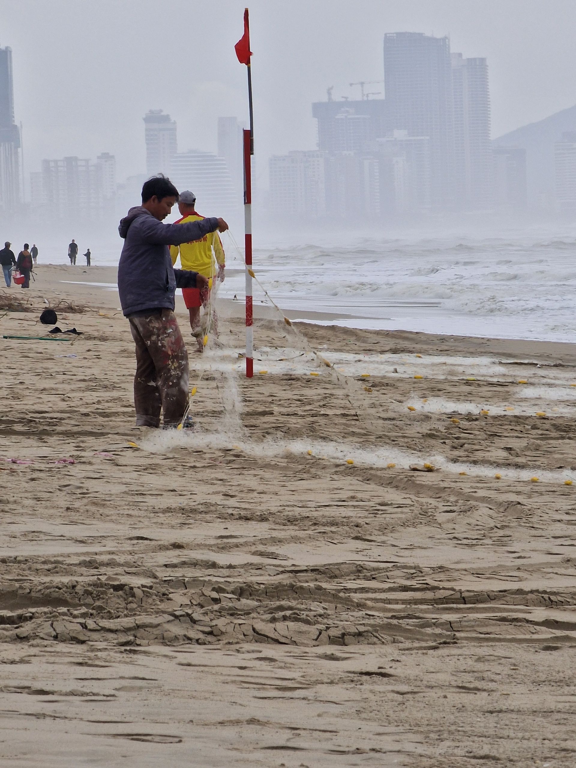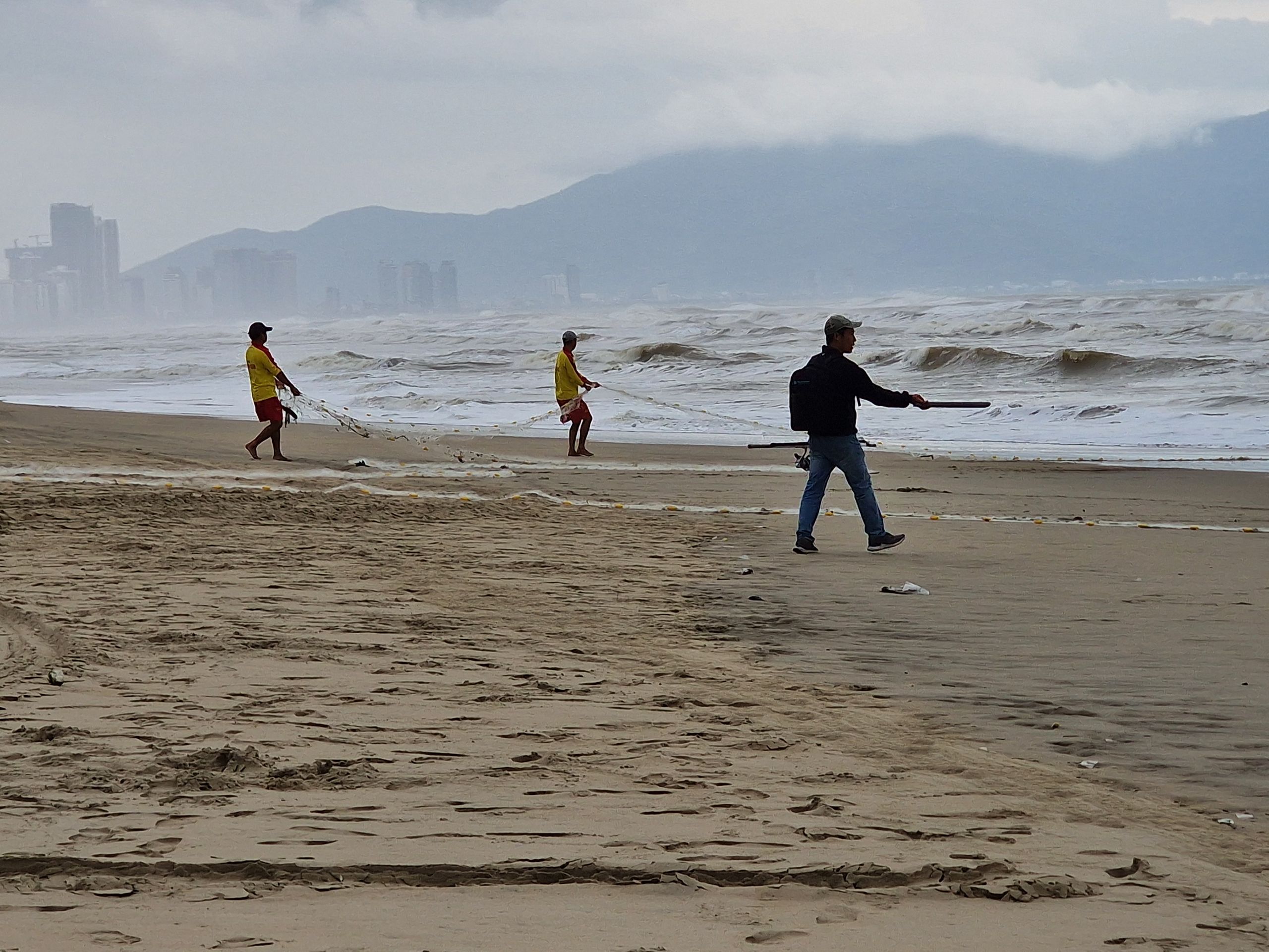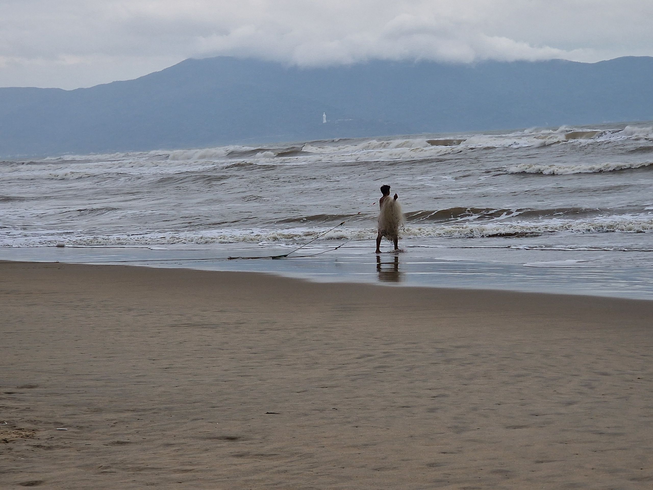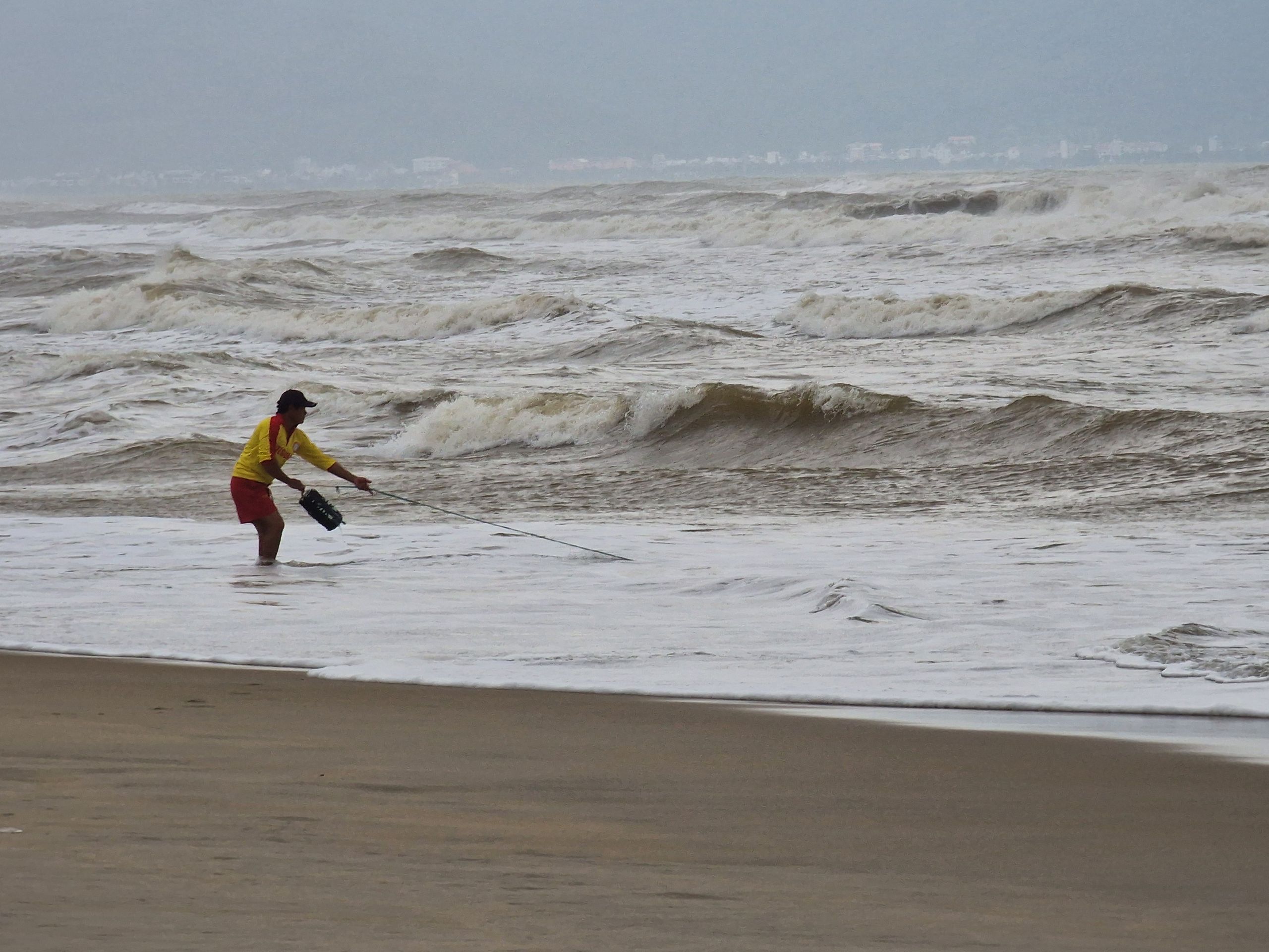 Ähnliches zwischen Hoi An und Da Nang, am Meer. Die Life Guard Security am Strand half die Fischernetze einzuholen, was bei den großen Wellen nicht einfach erschien. Ein Fischer hilft dem anderen und taucht in die Wellen, um das Netz auszubreiten. Ich weiß nicht, ob sie das immer so machen oder bei milderem Seegang eigentlich mit dem Boot rausfahren. Es hat mich einfach beeindruckt, mit welchem Aufwand und welcher Unermüdlichkeit nicht aufgegeben wird. Der Ertrag des einen Netzes betrug 4 Fische.