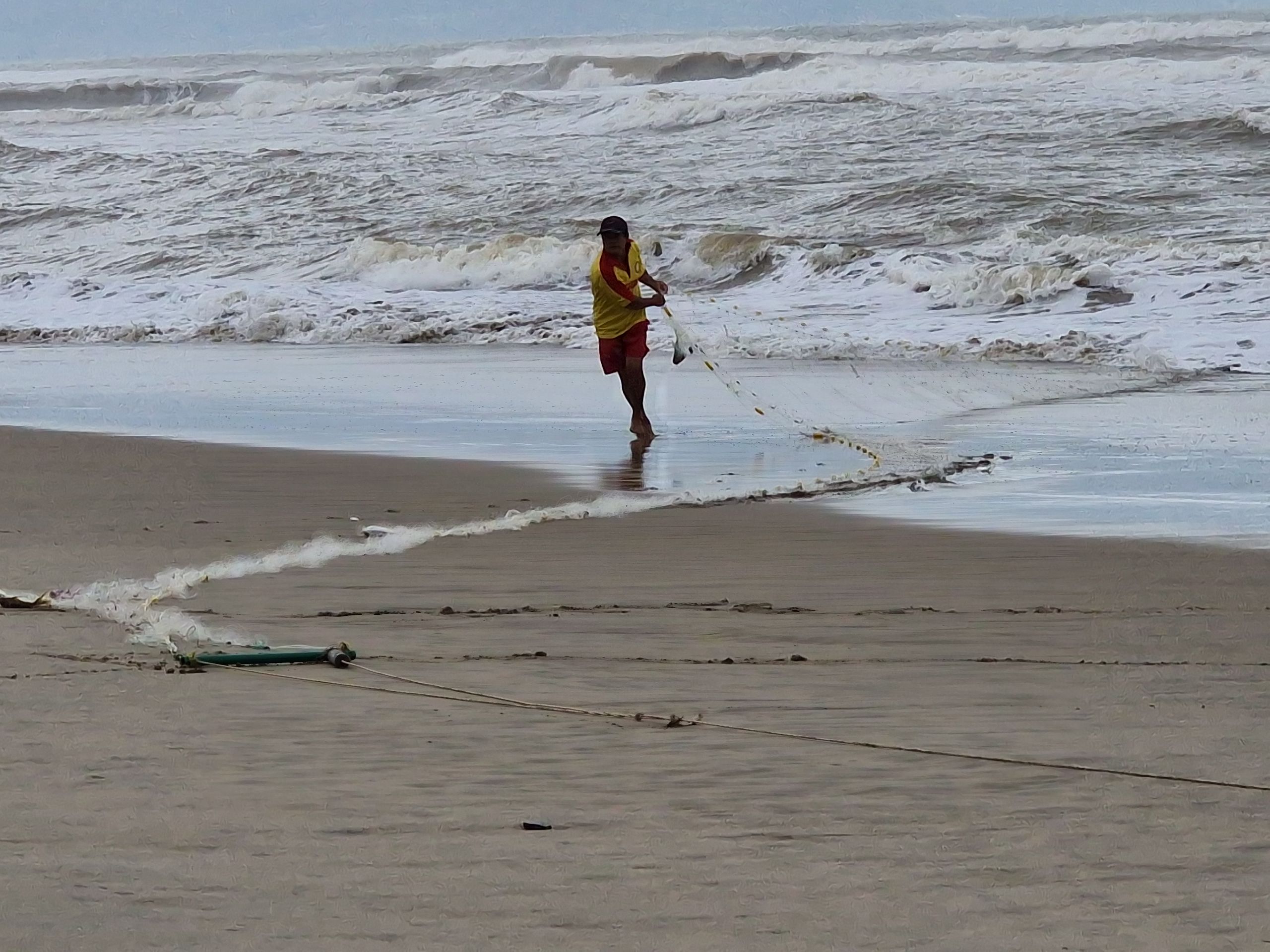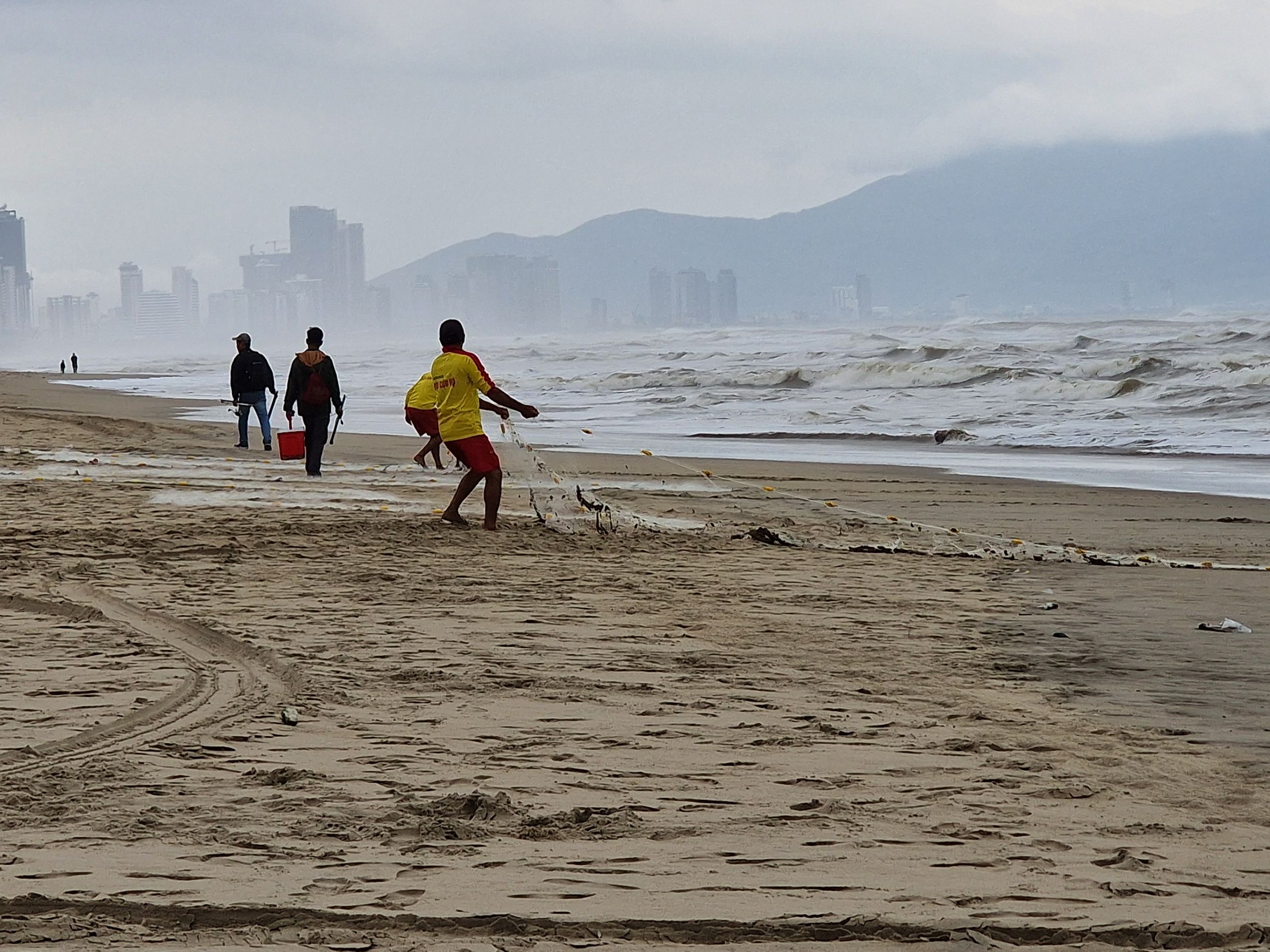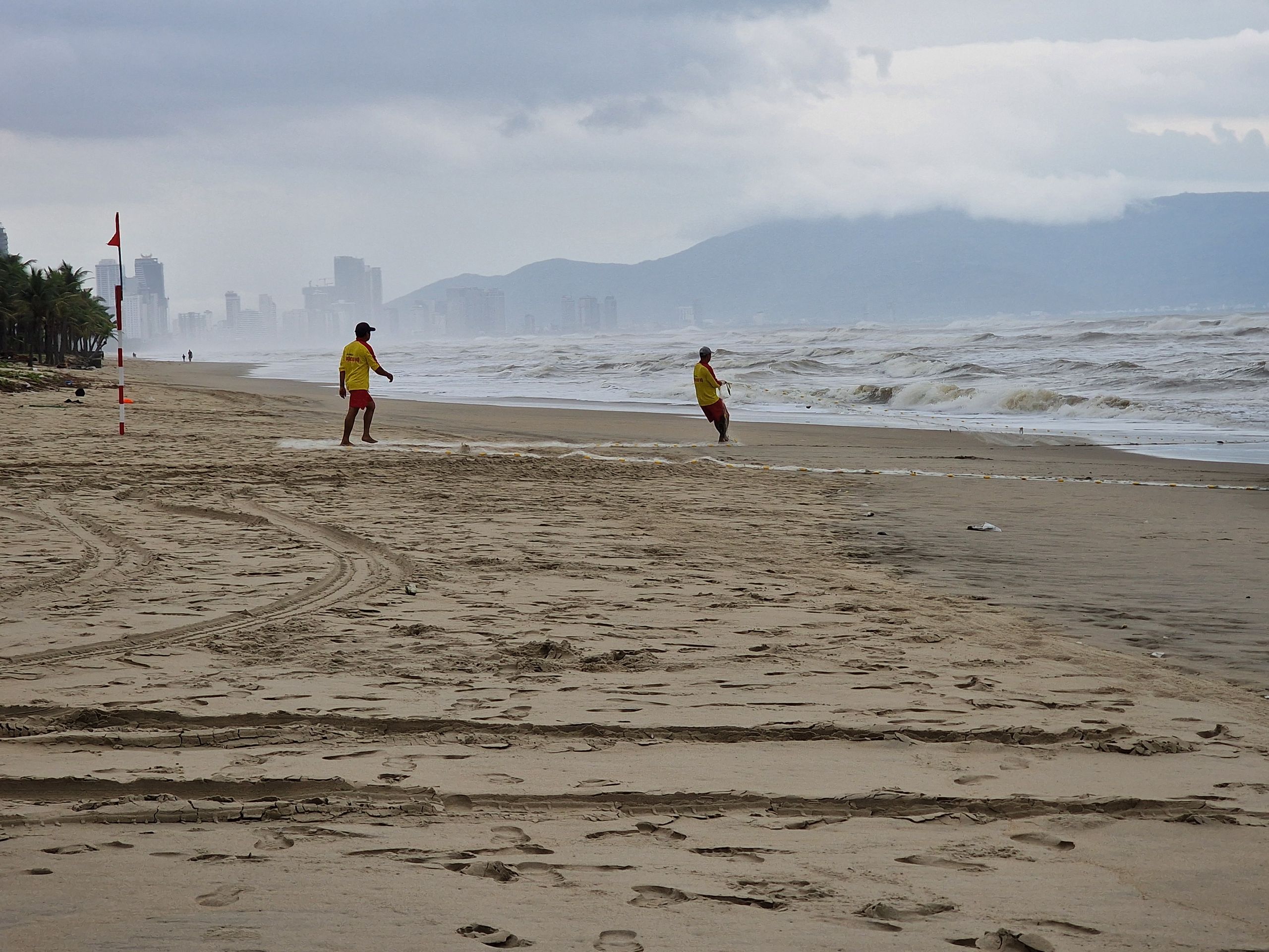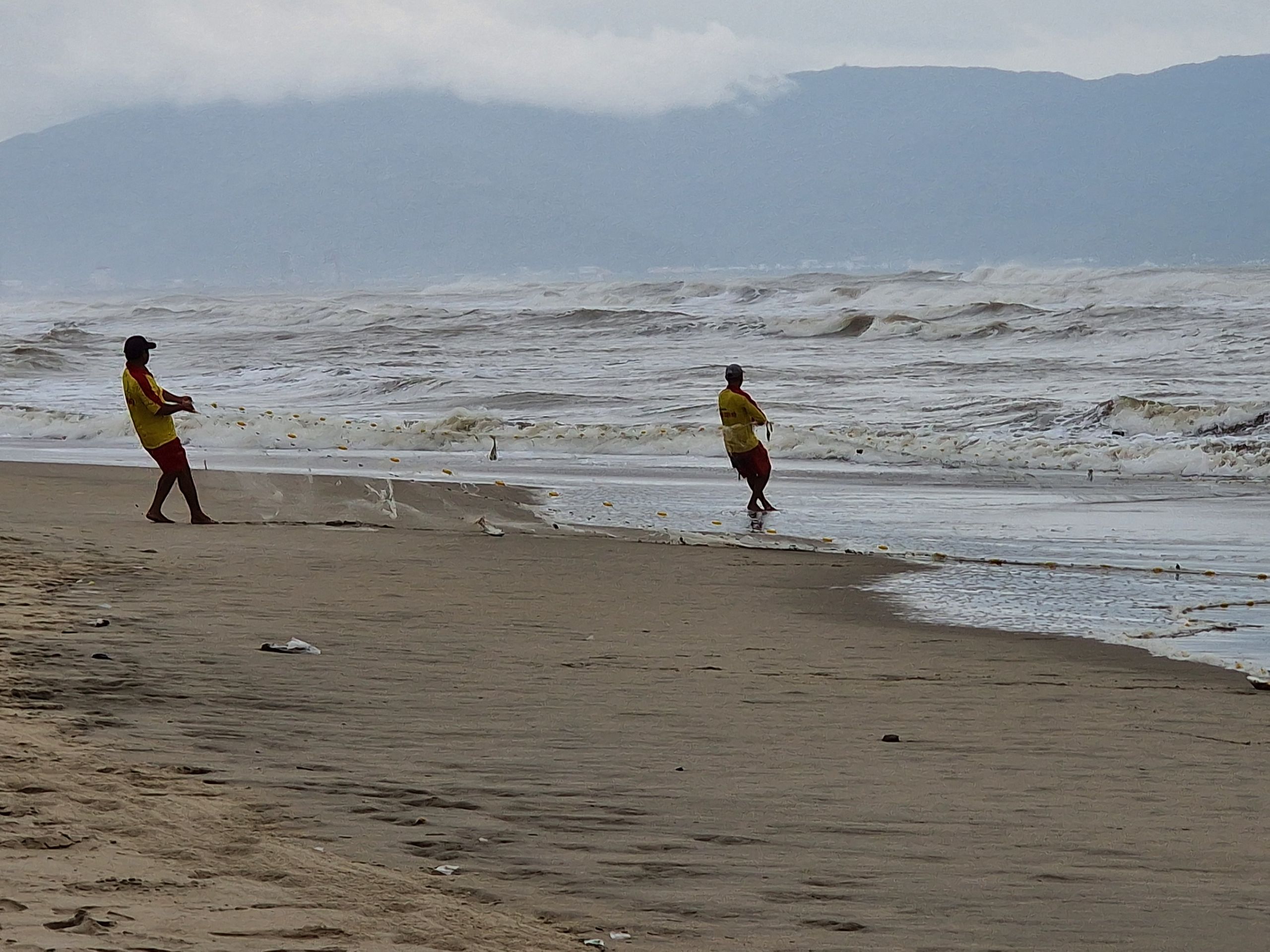 Ähnliches zwischen Hoi An und Da Nang, am Meer. Die Life Guard Security am Strand half die Fischernetze einzuholen, was bei den großen Wellen nicht einfach erschien. Ein Fischer hilft dem anderen und taucht in die Wellen, um das Netz auszubreiten. Ich weiß nicht, ob sie das immer so machen oder bei milderem Seegang eigentlich mit dem Boot rausfahren. Es hat mich einfach beeindruckt, mit welchem Aufwand und welcher Unermüdlichkeit nicht aufgegeben wird. Der Ertrag des einen Netzes betrug 4 Fische.