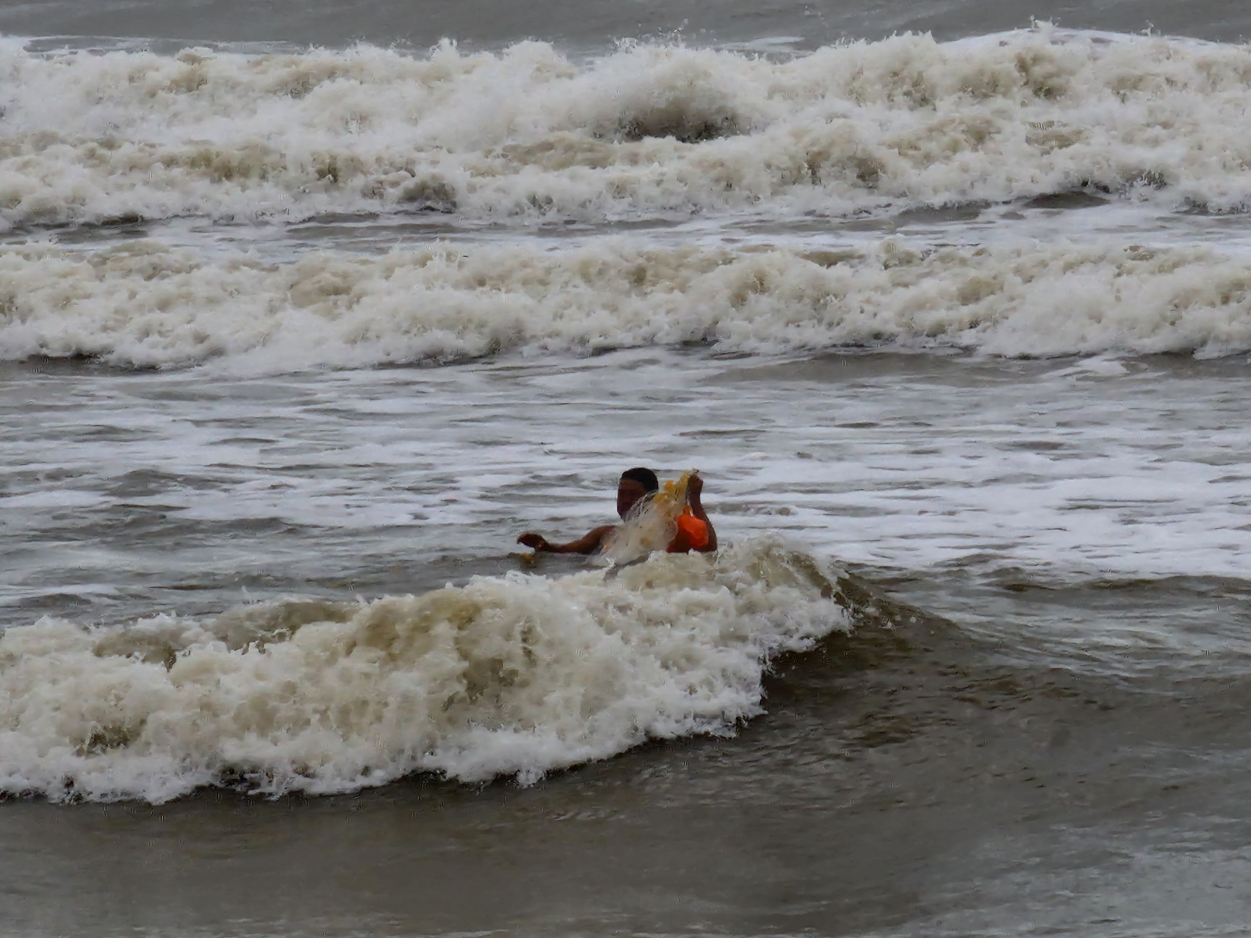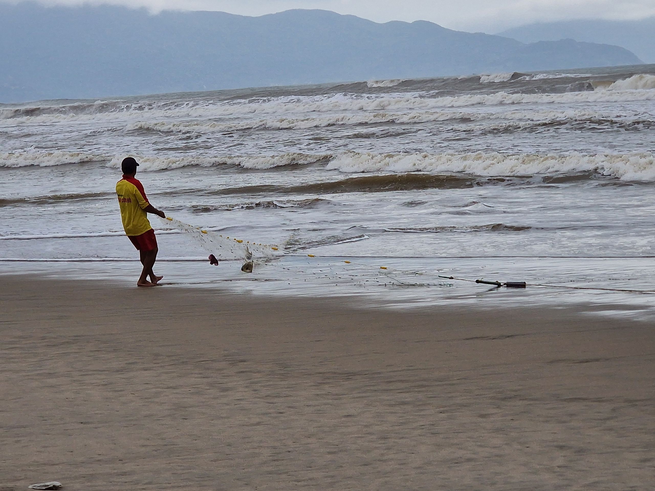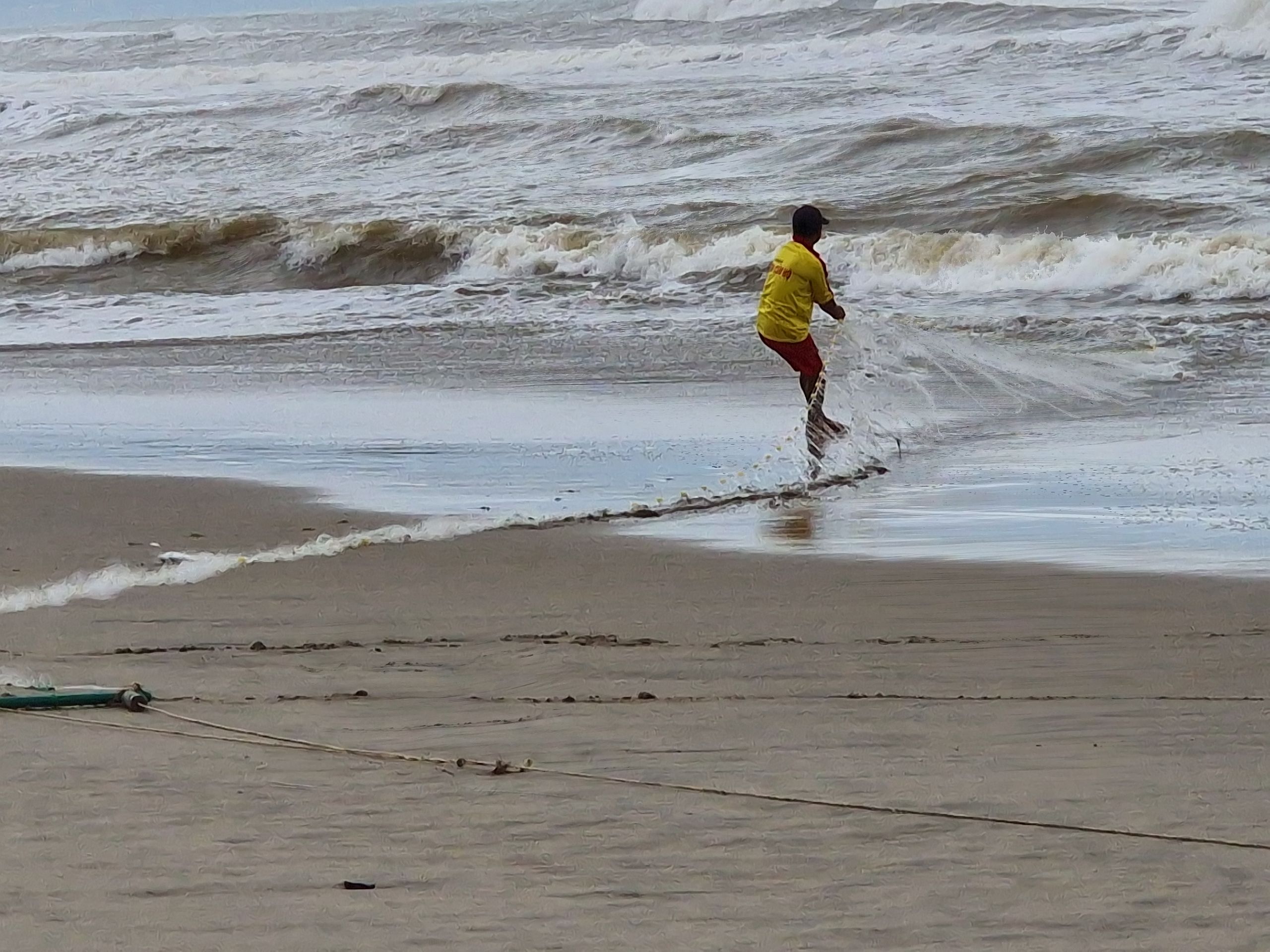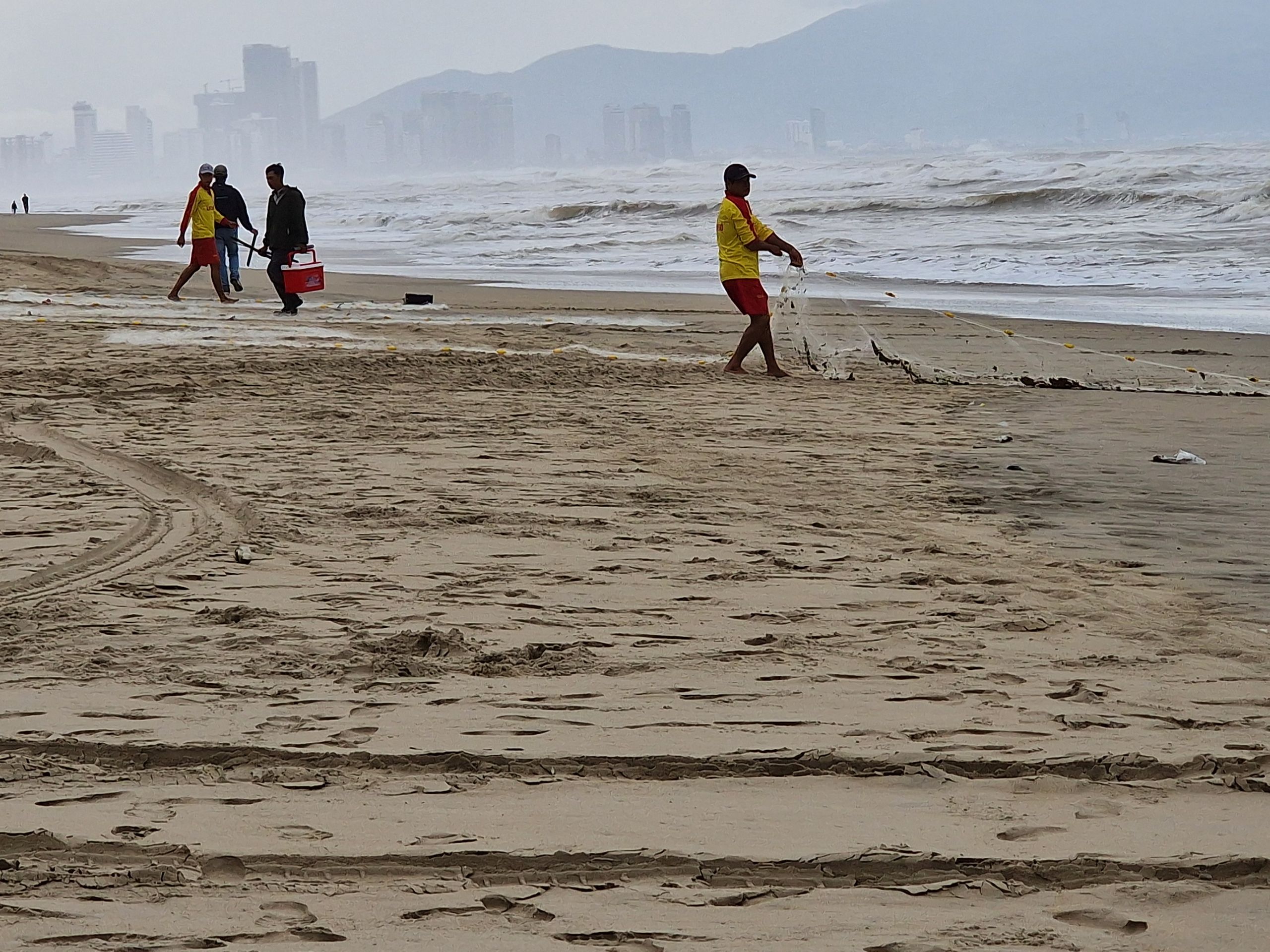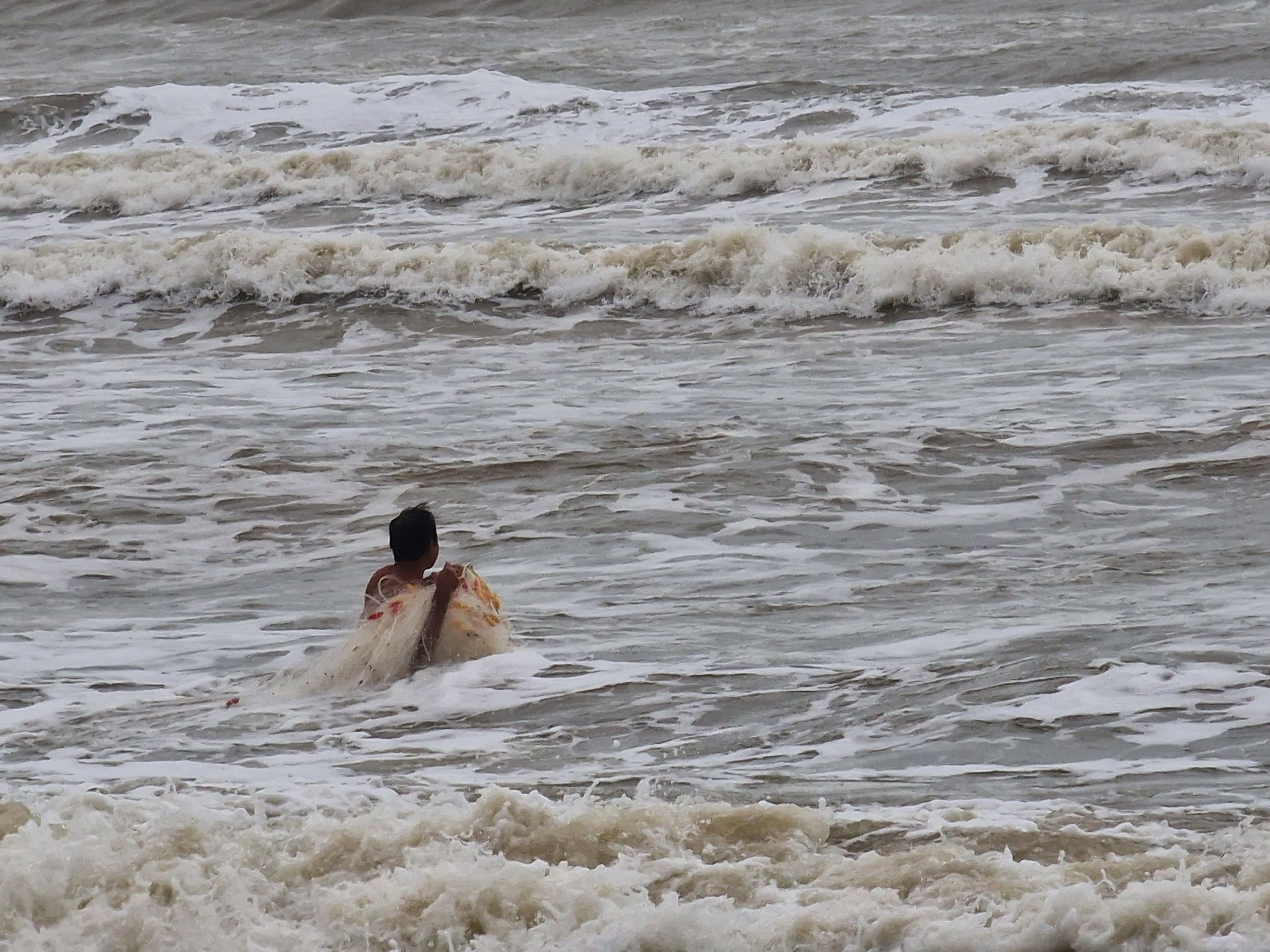 Ähnliches zwischen Hoi An und Da Nang, am Meer. Die Life Guard Security am Strand half die Fischernetze einzuholen, was bei den großen Wellen nicht einfach erschien. Ein Fischer hilft dem anderen und taucht in die Wellen, um das Netz auszubreiten. Ich weiß nicht, ob sie das immer so machen oder bei milderem Seegang eigentlich mit dem Boot rausfahren. Es hat mich einfach beeindruckt, mit welchem Aufwand und welcher Unermüdlichkeit nicht aufgegeben wird. Der Ertrag des einen Netzes betrug 4 Fische.