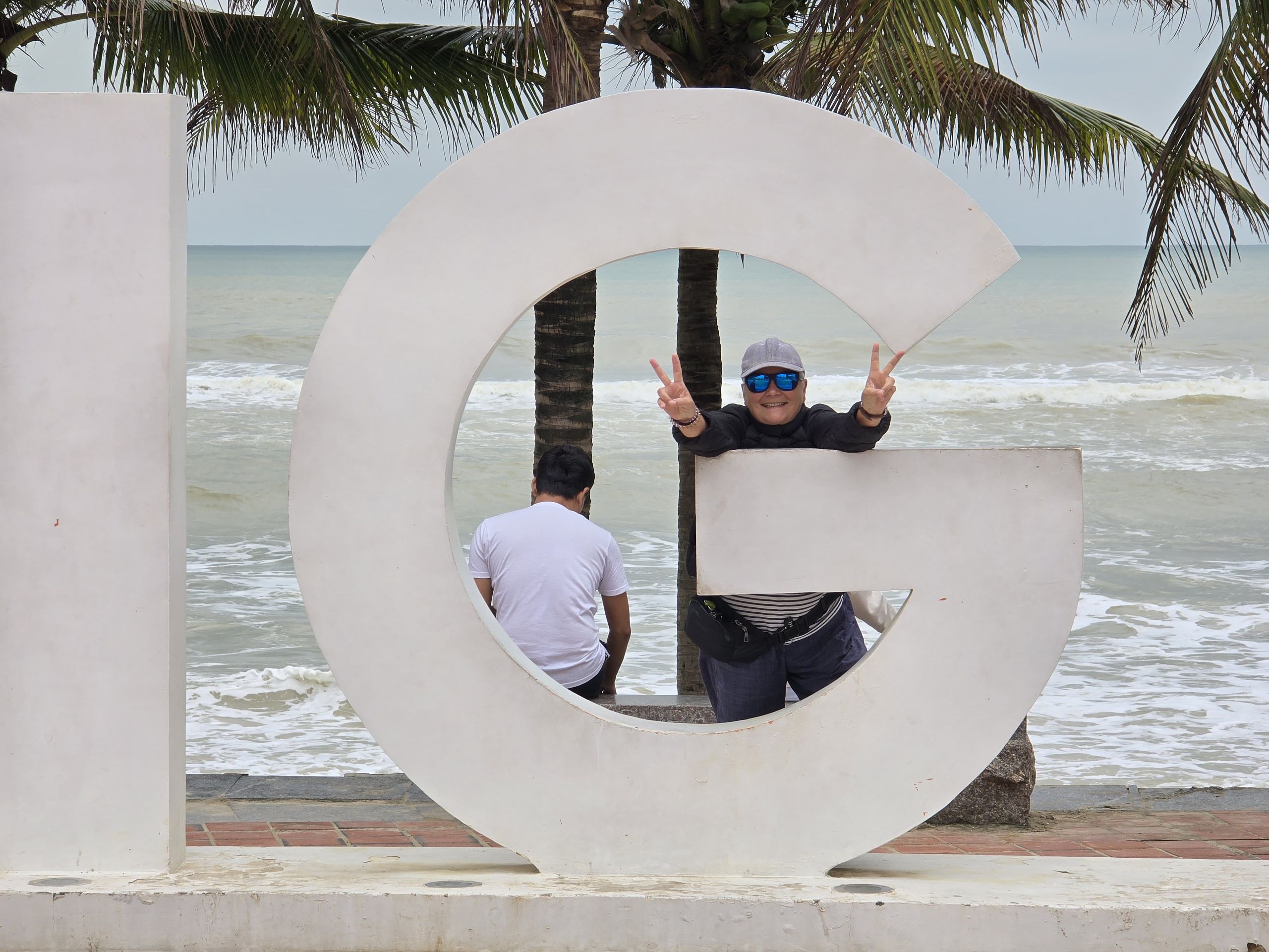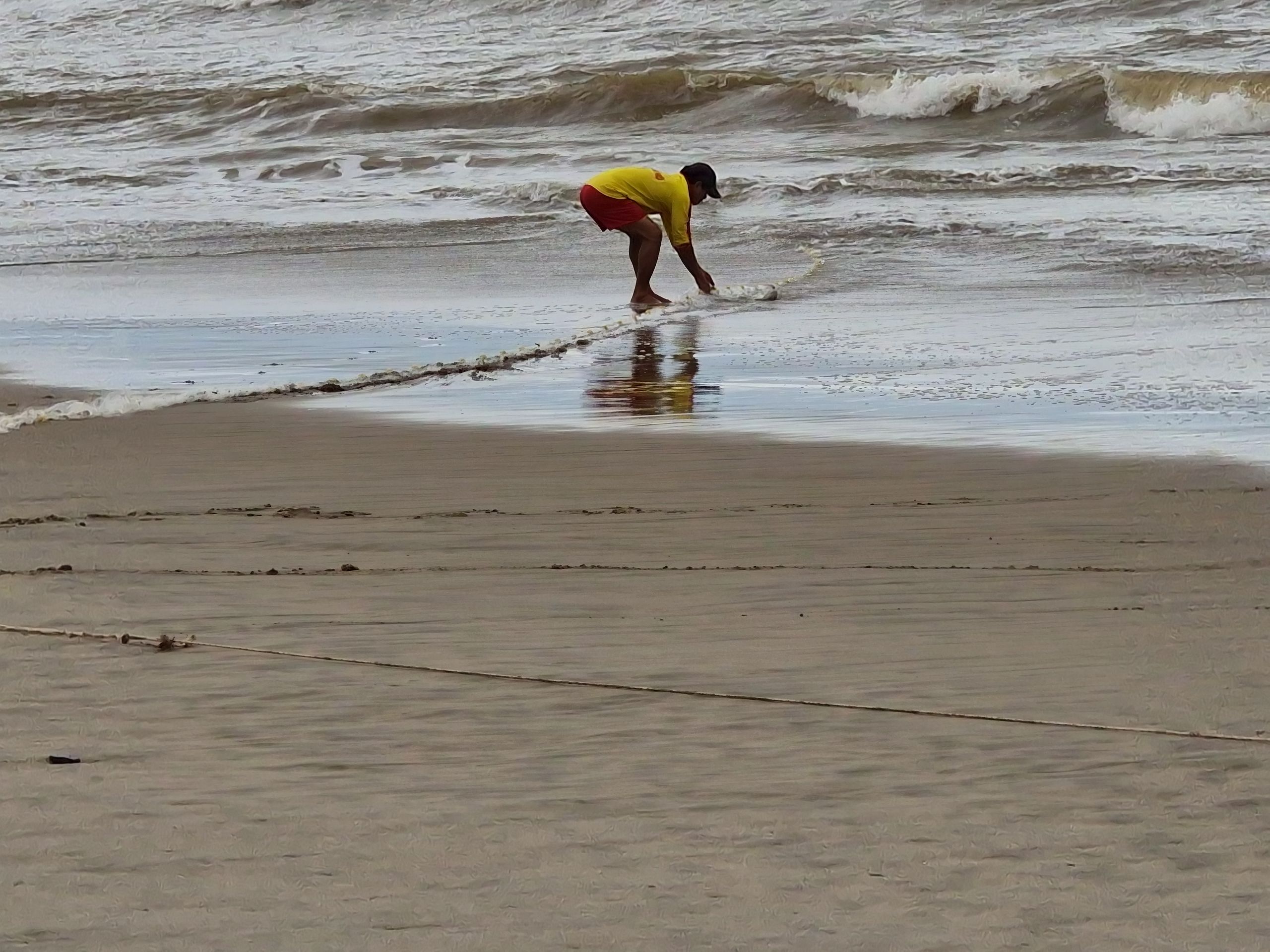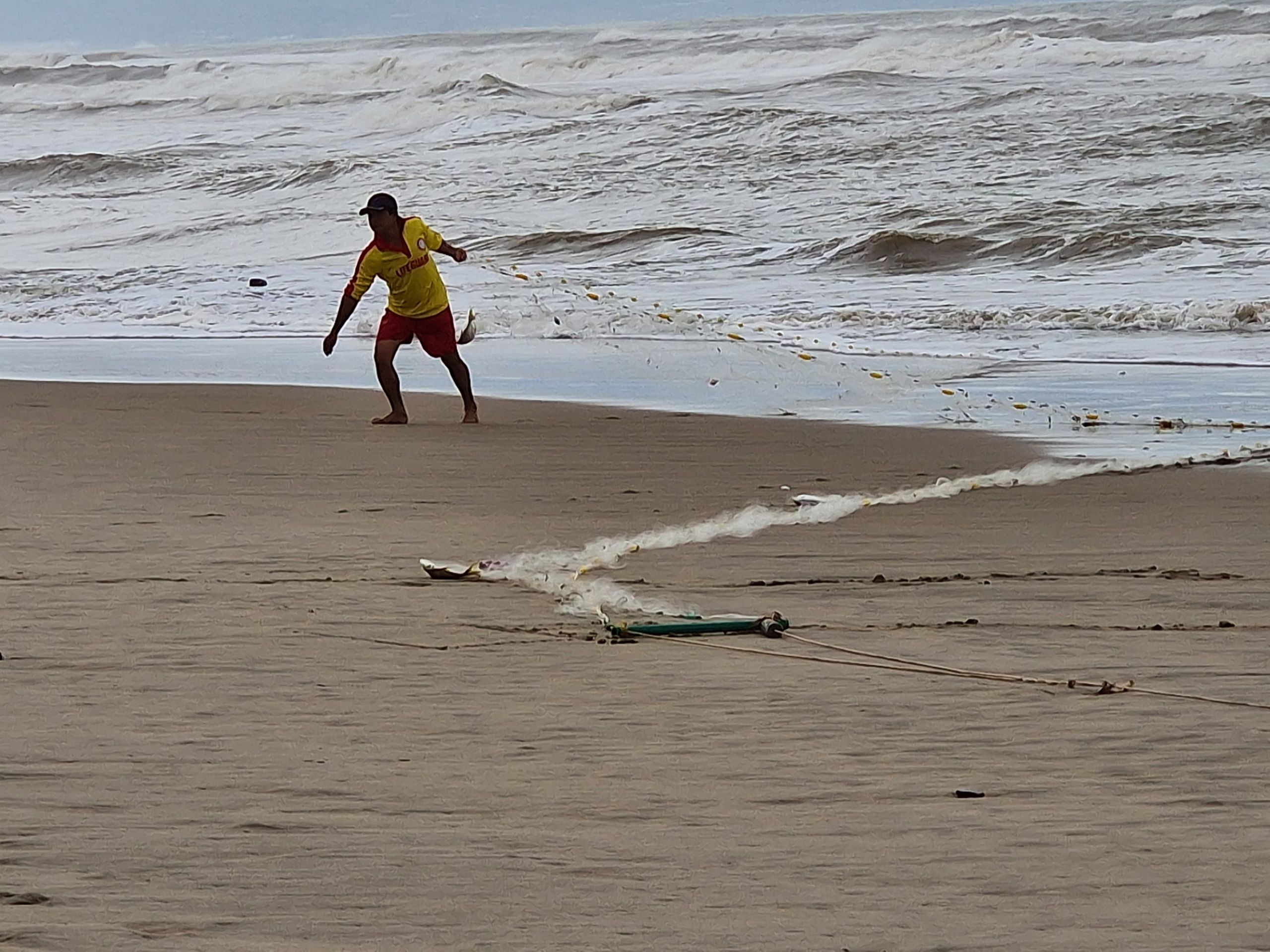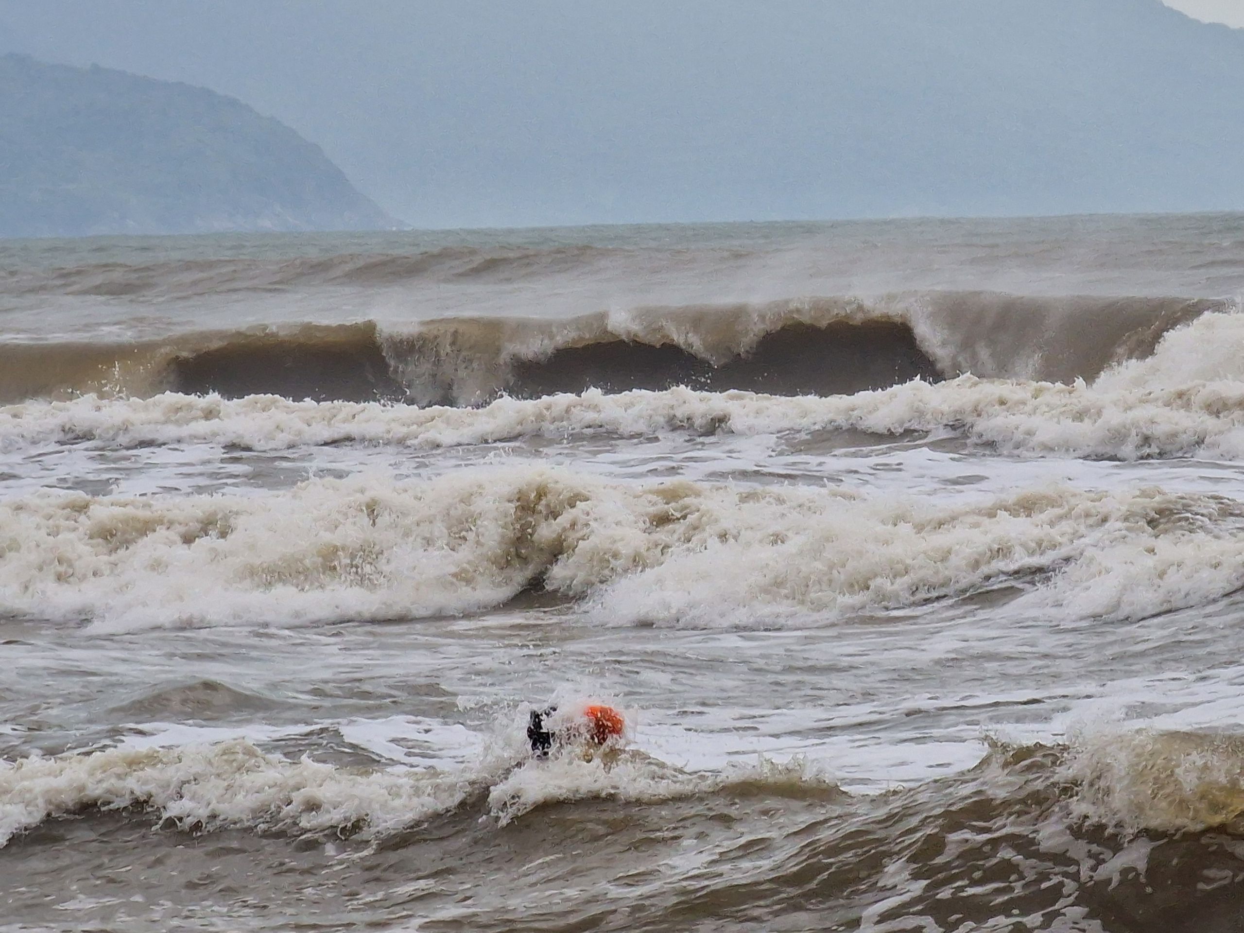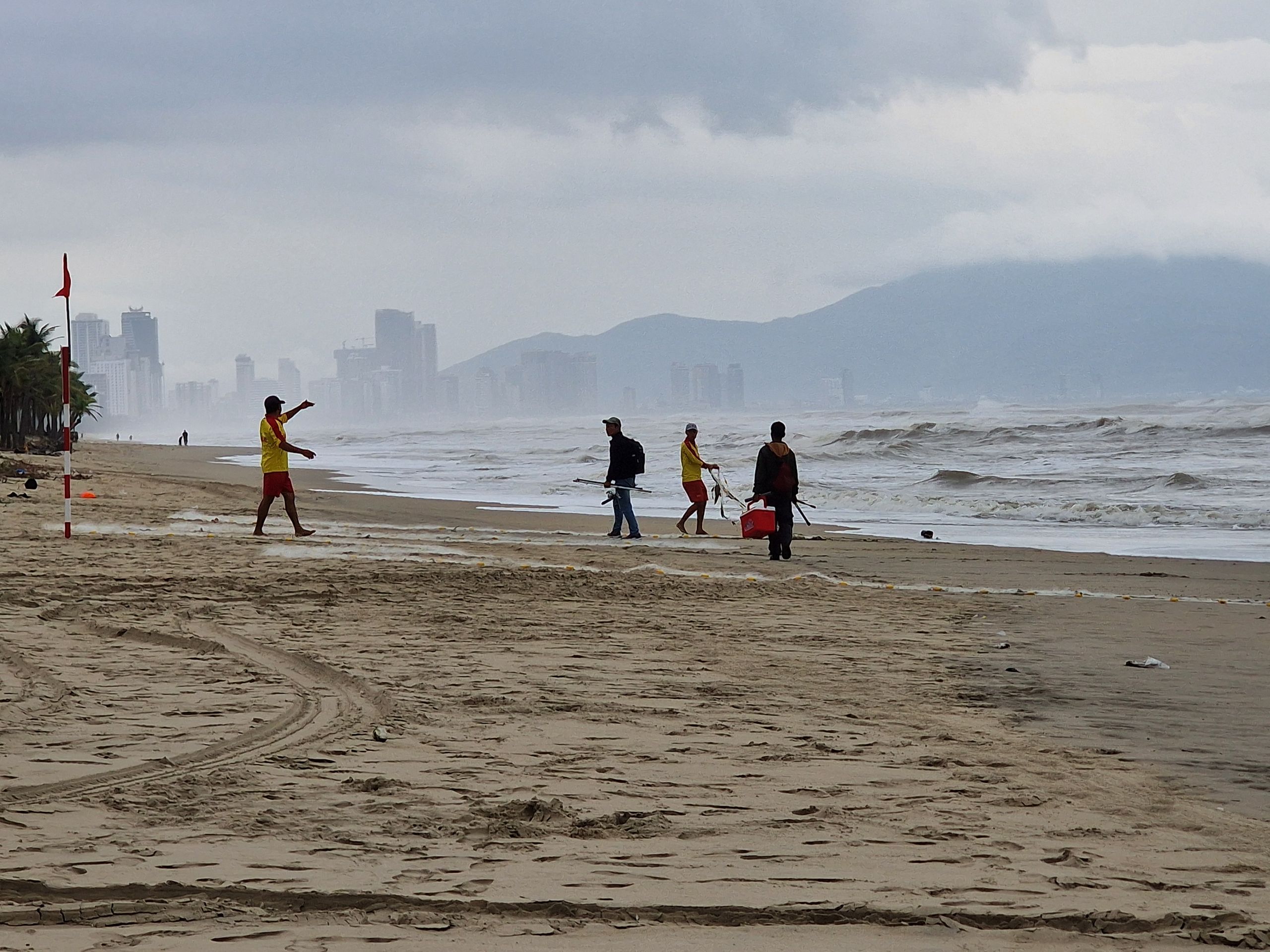 Ähnliches zwischen Hoi An und Da Nang, am Meer. Die Life Guard Security am Strand half die Fischernetze einzuholen, was bei den großen Wellen nicht einfach erschien. Ein Fischer hilft dem anderen und taucht in die Wellen, um das Netz auszubreiten. Ich weiß nicht, ob sie das immer so machen oder bei milderem Seegang eigentlich mit dem Boot rausfahren. Es hat mich einfach beeindruckt, mit welchem Aufwand und welcher Unermüdlichkeit nicht aufgegeben wird. Der Ertrag des einen Netzes betrug 4 Fische.