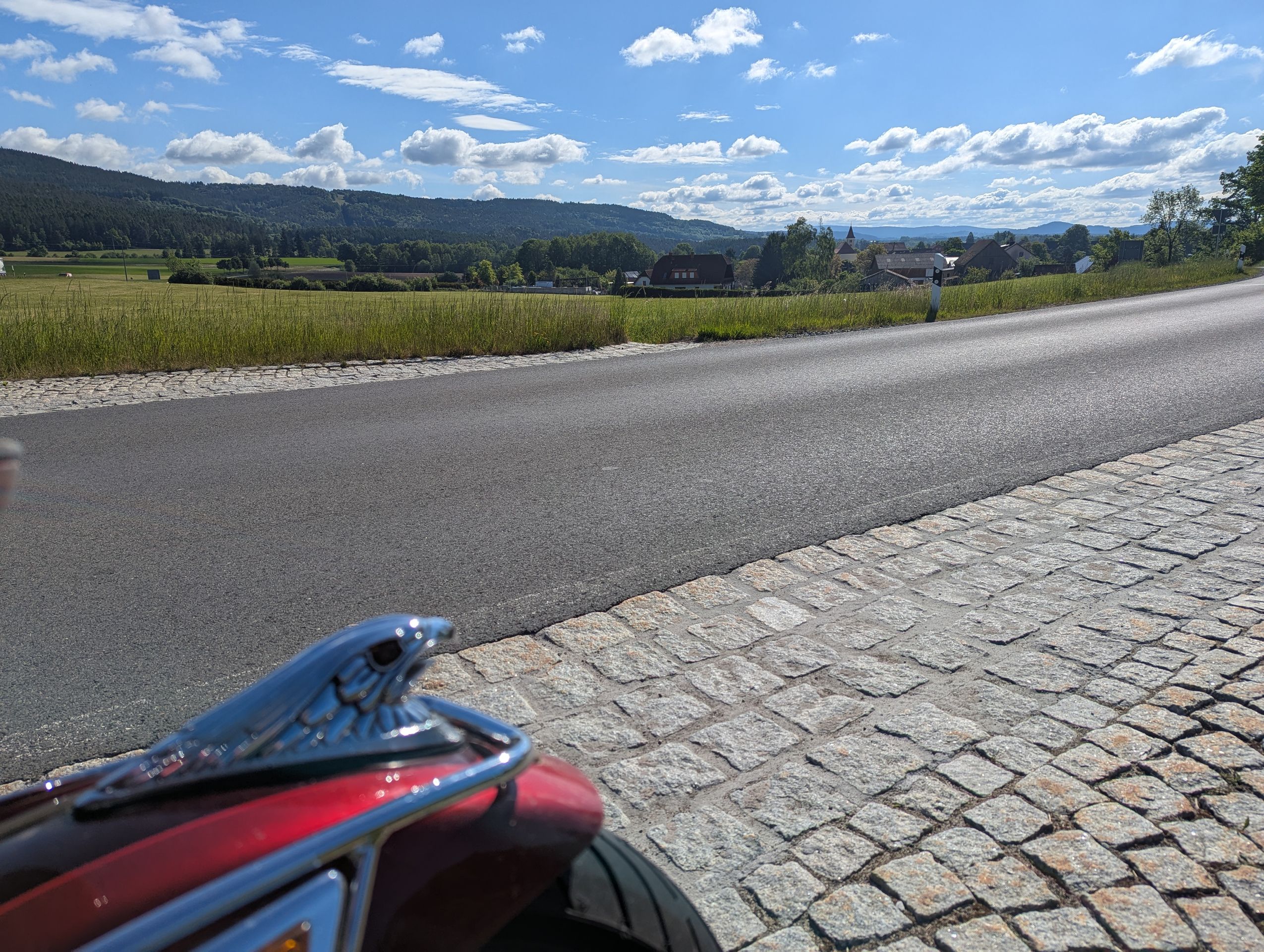 Das alles bei bestem Motorradwetter. Blauer Himmel mit Schäfchenwolken und unwahrscheinlich viel Grüntöne von den Feldern. Dazu kaum Verkehr auf kurvigen Straßen.