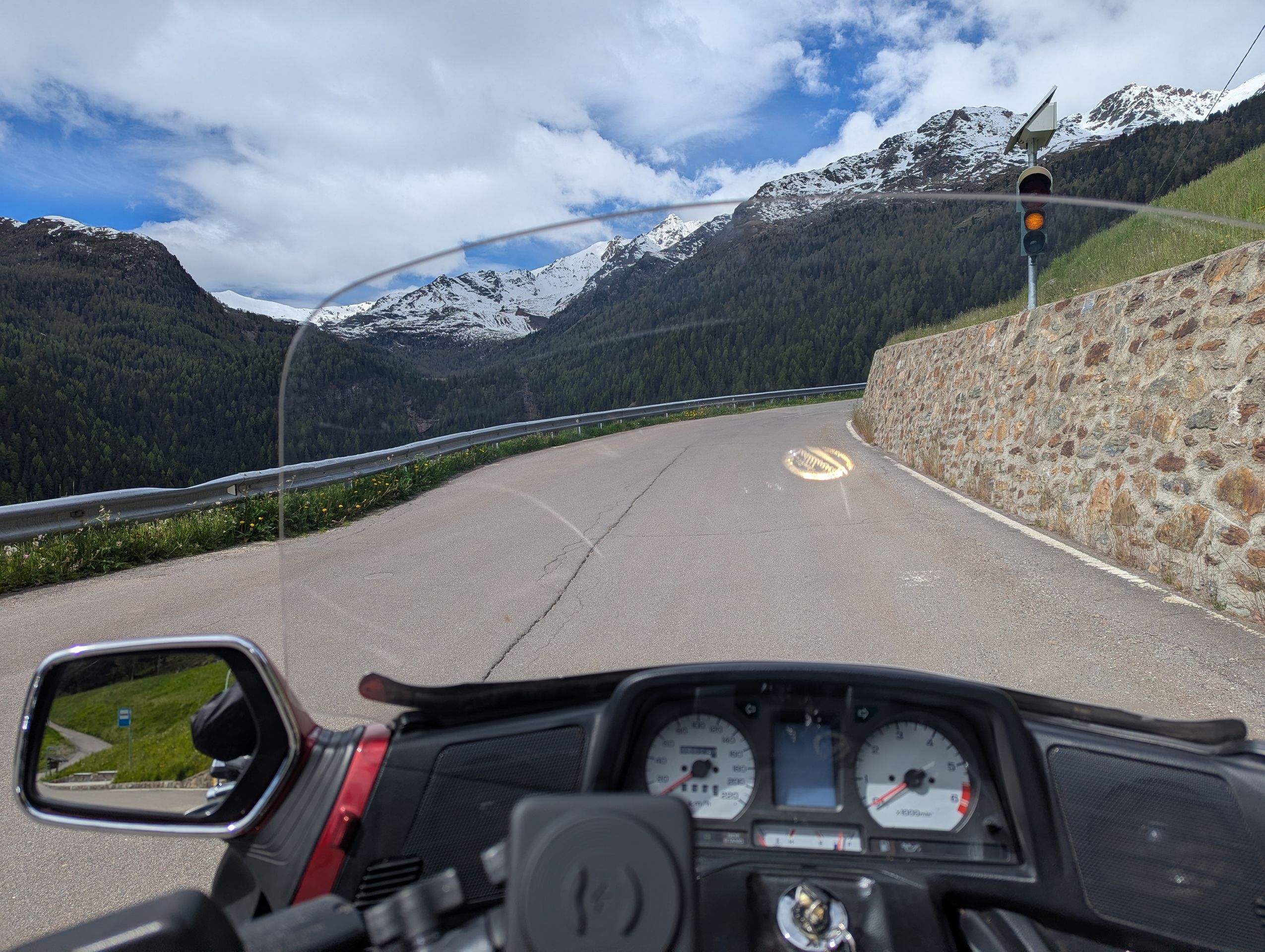 Herrlichste Landschaft mit gezuckerten Bergen, Kurven und Kehren ohne Ende. Das Highlight war der Jauvenpass (2100m ü. n. N). Dort lag Schnee und es war empfindlich kalt. Gut, dass wir uns etwas wärmer angezogen hatten.