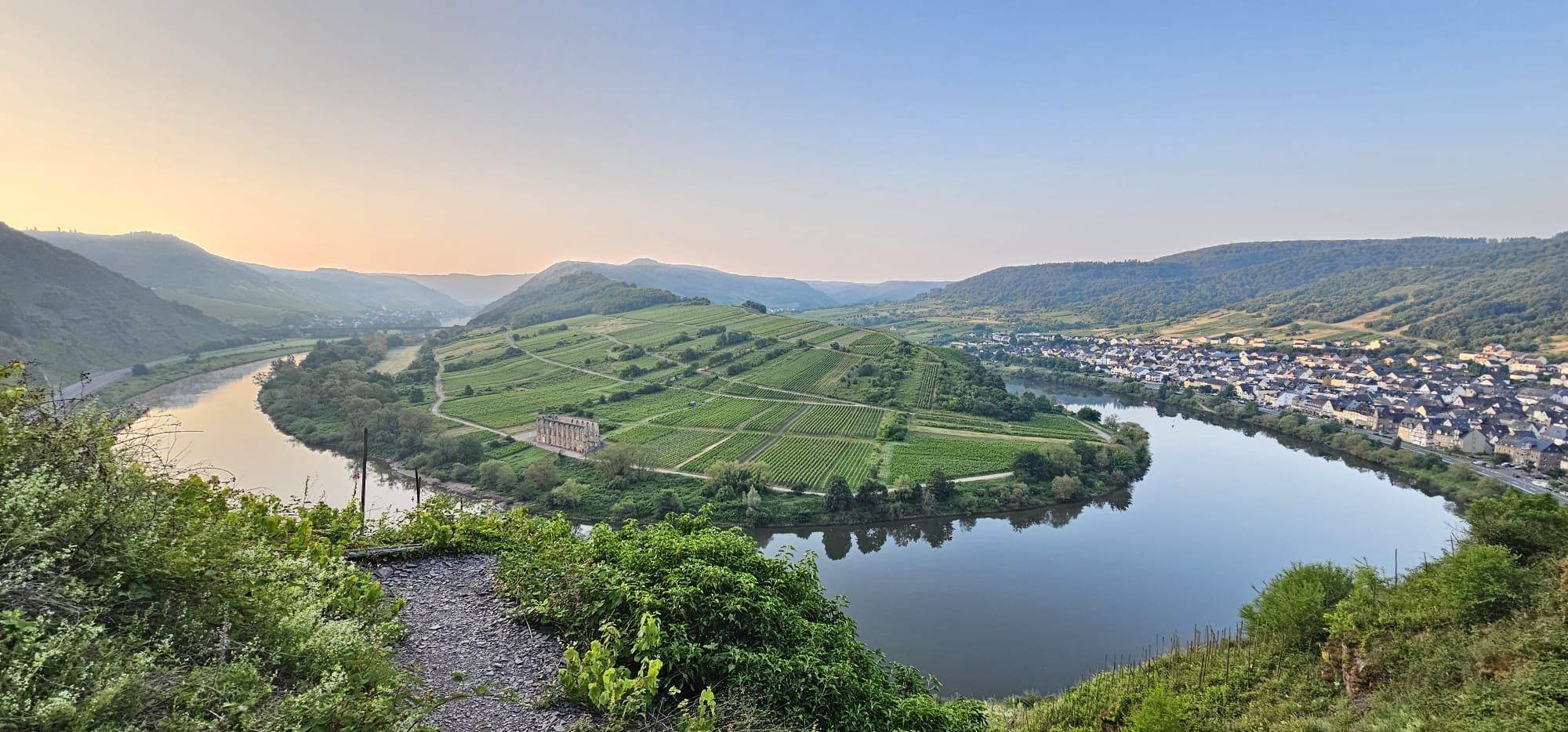 Linda und Nico sind vor unserem Aufstehen an die Moselschleife gefahren. Alex und die Kinder kommen zum Frühstück.