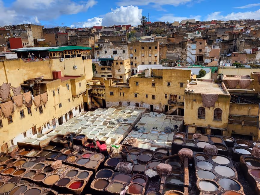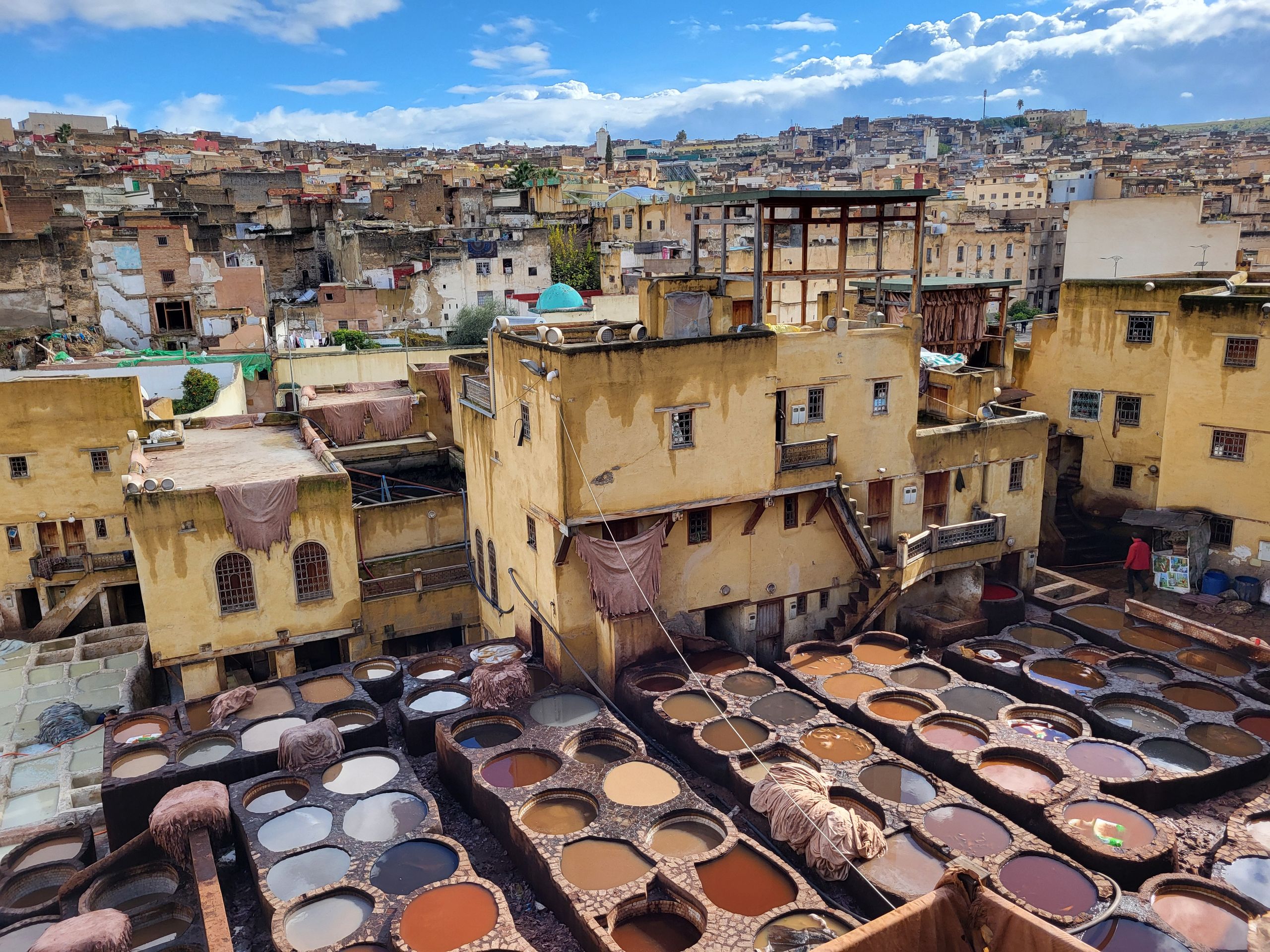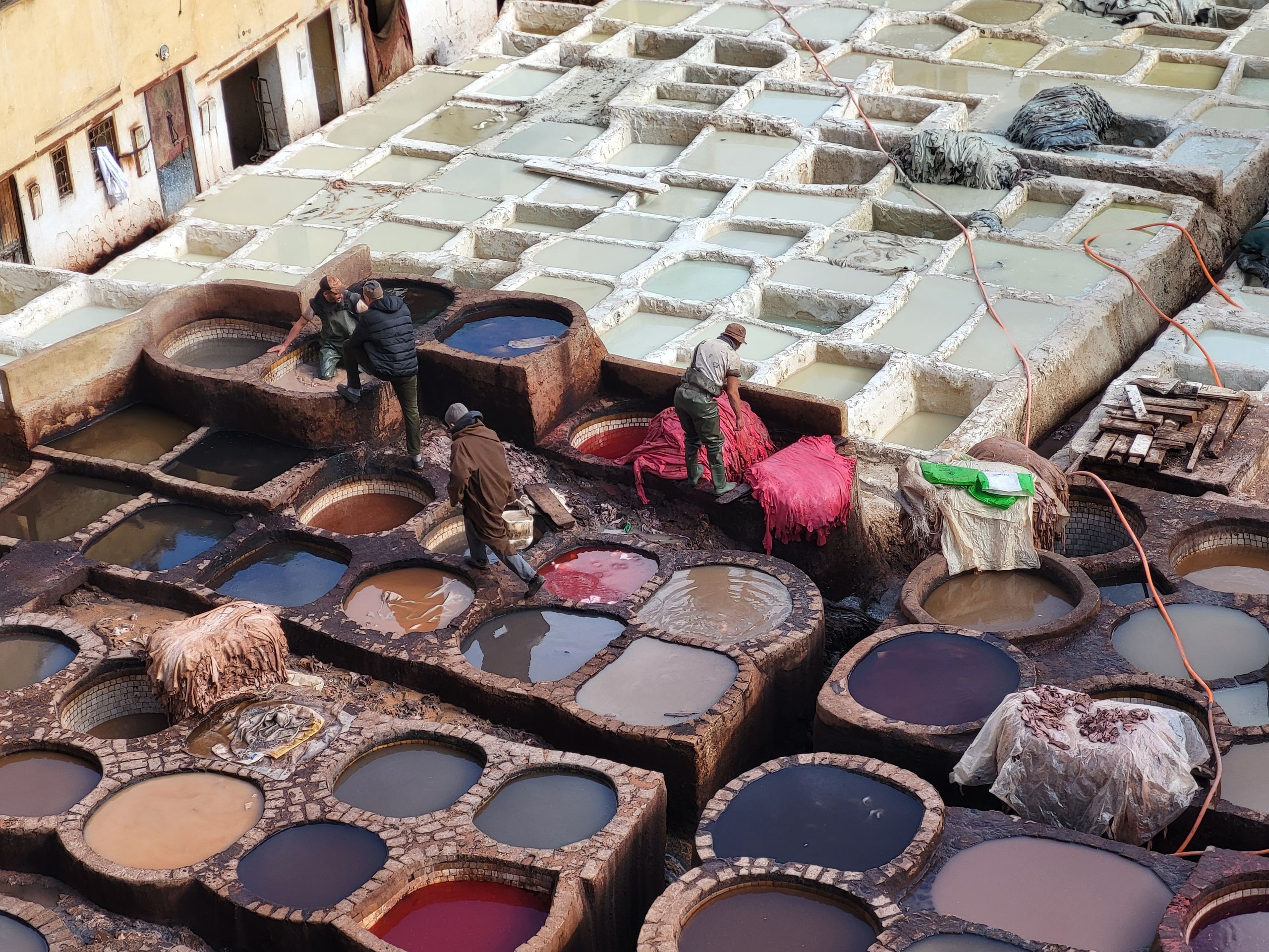Gerber und Färber Wir blickten auf die Becken von einer Aussichtsterasse herunter und waren angesichts des unangenehmen Geruchs froh über den Abstand.