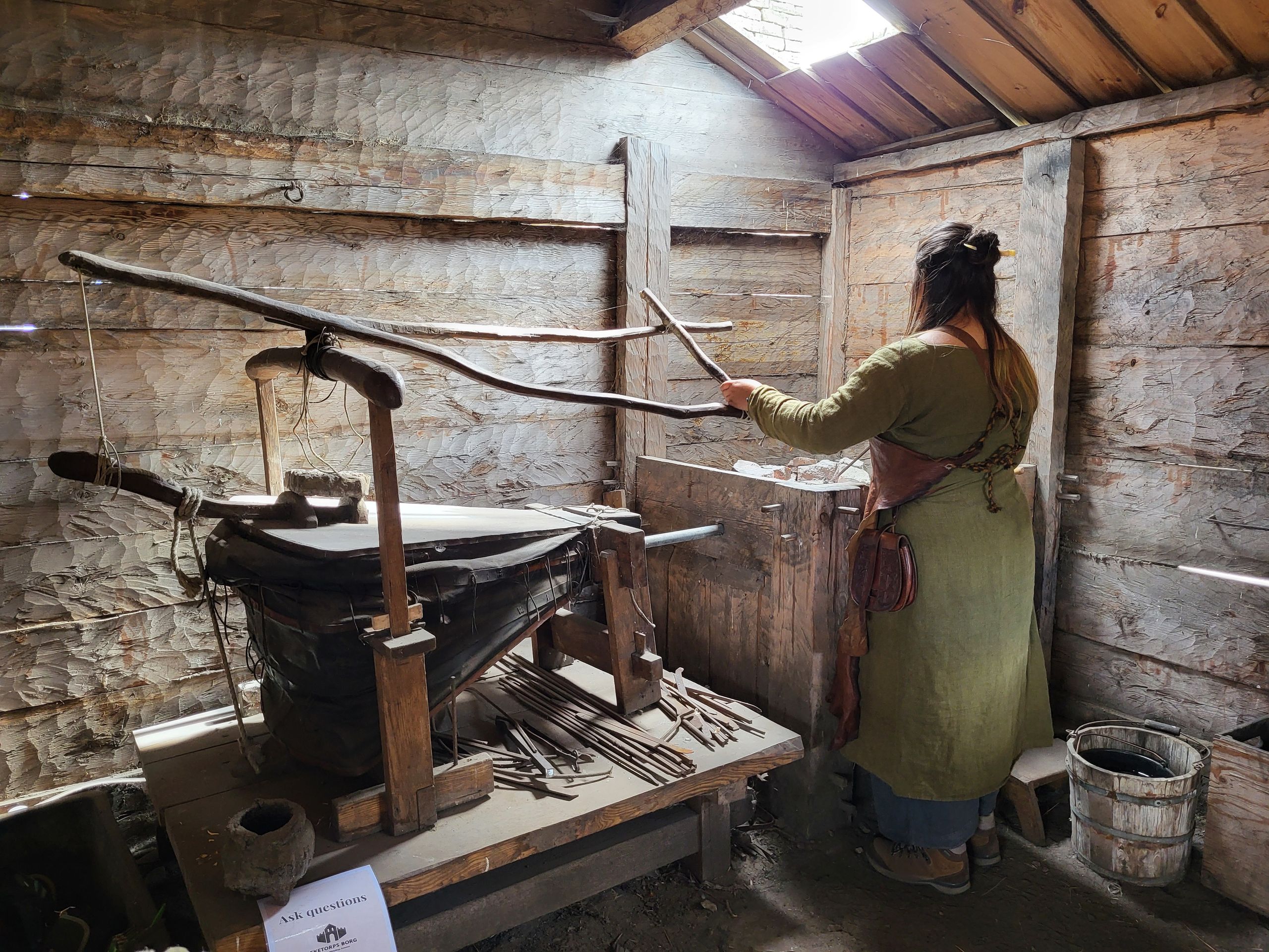 Burg Eketorp Es gab auch Mitarbeiterinnen in historischen Gewändern, die zum Beispiel das Brotbacken oder Schmieden wie in der Zeit der Festung vorführten. Schmiedin Burg Eketorp