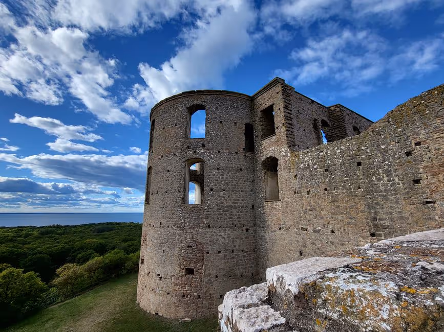 Burganlage Bårby borg Unser erster Stopp auf dem Weg war die frühere Burganlage Bårby borg, deren Befestigungsmauern im Halbkreis an einer Klippe gebaut wurden.