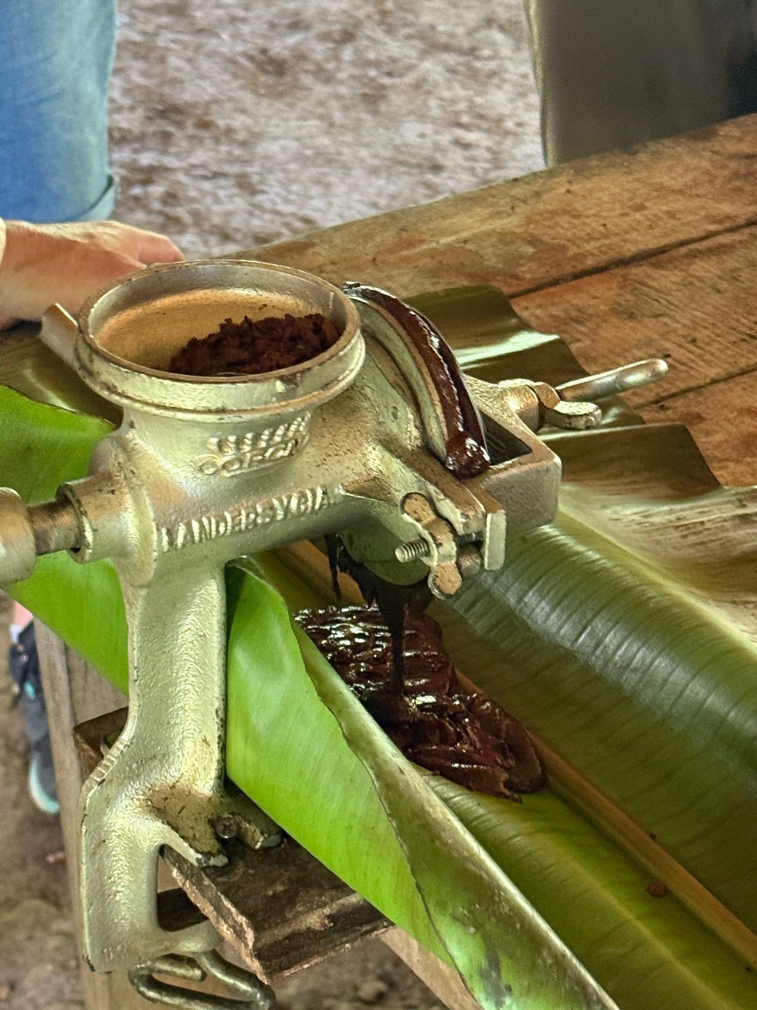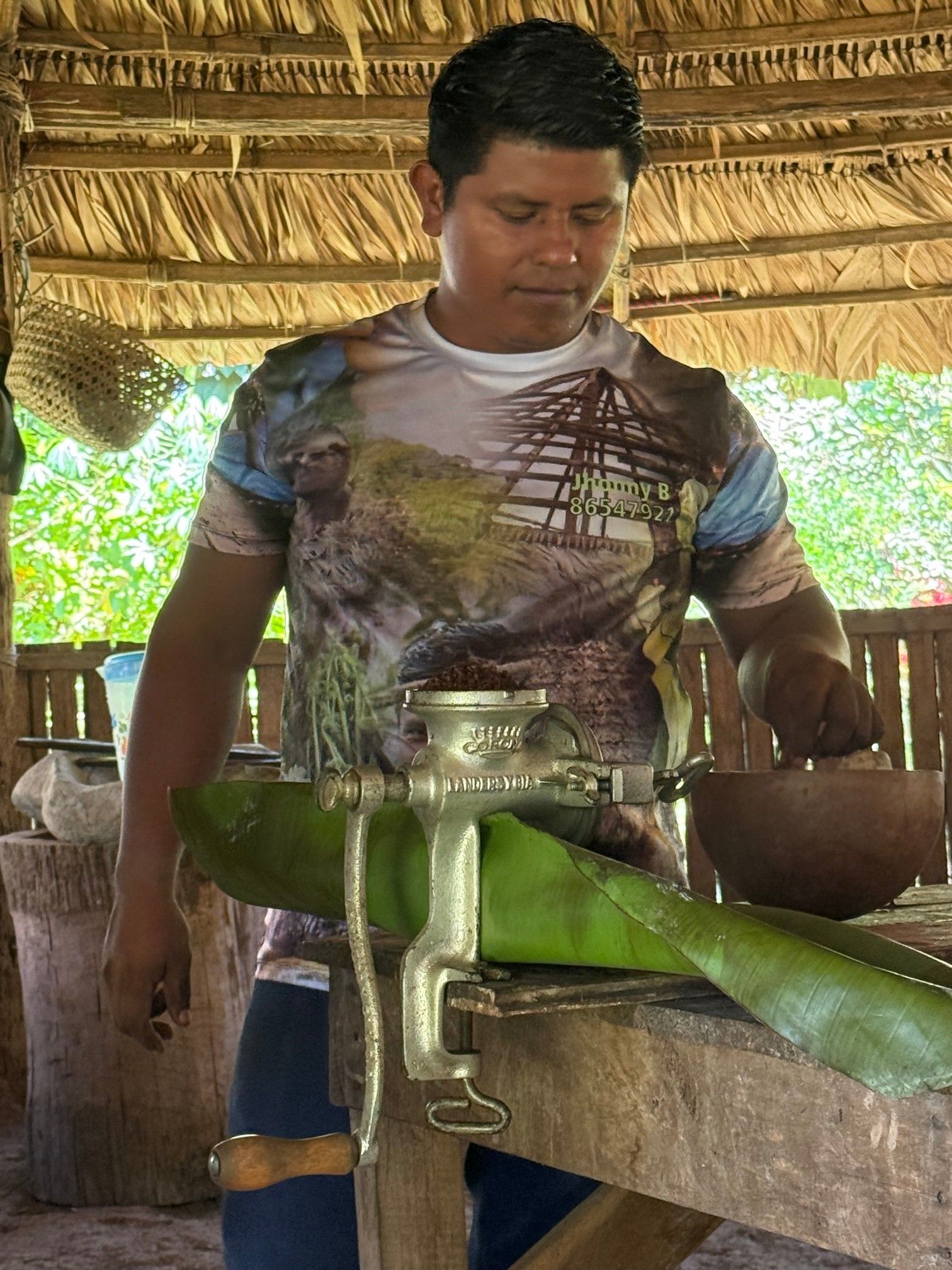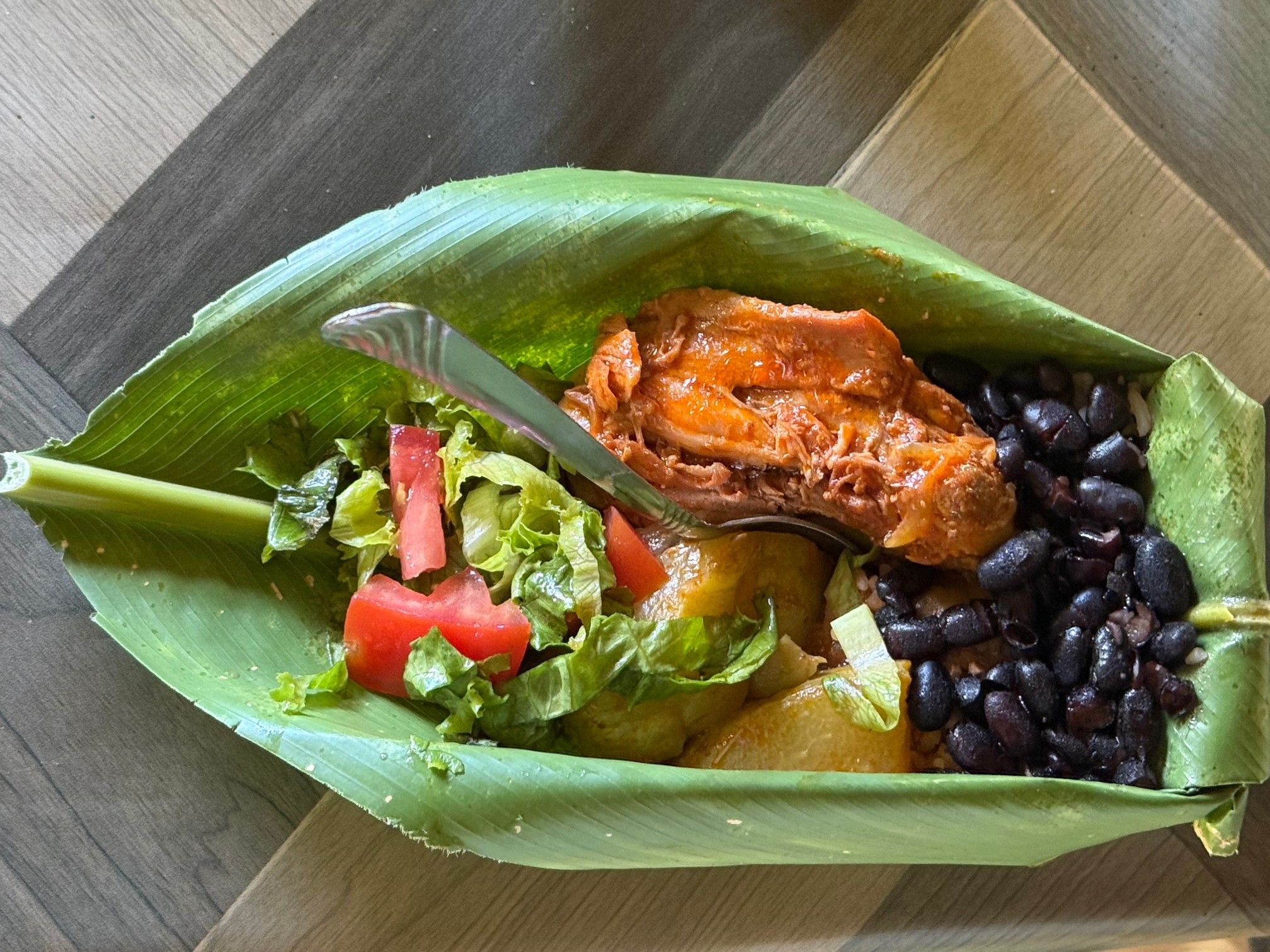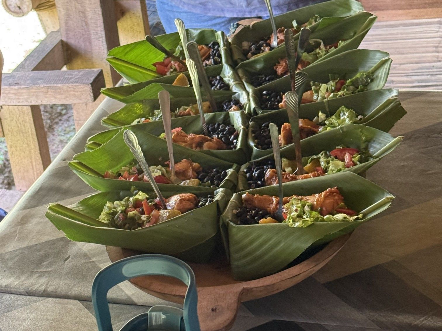 Bald werden wir mit einem auf Bananenblättern servierten Mittagsmahl aus Huhn, Bohnen und Gemüse gestärkt.