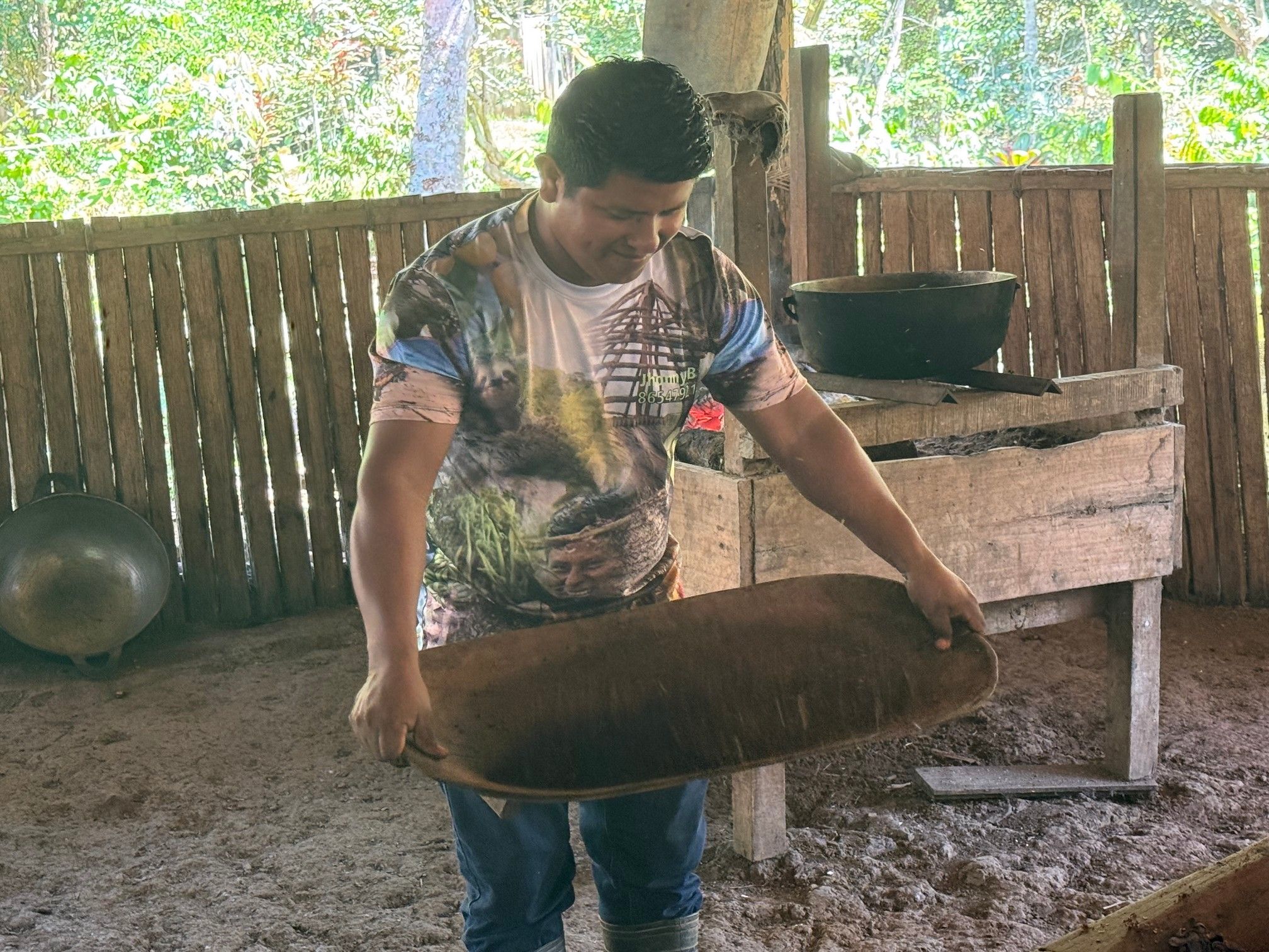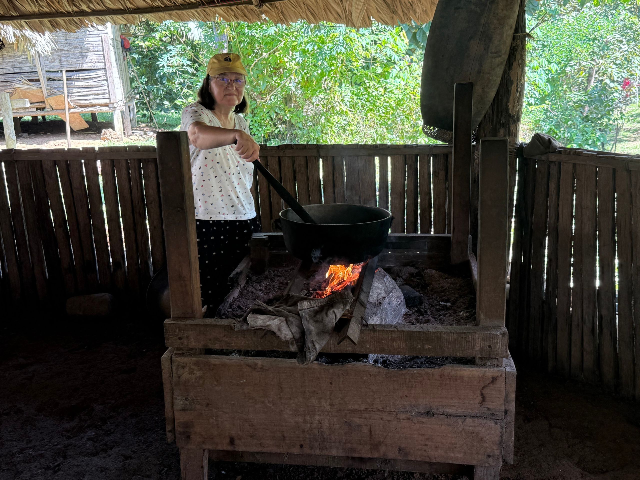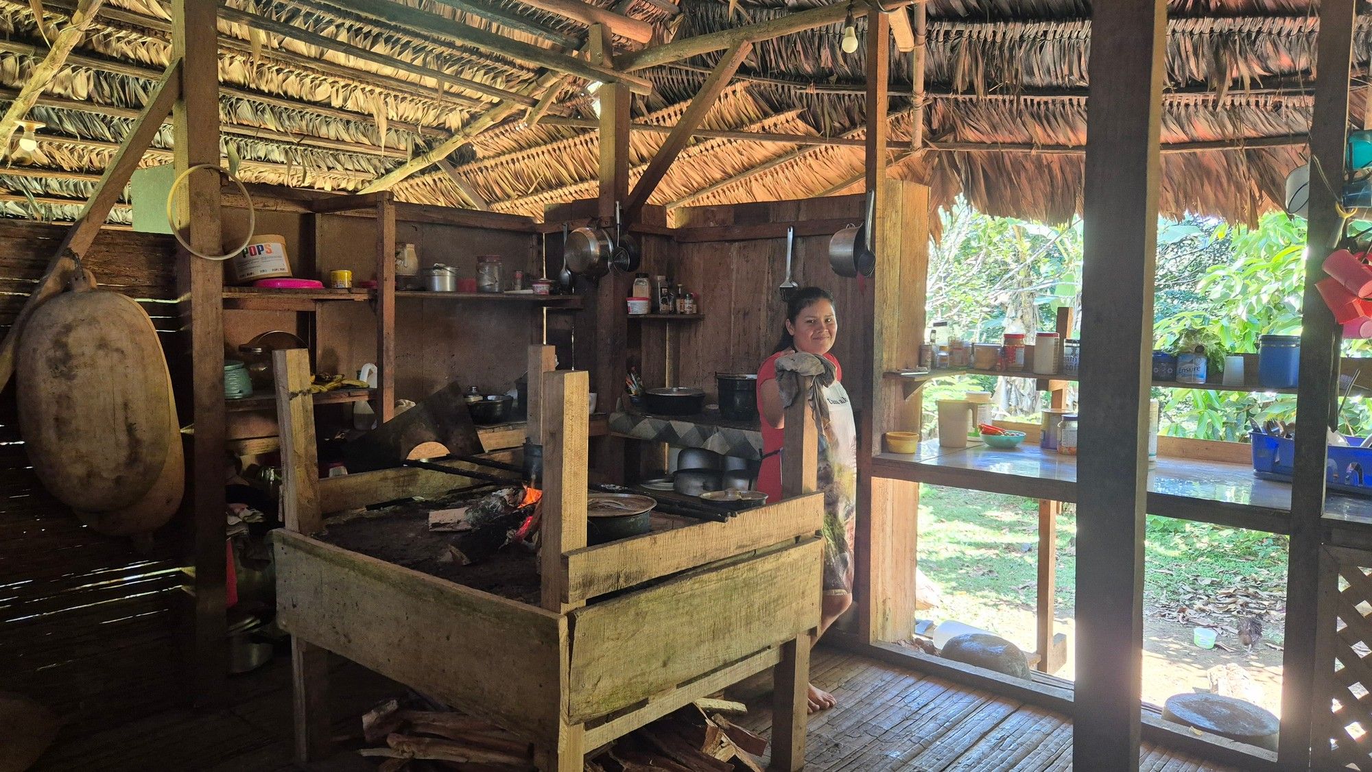 Wir besuchen die Küche, die Feuerstellen befinden sich auf hölzernen Gestellen mit einer dicken Erdauflage. Die Küche ist stark verraucht, da es keinen Kamin gibt – dies aber mit Absicht: der Rauch hält Schädlinge vom Haus und vor allem dem mit Palmblättern gedeckten Dach fern.