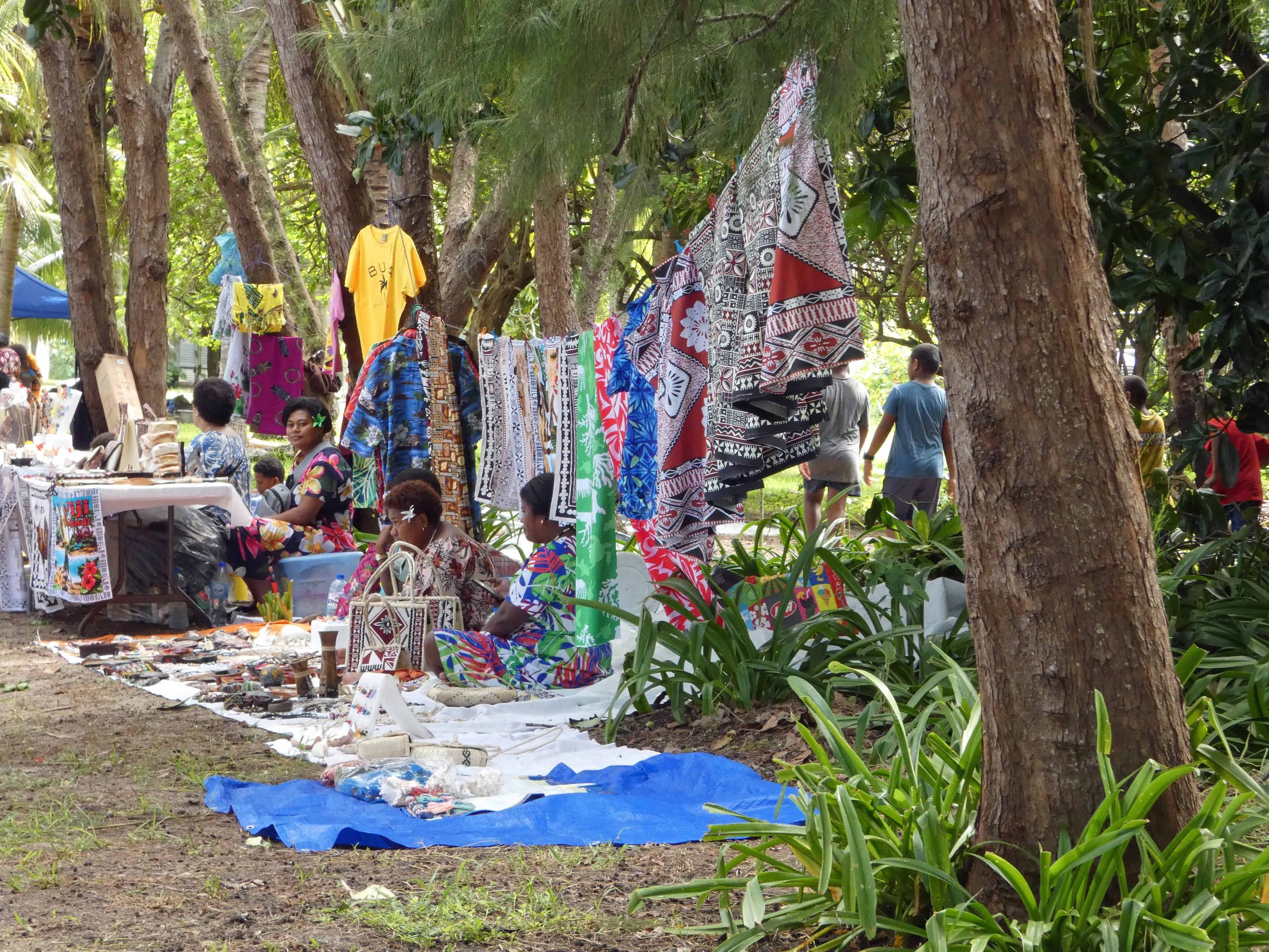 Wir wurden durch das Dorf Yasawa-i-Rara geführt und es wurden viele Verkaufsstände aufgebaut. Alles was aus Stoff ist kommt aus China oder Indien. Viele der wirklich lokal hergestellten Souvenirs sollte man nicht kaufen, weil sie aus geschützten Muscheln, Fischzähnen oder Holzarten gemacht sind und man die allenfalls auch nicht durch den Zoll bekommt. Die geflochtenen Sachen sind dann nicht so richtig brauchbar und recht teuer.
