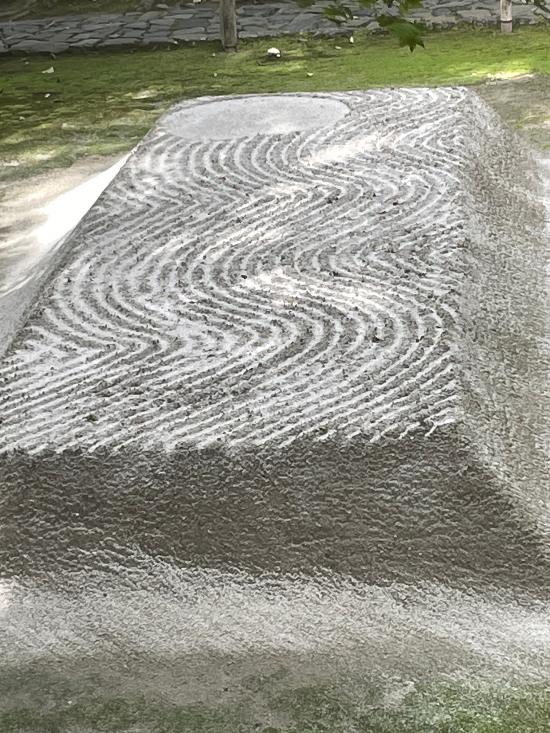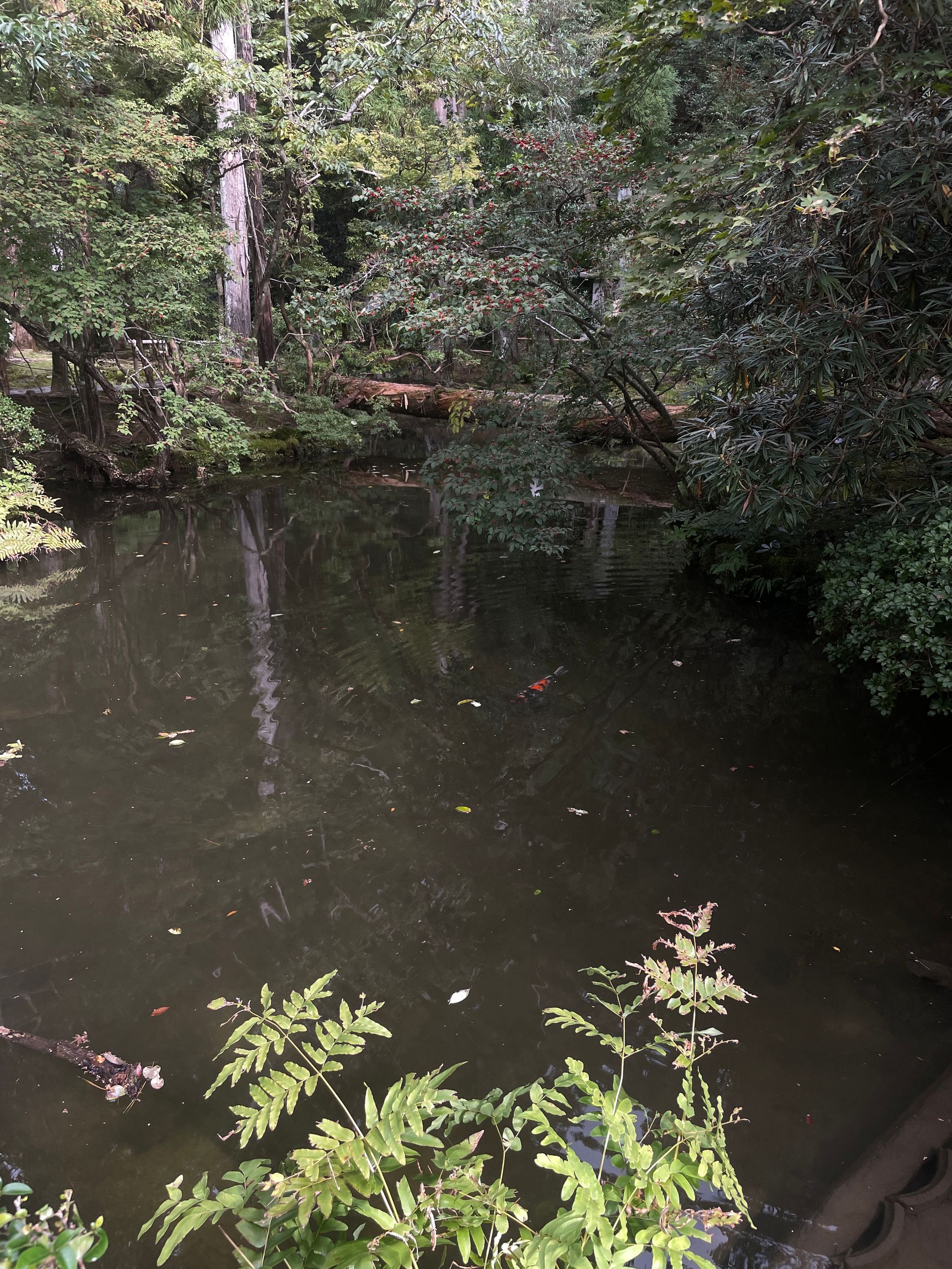 Dafür habe ich endlich zufällig einen anderen verwunschenen Tempel wiederentdeckt, den ich bei meinem letzten Besuch partout nicht wiederfinden konnte, weil ich den Namen vergessen hatte: den Honen In, umgeben von einem dunklen Park am Berg, schwarze Wasser mit riesigen rot-orangen Goldfischen (Koi?), Steinlaternen, Zen-Sandskulpturen, verschiedenen Moosen und Gebäuden aus uraltem Holz.