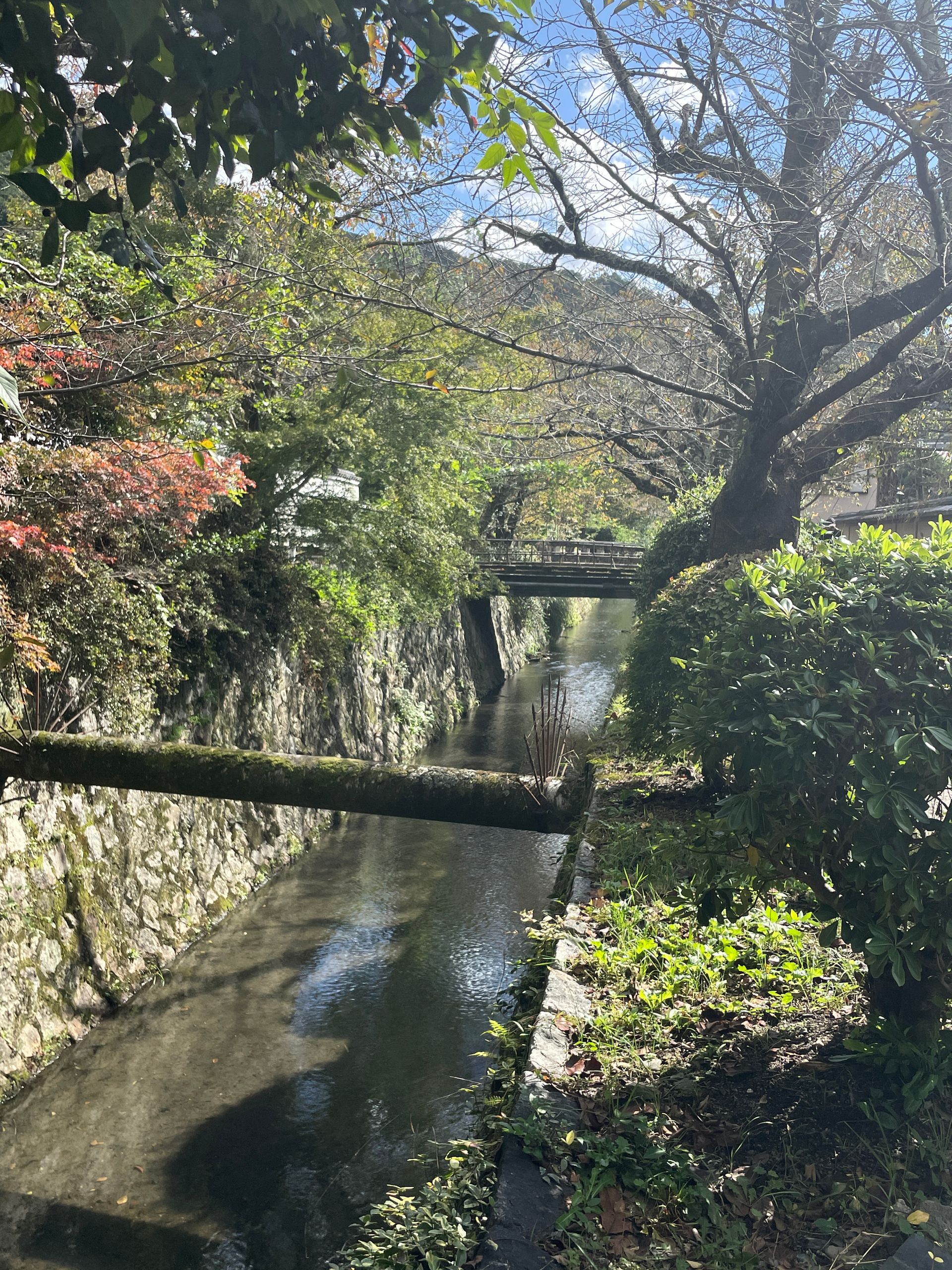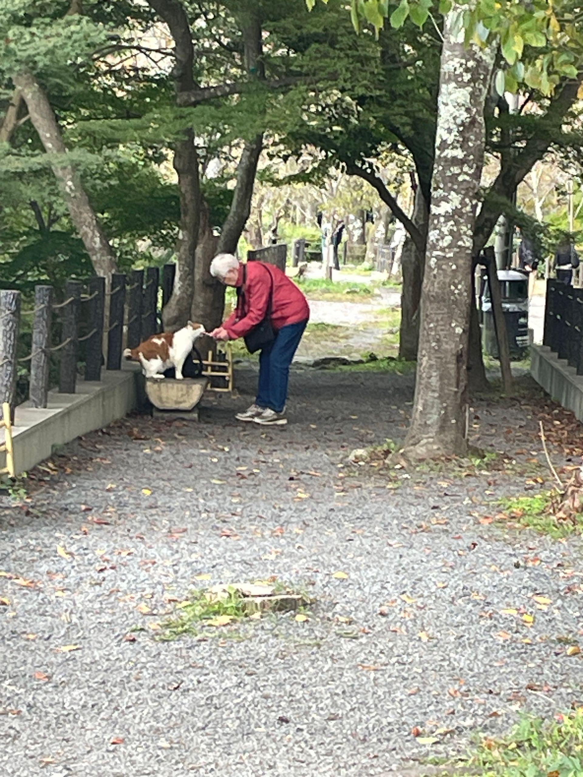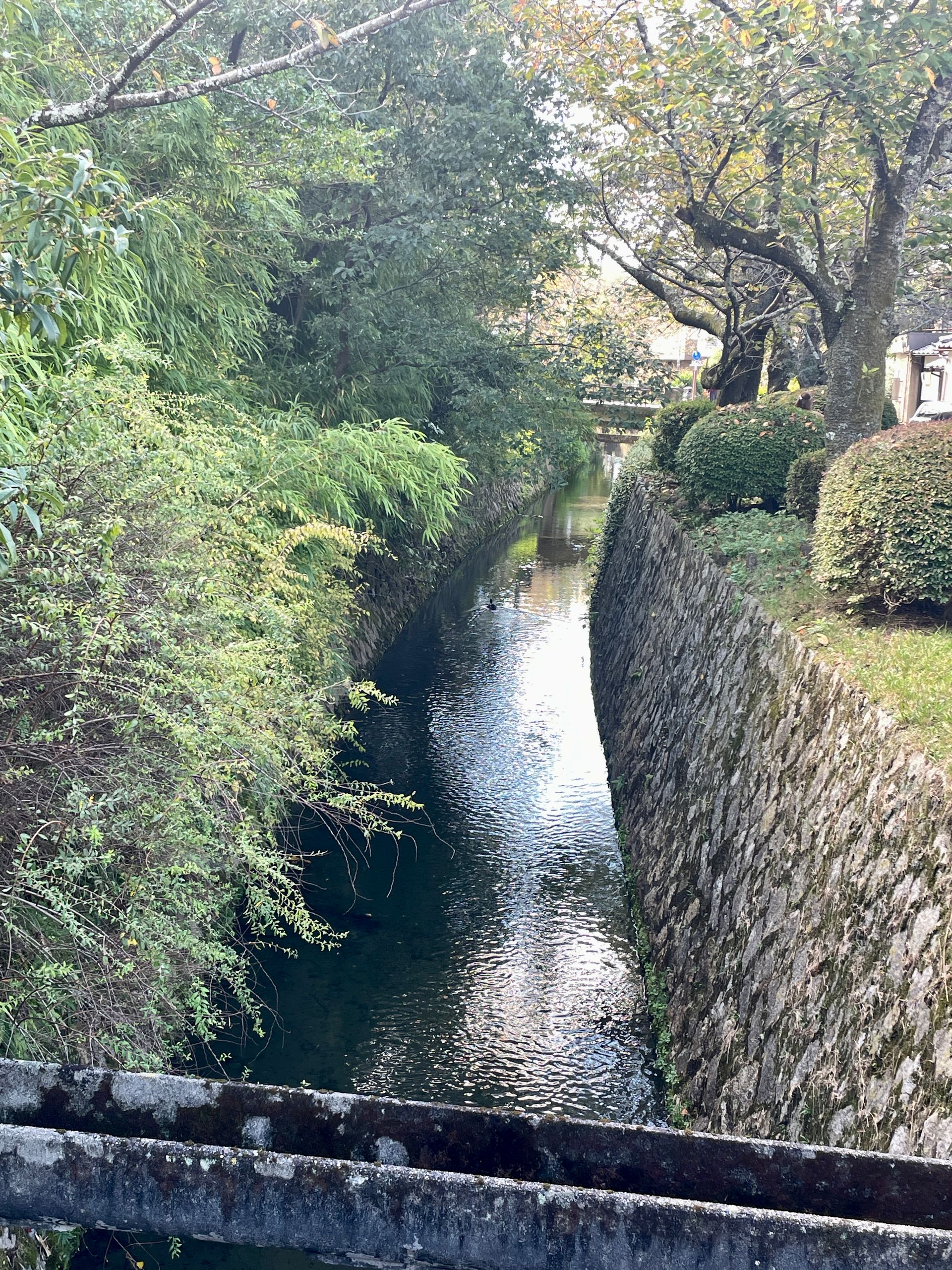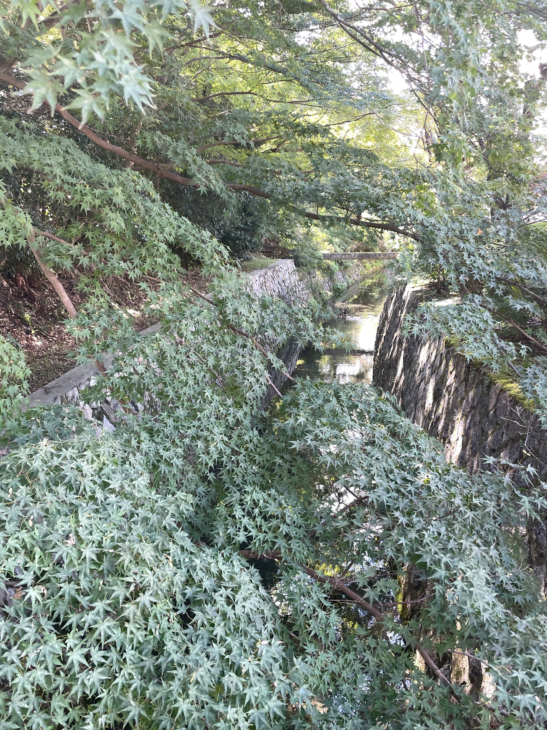Also gleich nach dem Frühstück mit einem mit Thunfisch gefüllten Onigiri (das ist eine Art dreieckiger Reisball, der mit einem Nori-Algenblatt umwickelt und als Snack gegessen wird) und einer riesigen weichen Bämme, die Melonpan heißt, habe ich mich aufgemacht zum Philosophenpfad, einem der schönsten und märchenhaftesten Orte, die ich in meinem Leben gesehen habe. Ein Kanal mit flachem schnell fließenden glasklaren Wasser mit großen Fischen drin und Enten oben drauf schlängelt sich dahin zwischen alten Ufern voller Kirschbäume, japanischem Ahorn und Rhododendron, Steinbänke, auf denen ich ganze Tage verbringen könnte (und vermutlich werde), alte Maler sitzen zeichnend auf einer der zahlreichen Brücken, jemand spielt leise Musik auf einer Klangtrommel, mit dickem Moos bewachsene Metallrohre liegen zwischen den Ufermauern, mit großen Stachelkronen geschützt, damit keiner auf die Idee kommt, da rüberzubalancieren, Vögel singen trotz fortgeschrittenem Oktober, bunte Schmetterlinge fliegen zwischen den Kamelienblüten umher und riesige Wespen, vielleicht sogar Hornissen, versuchen noch etwas Blütenstaub aus den Rosen zu saugen. Hinter dem Fußweg stehen traumhafte alte dunkelbraune Holzhäuser mit dicken Keramikdächern und unzähligen Winkeln und Ecken. An einer Stelle sammeln sich die streunenden Katzen, denen alle eine Zacke im Ohr fehlt (manchen fehlt auch der halbe Schwanz), was ein Zeichen dafür ist, das Tierfreunde sie eingefangen und sterilisiert haben. Die Katzen sind alle gut genährt und ganz zahm, weil jeden Tag Menschen dort vorbeikommen und ihnen etwas zu fressen mitbringen. Auch ein sauberer Napf Wasser steht dort immer. Eine Dame mit großer Kamera, die dort anscheinend eine regelmäßige Besucherin ist, und ich haben ausgiebig gestreichelt.