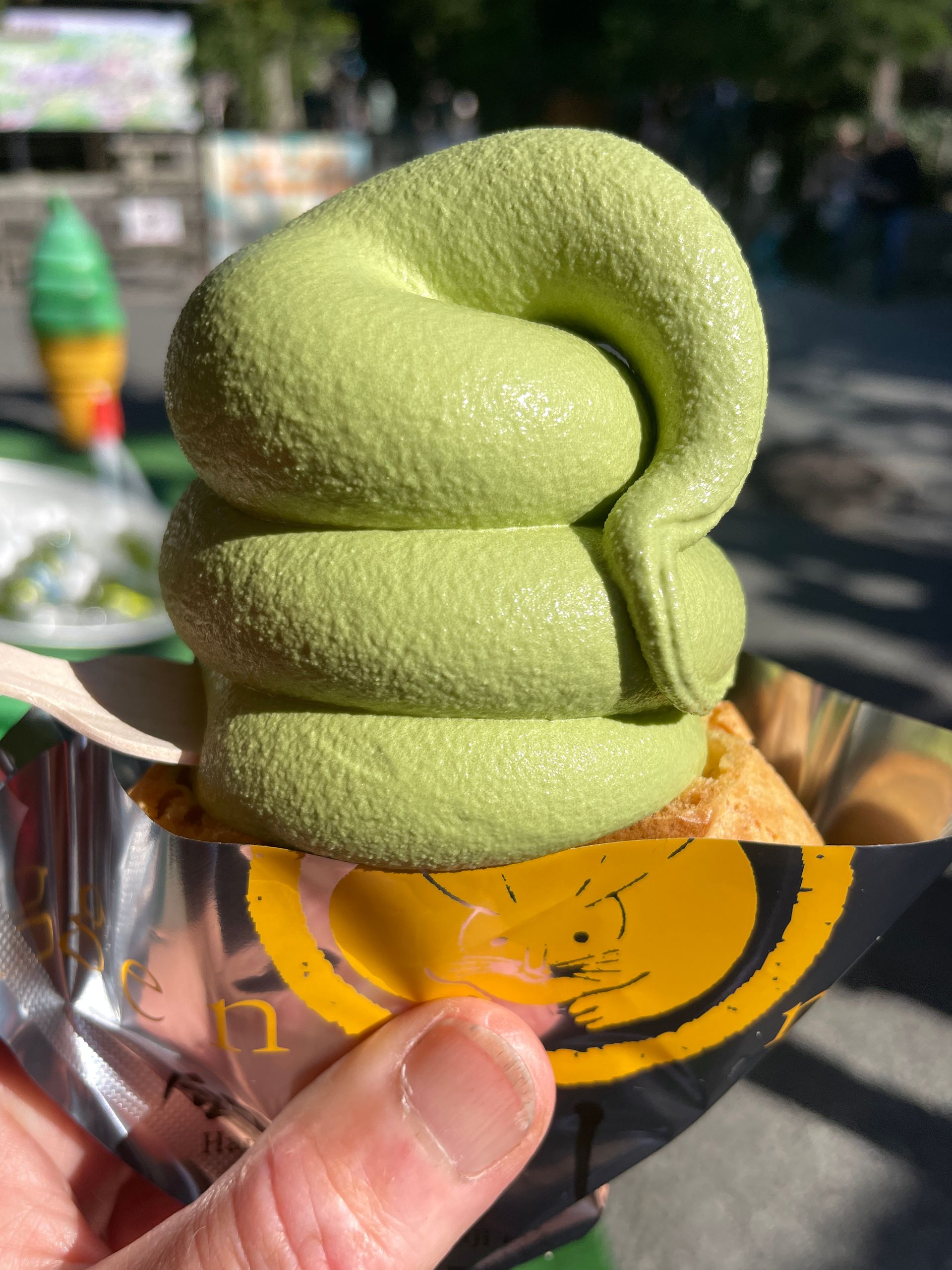 Nach diesem herrlichen langen Spaziergang brauchte ich eine Stärkung und speiste ein riesiges grünes Matcha-Eis in einem Teigbecher, der auch noch mit Matcha-Creme dick gefüllt war!
