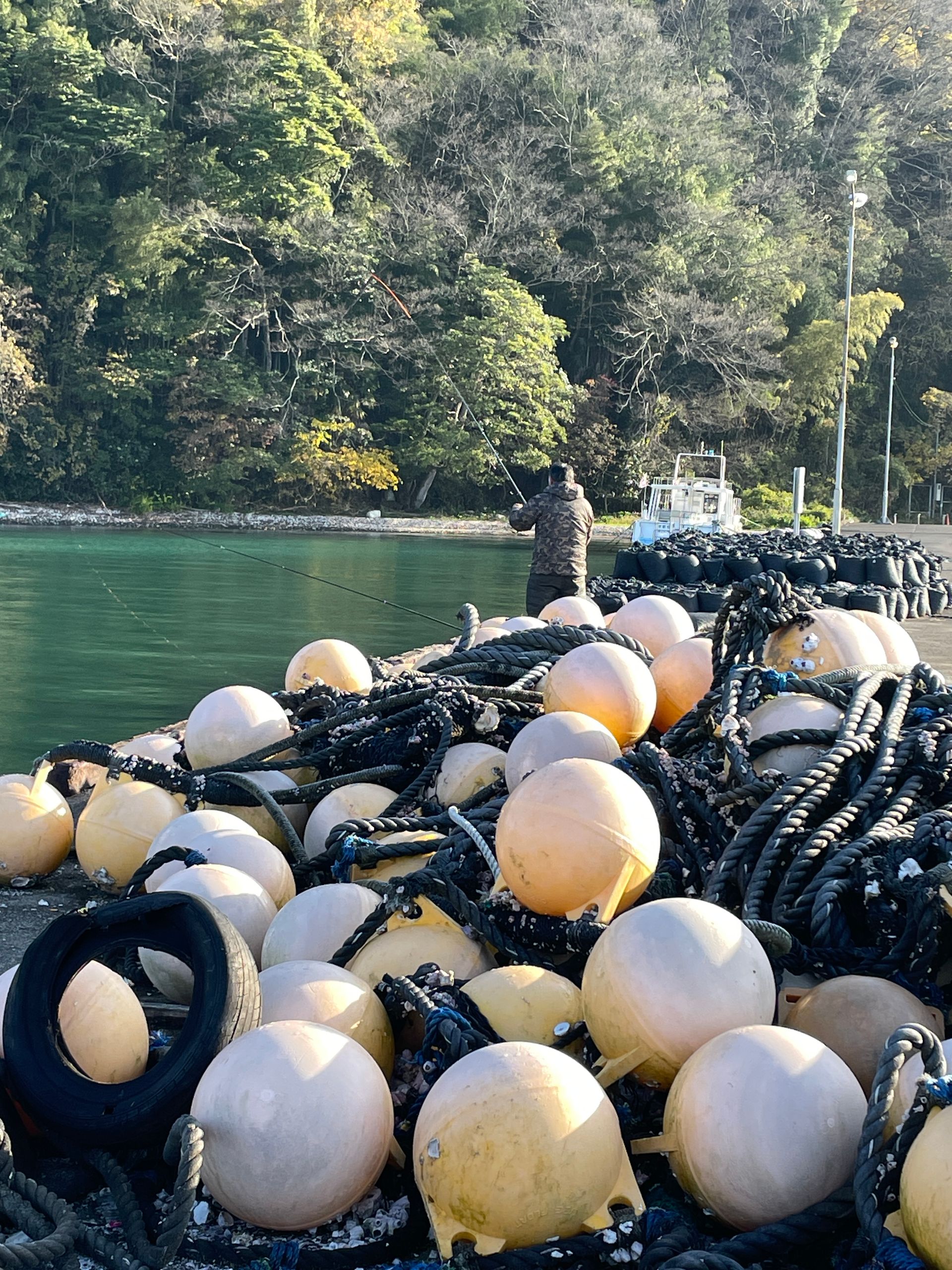Auf dem Quai stehen einige Angler, Zigarette im Mund („Surabaya-Johnny…“), und bemühen sich, etwas Beute zu machen, wie ich sehen kann, mit sehr mäßigem Erfolg und klitzekleinen Fischchen. Als Köder benutzen sie ein Art Paste, die sie in ein Körbchen schmieren. Darüber ist dann die Angelschnur befestigt mit mehreren Haken übereinander, immer etwa 30cm entfernt vom nächsten. Sie amüsieren sich darüber, dass mich das interessiert.