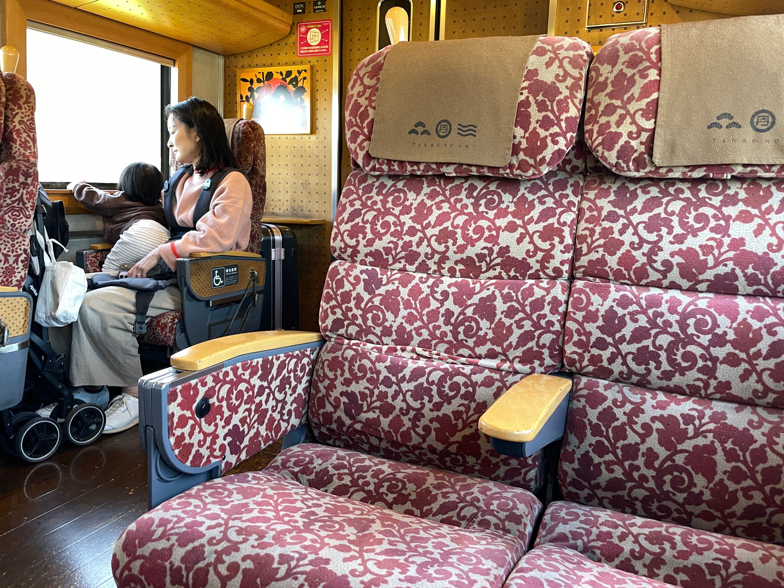 Als ich um halb elf immer noch kein Café gefunden habe, beschließe ich, den Berg Berg sein zu lassen. Ich hatte vorgehabt, mir ein Taxi zu suchen, dass mich bis beinahe auf den Gipfel, wo der Aussichtsturm steht, gebracht hätte, aber die Aussicht, dann von da oben etwa eine Stunde durch unbekanntes Gelände wieder absteigen zu müssen, vor allem bei der augenblicklichen Bärenhysterie in Japan, lässt mich zu der Einsicht gelangen, dass selbst meine Energie irgendwann mal ein Ende hat, und so springe ich erleichtert in den nächsten Zug nach Kyoto. (In den Zügen ist übrigens toll, dass man mit einem Tritt auf ein Pedal jede Sitzbank ganz umdrehen kann, so dass man immer in die Richtung fährt, in die man gucken möchte)
