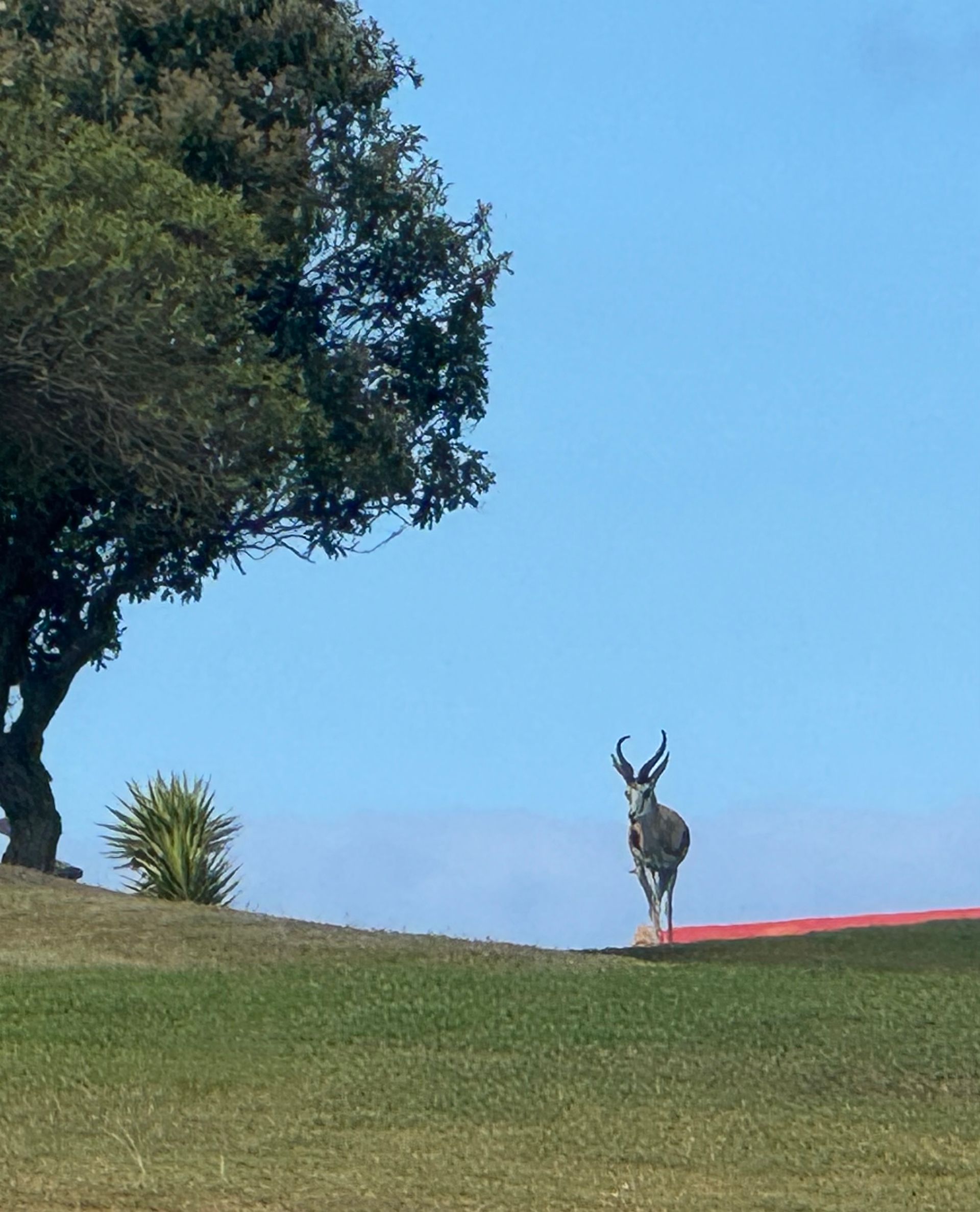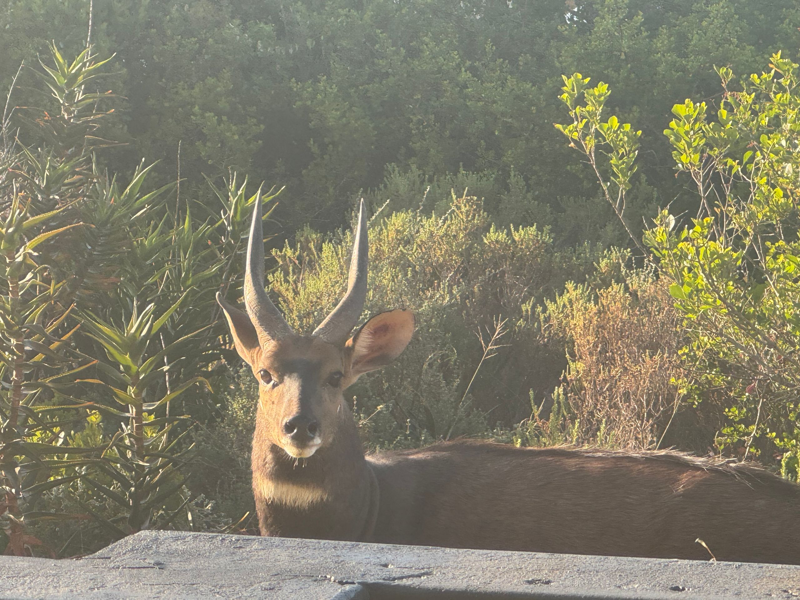 Am nächsten Morgen um 6:30 Uhr treffe ich auf einen Springbock der genauso erschrocken schaut wie ich. Direkt an unserer Terrasse schaut er über die Mauer.