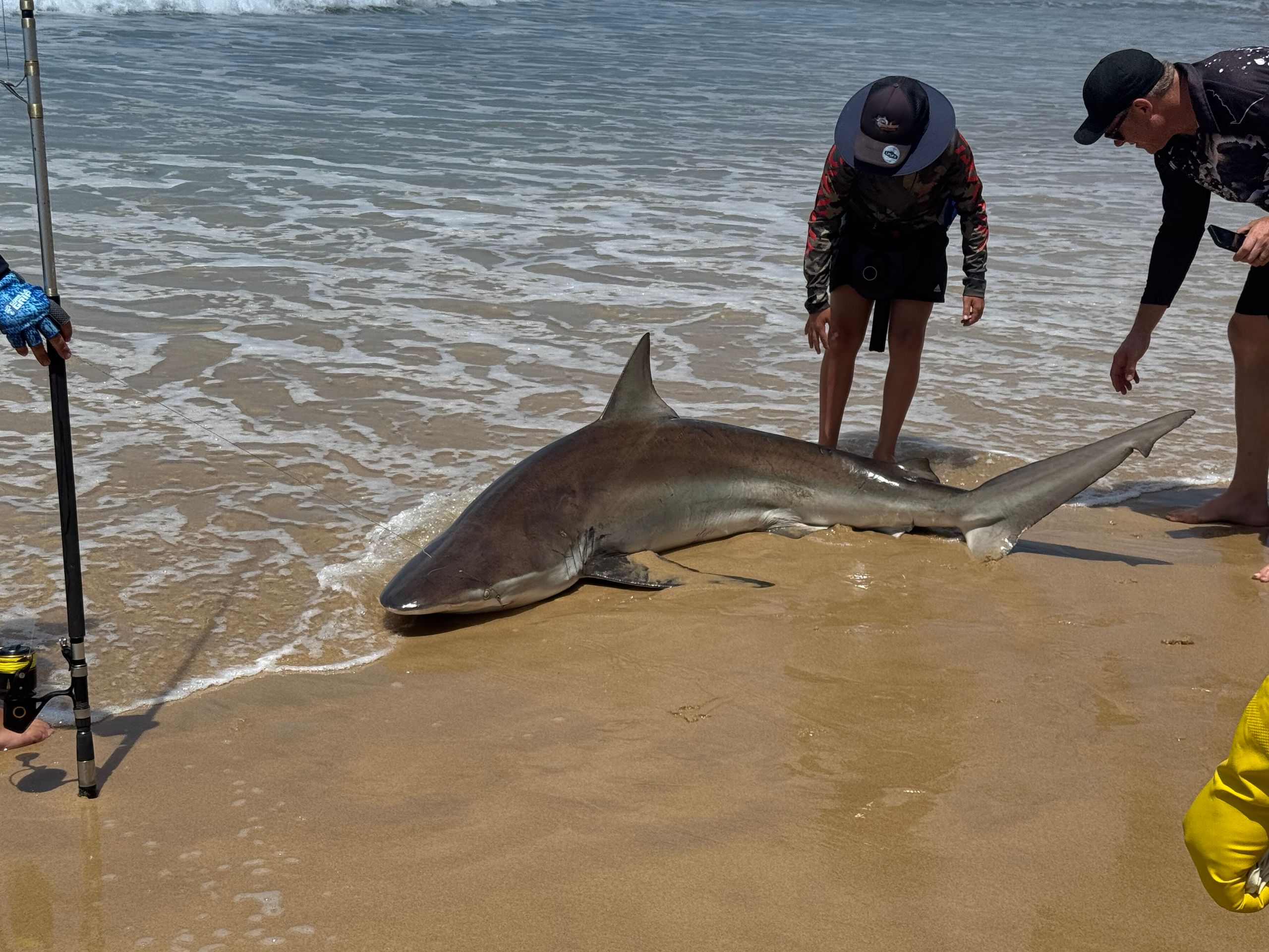 Wir beobachten Angler dabei wie sie versuchen einen Fisch aus dem Wasser zu ziehen. Das dauert über eine Stunde und am Schluss wissen wir auch warum. Sie haben einen Hai an der Angel.