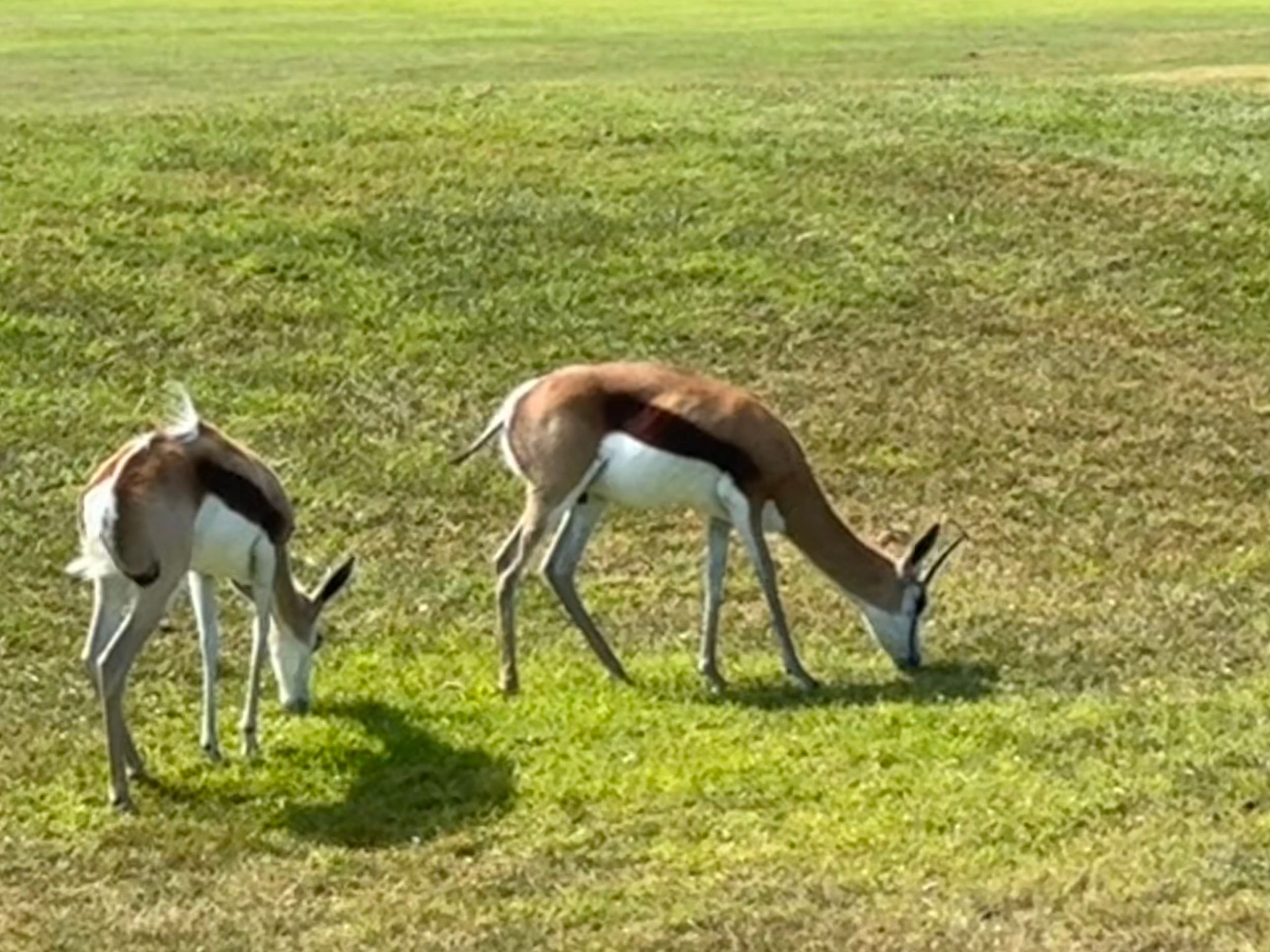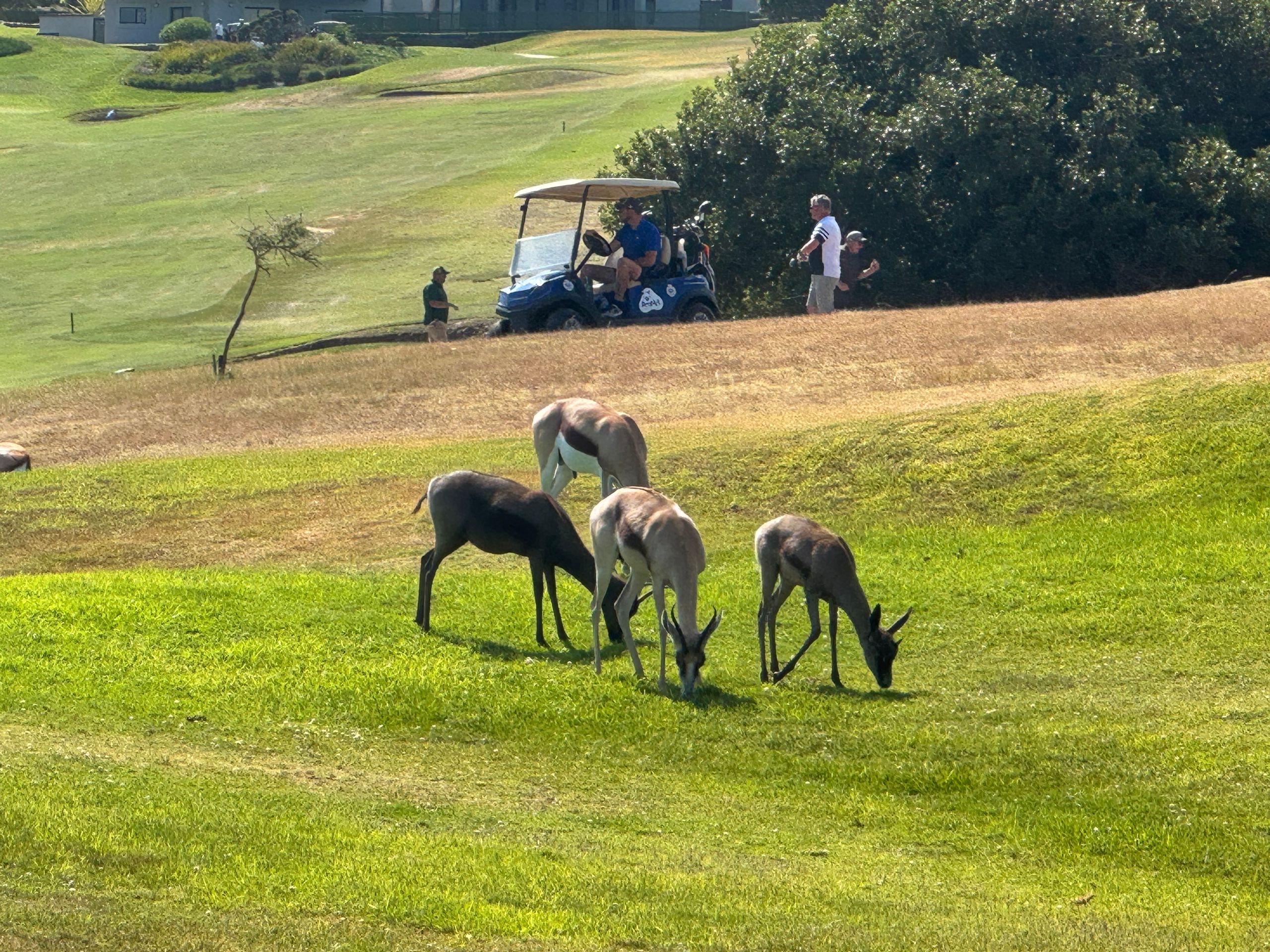 2 junge Südafrikaner spielen mit uns. Der Platz ist wunderschön und auf den Grüns stehen schon mal Springböcke.